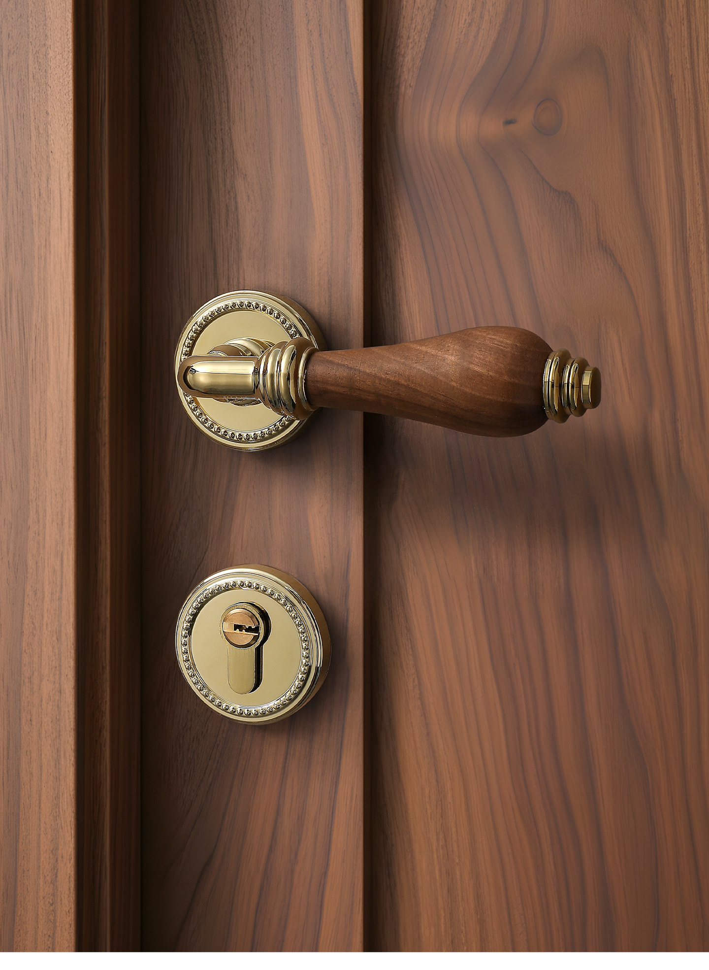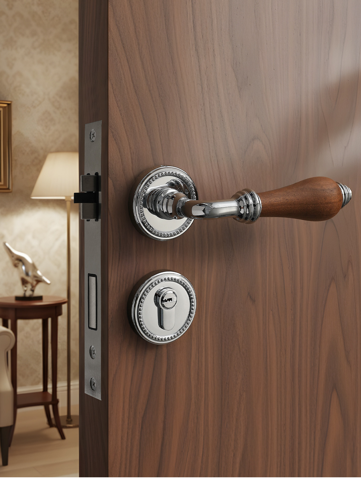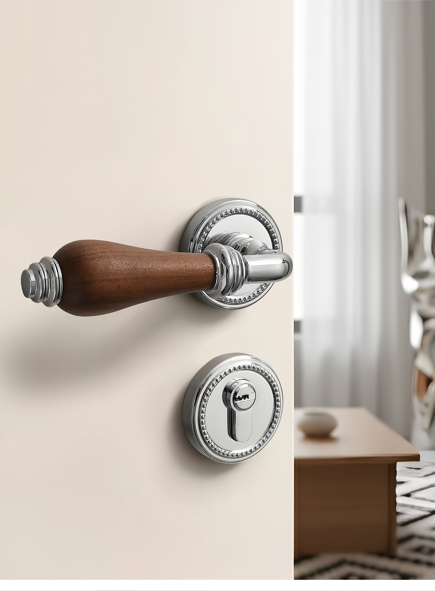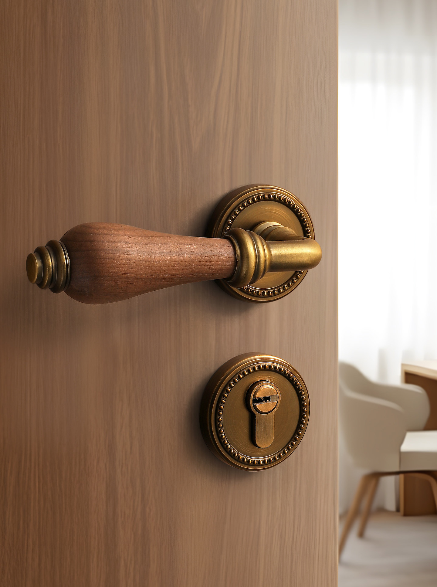 French-Style Vintage Yellow Bronze Bedroom Door Lock, Antique-Style Household Indoor Walnut Door Lock Handle