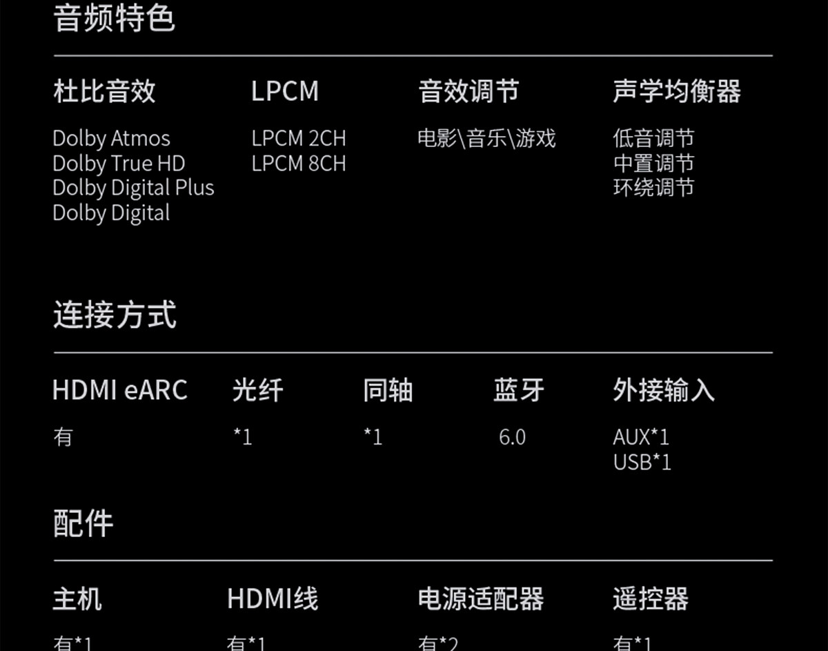 | Interface Type | Bluetooth,HDMI,USB,Fiber Optic,AUX |