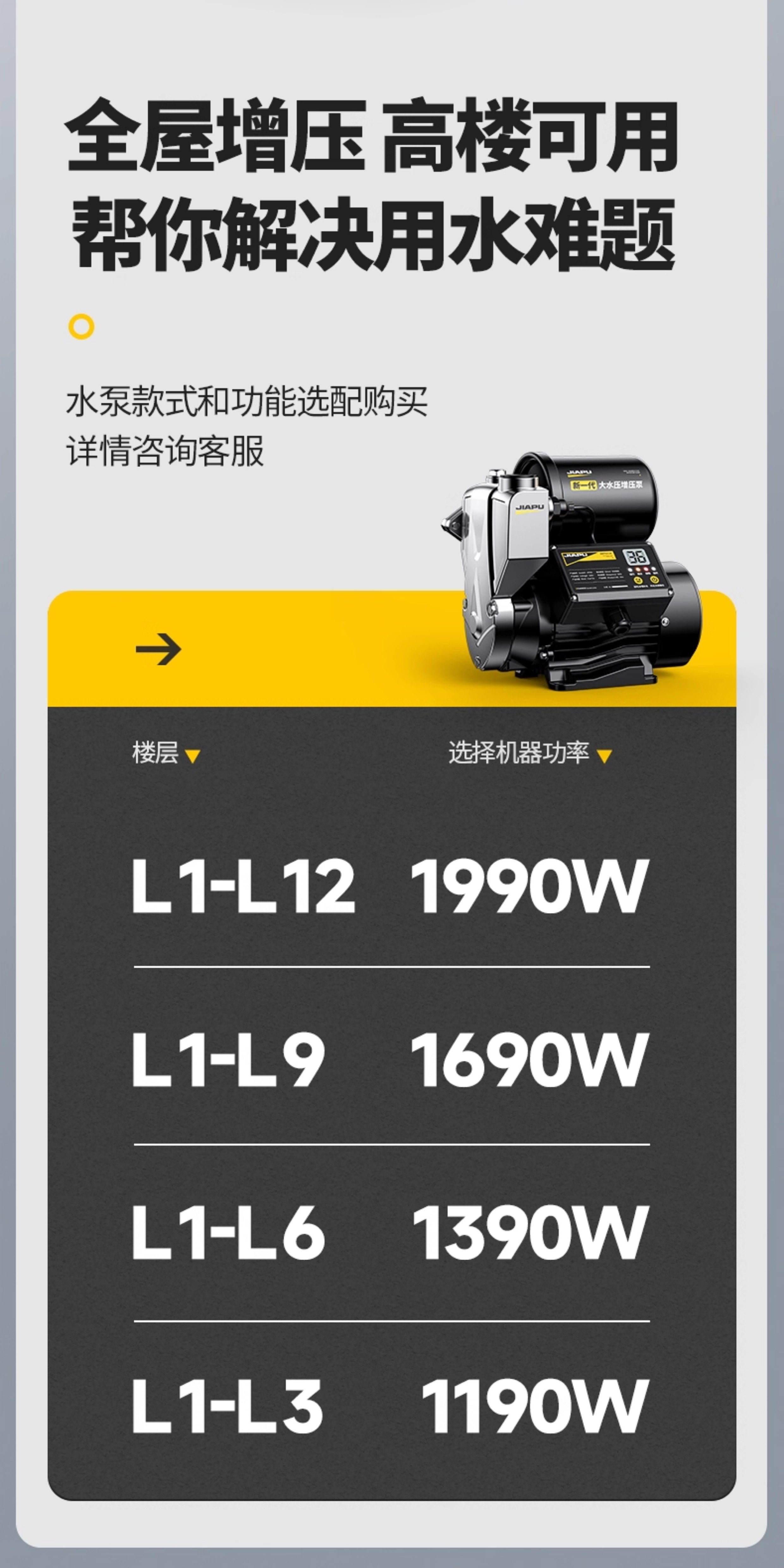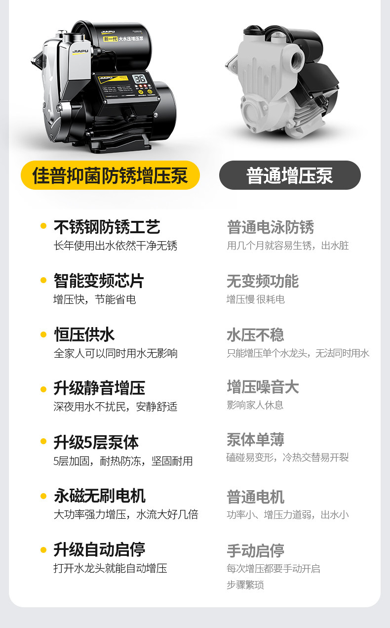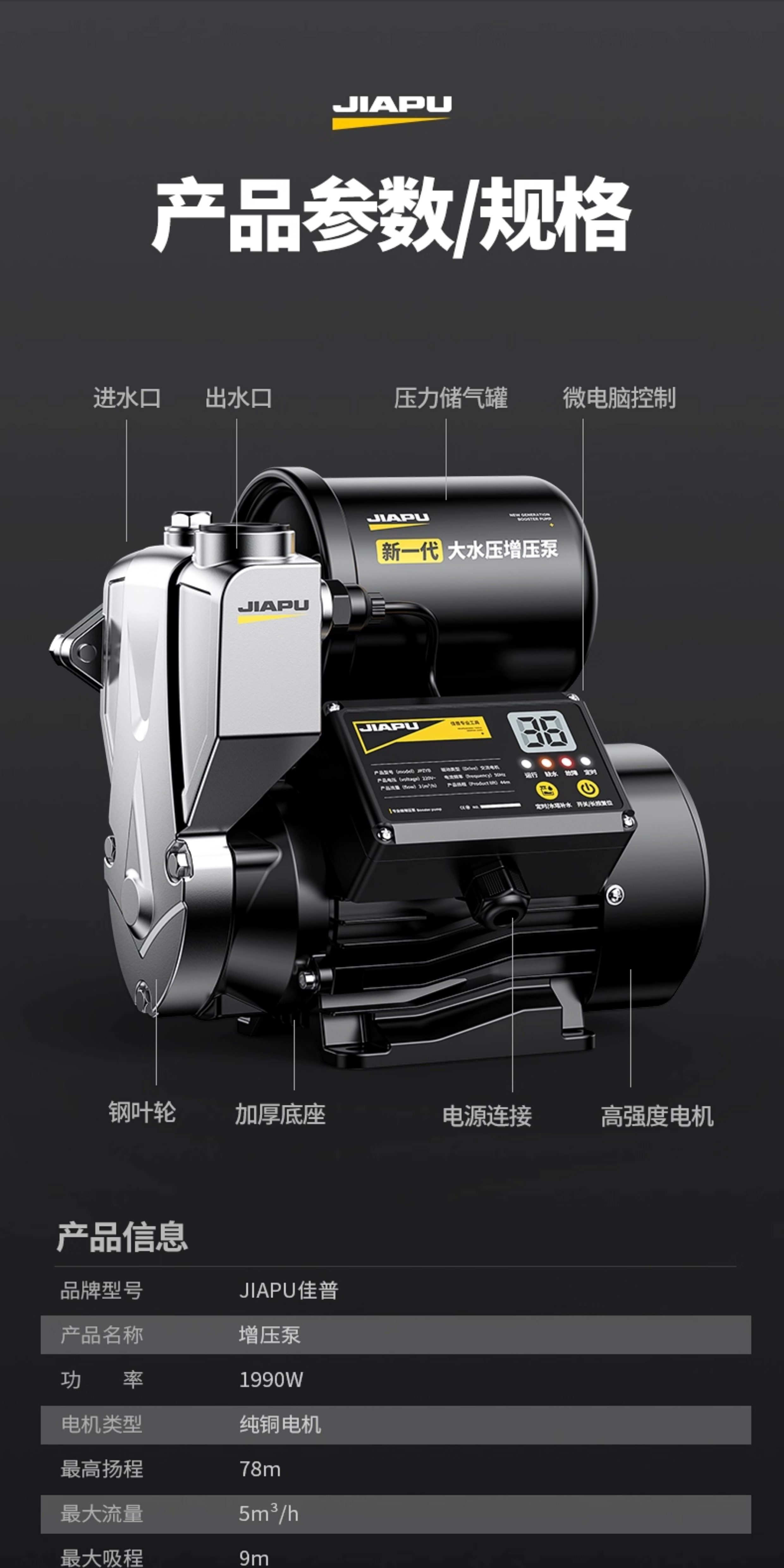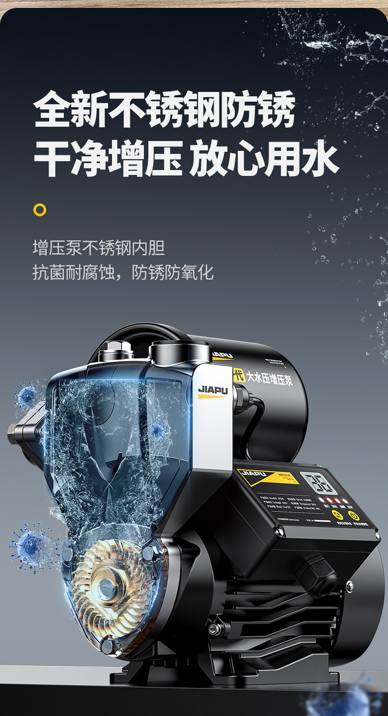 | Color Classification | Five-Layer Thickened 304 Stainless Steel Pump Body, Freeze-Resistant and Rust-Proof, Meticulously Crafted with Care, Never Compromised,Redefining the Booster Pump,Big Water Flow,More Power Saving,Save up the Cost of a Machine in Half a Year,You Get What You Pay for – Quality You Can Trust. Jiapu, Crafted with Dedication, Always by Your Side,Price War,Japu Is Defeated,Win the Battle of Quality,Jia Pu Sweeps the Entire Network,890W Permanent Magnet Frequency Conversion[Five Layers of Extra Thick Stainless Steel]Ai Intelligent Voltage Regulation + Water Purification + Constant Temperature and Pressure,990W Permanent Magnet Frequency Conversion[Five Layers of Extra Thick Stainless Steel]Ai Intelligent Voltage Regulation + Water Purification + Constant Temperature and Pressure,1190W Permanent Magnet Frequency Conversion[Five Layers of Extra Thick Stainless Steel]Ai Intelligent Voltage Regulation + Water Purification + Constant Temperature and Pressure,1390W Permanent Magnet Frequency Conversion[Five Layers of Extra Thick Stainless Steel]Ai Intelligent Voltage Regulation + Water Purification + Constant Temperature and Pressure,1590W Permanent Magnet Frequency Conversion[Five Layers of Extra Thick Stainless Steel]Ai Intelligent Voltage Regulation + Water Purification + Constant Temperature and Pressure,1790W Permanent Magnet Frequency Conversion[Five Layers of Extra Thick Stainless Steel]Ai Intelligent Voltage Regulation + Water Purification + Constant Temperature and Pressure,990W Lcd Digital[Antifreeze Digital Display Timer/Five Layers of Extra Thick Stainless Steel]Visual Water Pressure Adjustment + Water Purification + Constant Temperature and Pressure,1190W Lcd Digital[Five-Layer Extra Thick Stainless Steel/Antifreeze Digital Display Timing]Visual Water Pressure Adjustment + Water Purification + Constant Temperature and Pressure,1390W Lcd Digital[Five-Layer Extra Thick Stainless Steel/Antifreeze Digital Display Timing]Visual Water Pressure Adjustment + Water Purification + Constant Temperature and Pressure,1590W Lcd Digital[Five-Layer Extra Thick Stainless Steel/Antifreeze Digital Display Timing]Visual Water Pressure Adjustment + Water Purification + Constant Temperature and Pressure,1790W Lcd Digital[Five-Layer Extra Thick Stainless Steel/Antifreeze Digital Display Timing]Visual Water Pressure Adjustment + Water Purification + Constant Temperature and Pressure,↓Stepless Variable Frequency Booster Pump,Intelligent Frequency Conversion + Energy Saving + Worry-Free Water Use,Experience the Refreshing Feeling of a Powerful, High-Volume Water Flow,↓Super Powerful Self-Priming Supercharging,Adaptive Frequency Conversion Saves Power,Less Than 1 Kilowatt Hour of Electricity Per Day,Save the Cost of a Machine in Half a Year↓,100W-990W Digital Display Stepless Frequency Conversion[Adaptive Voltage Regulation/Energy Saving]Visible Water Pressure + Water Purification + Constant Temperature and Pressure,100W-1190W Digital Display Stepless Frequency Conversion[Adaptive Voltage Regulation/Energy Saving]Visible Water Pressure + Water Purification + Constant Temperature and Pressure,100W-1390W Digital Display Stepless Frequency Conversion[Adaptive Voltage Regulation/Energy Saving]Visible Water Pressure + Water Purification + Constant Temperature and Pressure,100W-1590W Digital Display Stepless Frequency Conversion[Adaptive Voltage Regulation/Energy Saving]Visible Water Pressure + Water Purification + Constant Temperature and Pressure,100W-1790W Digital Display Stepless Frequency Conversion[Adaptive Voltage Regulation/Energy Saving]Visible Water Pressure + Water Purification + Constant Temperature and Pressure,200W-1190W Stepless Frequency Conversion Constant Pressure[Adaptive Strong Pressure/Energy Saving]Aerospace-Grade Thickened Stainless Steel + Silent Digital Anti-Freeze,200W-1390W Stepless Frequency Conversion Constant Pressure[Adaptive Strong Pressure/Energy Saving]Aerospace-Grade Thickened Stainless Steel + Silent Digital Anti-Freeze,200W-1590W Stepless Frequency Conversion Constant Pressure[Adaptive Strong Pressure/Energy Saving]Aerospace-Grade Thickened Stainless Steel + Silent Digital Anti-Freeze,200W-1790W Stepless Frequency Conversion Constant Pressure[Adaptive Strong Pressure/Energy Saving]Aerospace-Grade Thickened Stainless Steel + Silent Digital Anti-Freeze,200W-1990W Stepless Frequency Conversion Constant Pressure[Adaptive Strong Pressure/Energy Saving]Aerospace-Grade Thickened Stainless Steel + Silent Digital Anti-Freeze |