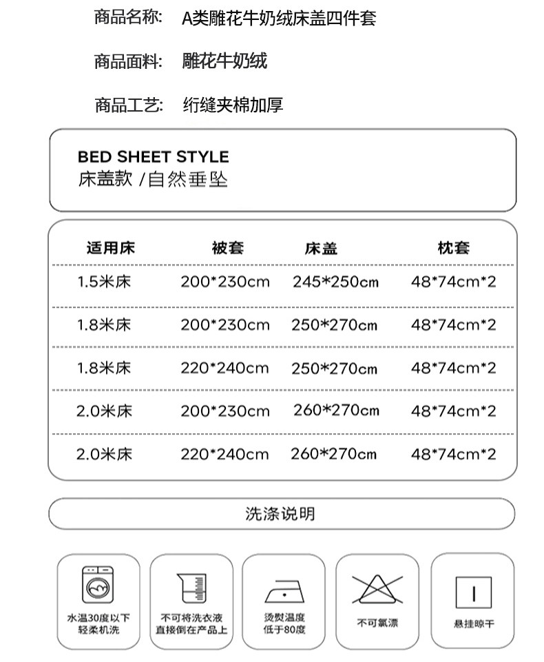 | Applicable Bed Size | 1.5m Bed Cover Four-Piece Set [Bed Cover 245X250Cm + Quilt Cover 200X230Cm + 2 Pillowcases],1.8m Bed Cover Four-Piece Set [Bed Cover 250X270Cm + Quilt Cover 200X230Cm + 2 Pillowcases],2.0m Bed Cover Four-Piece Set [Bed Cover 260X270Cm + Quilt Cover 200X230Cm + 2 Pillowcases],1.8m Bed Cover Four-Piece Set [Bed Cover 250X270Cm + Quilt Cover 220X240Cm + 2 Pillowcases],2.0m Bed Cover Four-Piece Set [Bed Cover 260X270Cm + Quilt Cover 220X240Cm + 2 Pillowcases] |