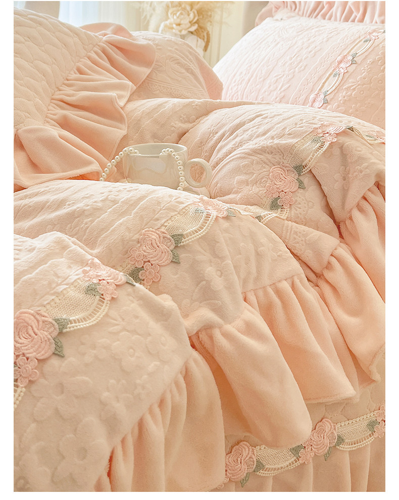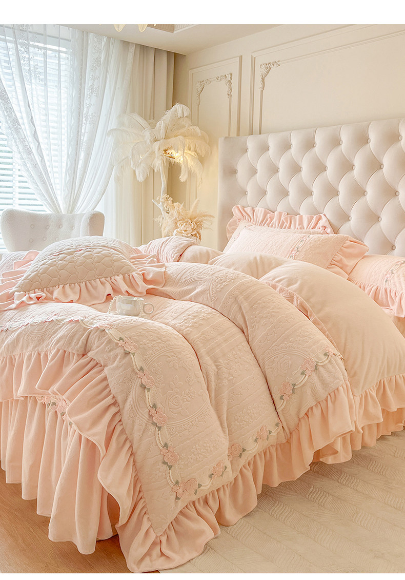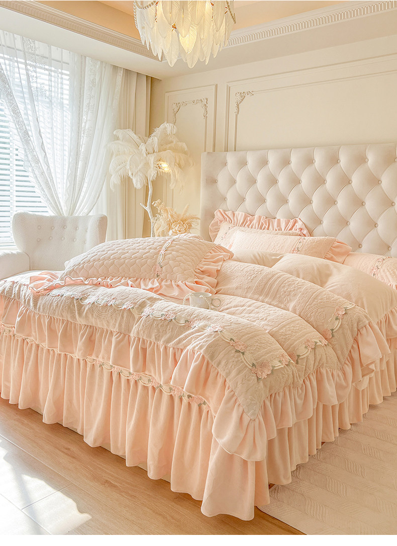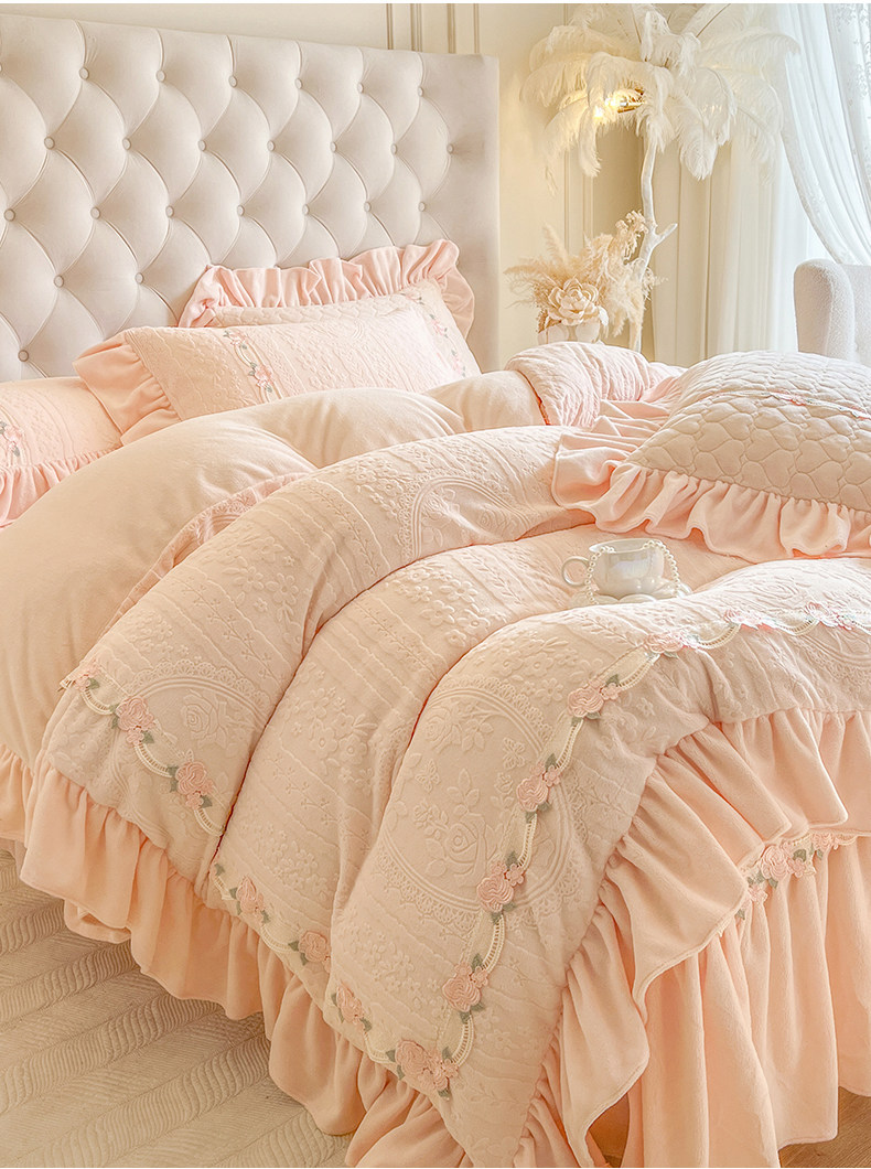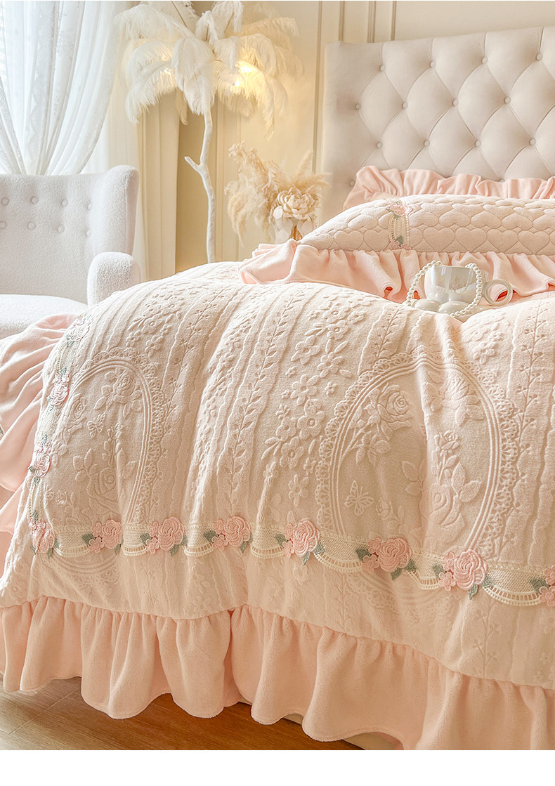 Class a Thickened Carved Milk Velvet Four-Piece Set with Quilted Bedspread, French Princess Style Ruffled Lace Bed Sheet and Duvet Cover for Winter