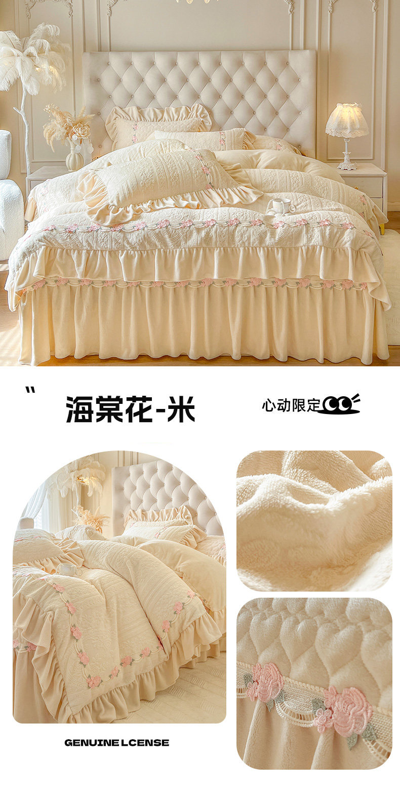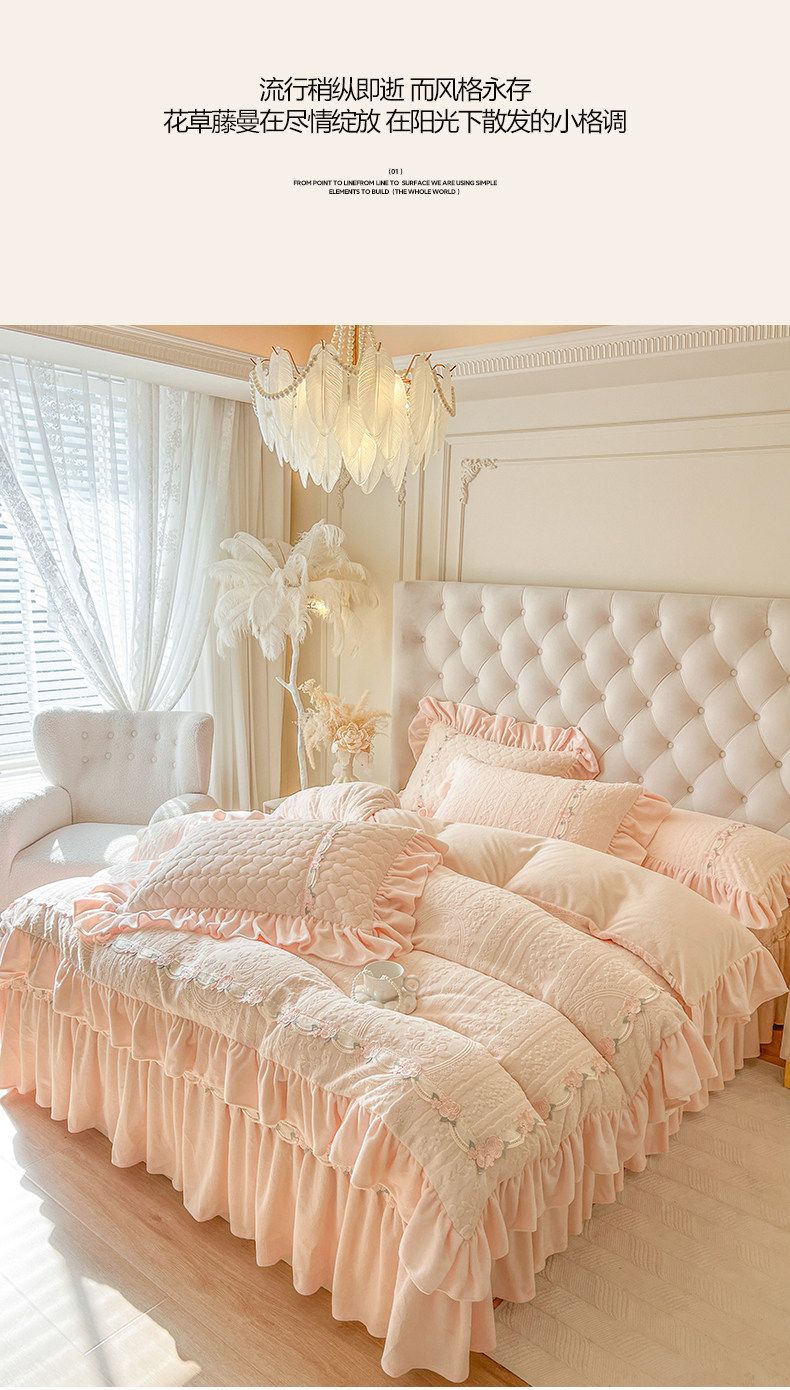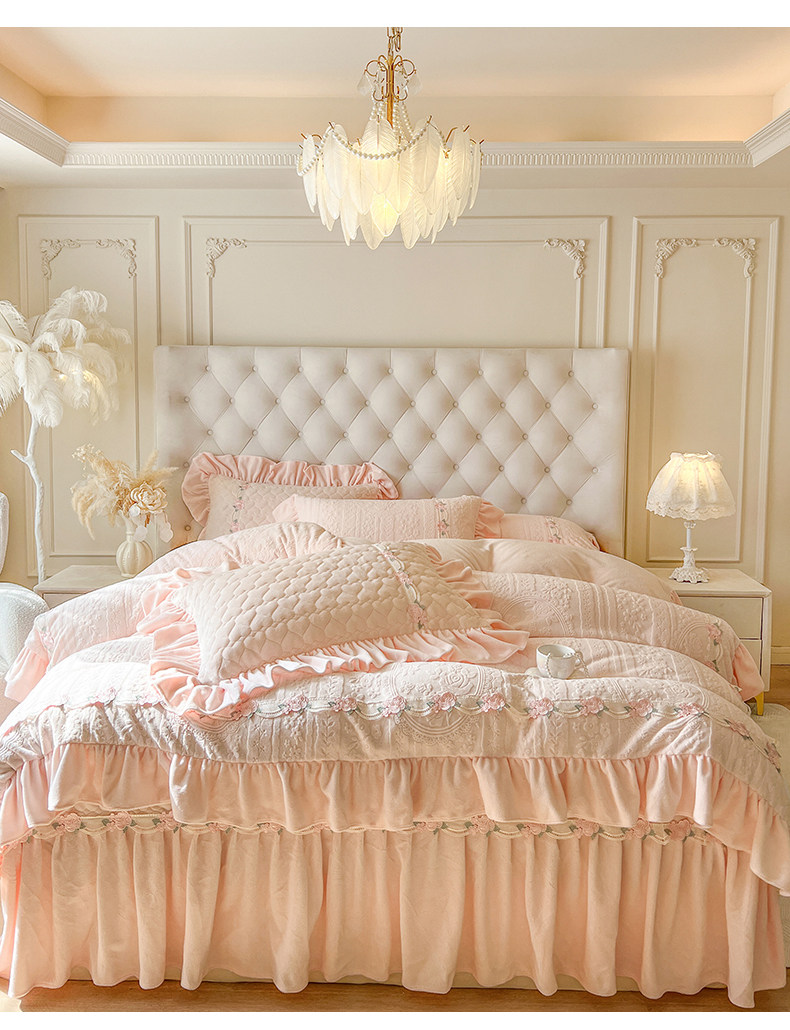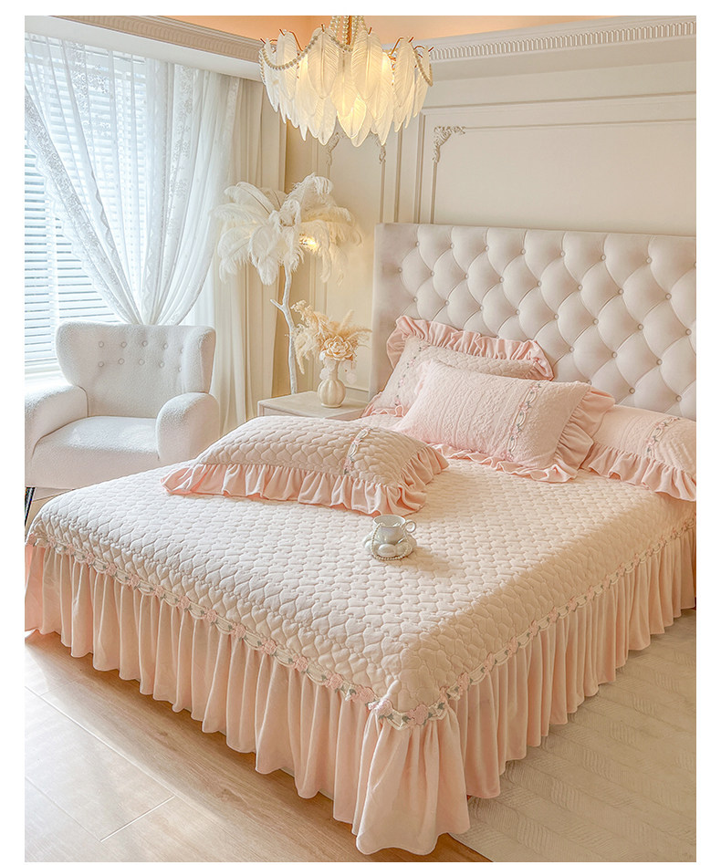 Class a Thickened Carved Milk Velvet Four-Piece Set with Quilted Bedspread, French Princess Style Ruffled Lace Bed Sheet and Duvet Cover for Winter