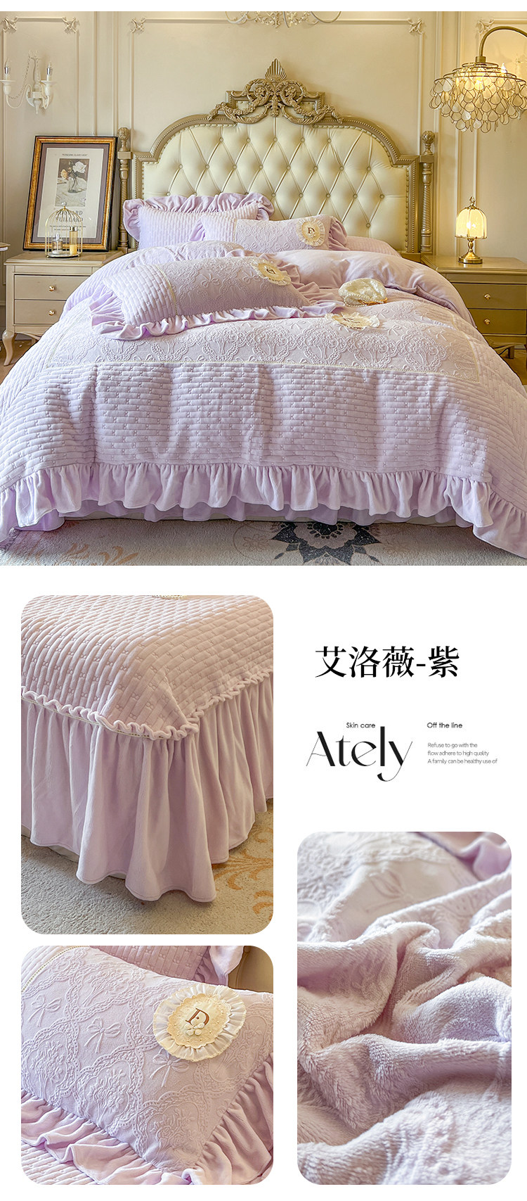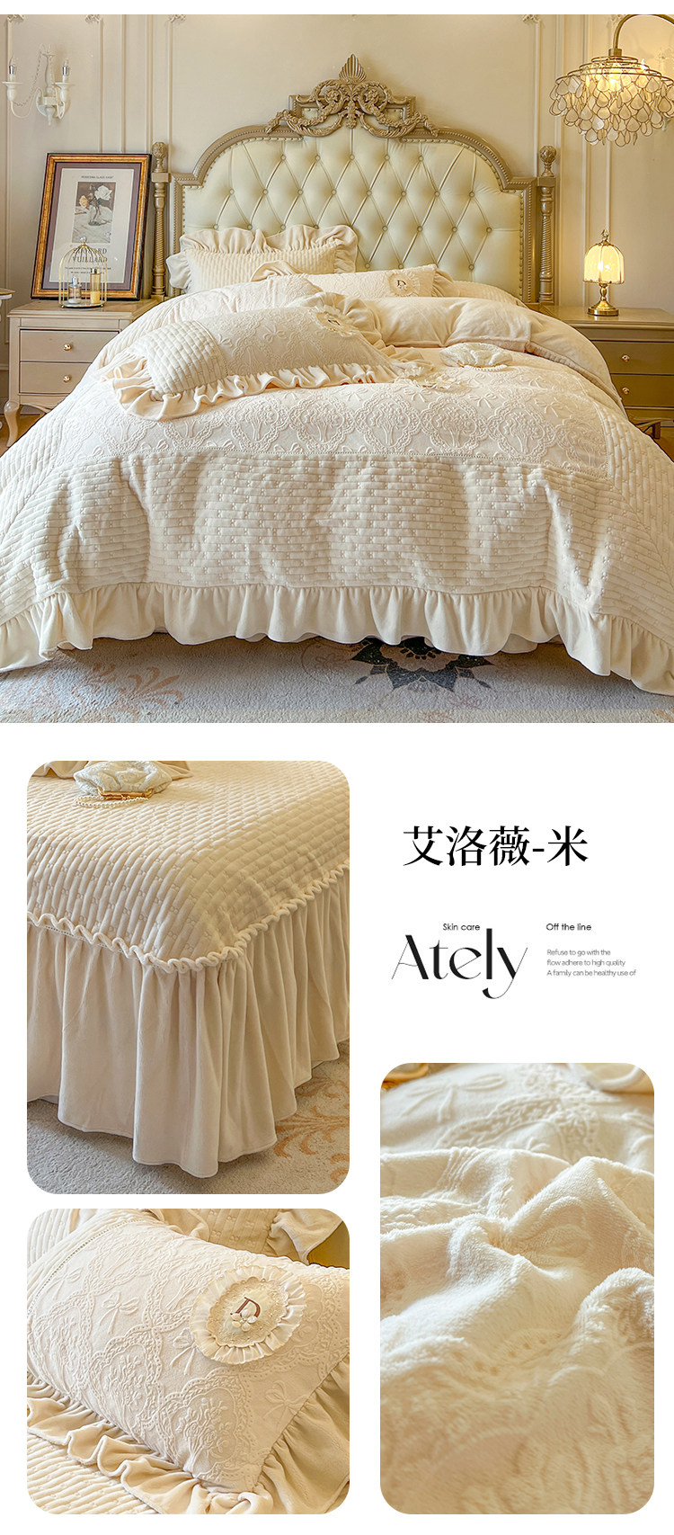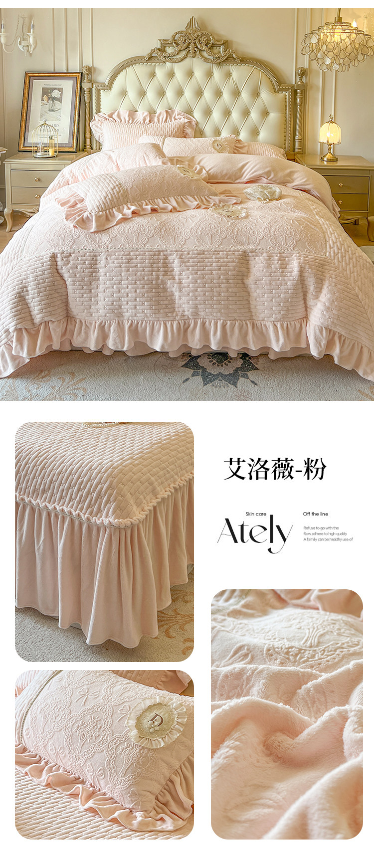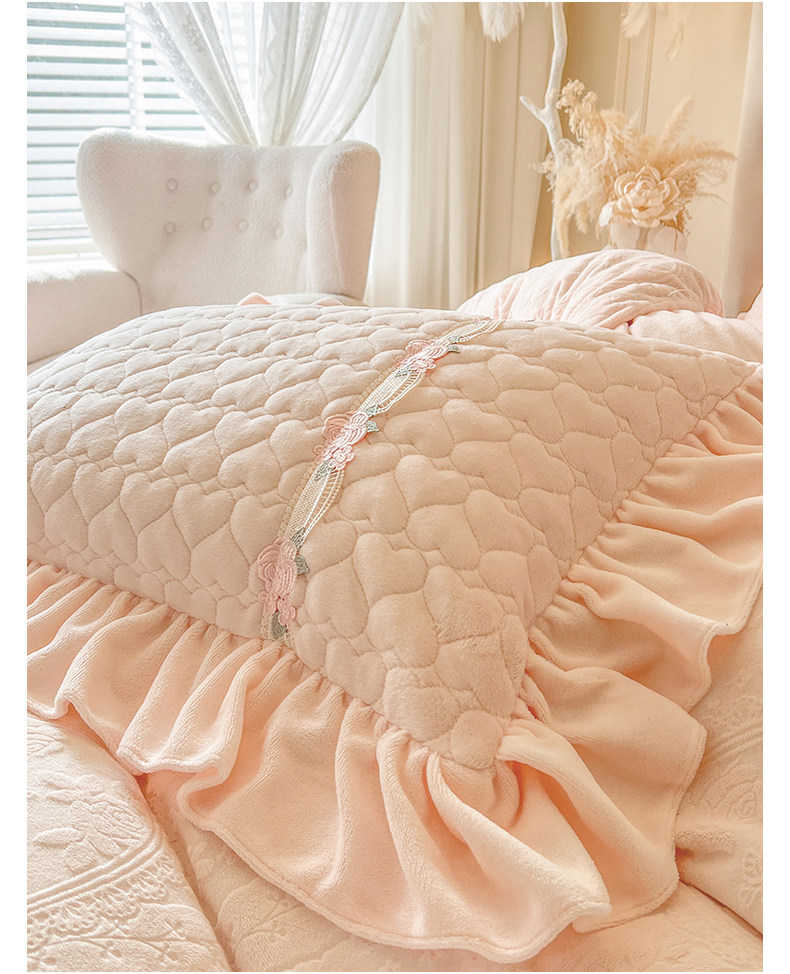 Class a Thickened Carved Milk Velvet Four-Piece Set with Quilted Bedspread, French Princess Style Ruffled Lace Bed Sheet and Duvet Cover for Winter