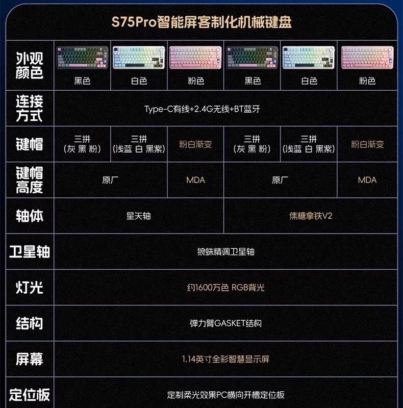 | Color Classification | S75Pro Screen Display Version Interstellar Black [Star Axis] Order and Get a Free [Spare Axis],S75Pro Screen Display Version Silent White [Star Axis] Order and Get a Free [Spare Axis],S75Pro Screen Display Version Star Dai Purple [Star Axis] Contour Side Engraving, Free [Full Version Keycap + Spare Axis],S75Pro Screen Display Version Silent Night Black [Star Axis] Contour Side Engraving Comes with [Full Version Keycap + Spare Axis],S75Pro Screen Display Version Blackberry Powder [Star Axis] Contour Side Engraving Comes with [Full Version Keycap + Spare Axis],S75Pro Screen Display Version Micro Dust Gray [Star Axis] Contour Side Engraving Comes with [Full Version Keycap + Spare Axis],S75Pro Screen Display Version Moonlight White [Star Axis] Contour Side Engraving Comes with [Full Version Keycap + Spare Axis],S75Pro Ultimate Edition Interstellar Black [Caramel Latte Axis V2] Free [Spare Axis] When Placing an Order,S75Pro Screen Display Version Glacier Blue [Star Axis] Contour Side Engraving Comes with [Full Version Keycap + Spare Axis],S75Pro Screen Display Version Taoyao Powder [Star Axis] Contour Side Engraving, Free [Full Version Keycap + Spare Axis],S75Pro Screen Display Version Interstellar Black [Star Axis] + Sc620 Three-Mode Keyboard and Mouse Set, Free [Large Table Mat + Spare Axis],S75Pro Screen Display Version Silent White [Star Axis] + Sc620 Three-Mode Keyboard and Mouse Set Comes with [Large Table Mat + Spare Axis],S75Pro Screen Display Version Sakura Pink [Star Axis] Free [Spare Axis] When Placing an Order,S75Pro Flagship Version Star Dai Purple and Other Contour Lines [Caramel Latte Axis V2] Comes with [Full Version of Keycaps + Spare Axis],S75Pro Flagship Version Quiet Night Black Contour Lines [Caramel Latte Shaft V2] Comes with [Full Version Keycap + Spare Shaft],S75Pro Flagship Version Blackberry Powder and Other Contour Lines [Caramel Latte Axis V2] Comes with [Full Version Keycap + Spare Axis],S75Pro Flagship Version of Fine Dust Gray Contour Lines [Caramel Latte Axis V2] Comes with [Full Version of Keycaps + Spare Axis],S75Pro Flagship Version Moonlight White Contour Lines [Caramel Latte Shaft V2] Comes with [Full Version Keycap + Spare Shaft],S75Pro Flagship Version Glacier Blue Contour Lines [Caramel Latte Shaft V2] Comes with [Full Version Keycap + Spare Shaft],S75Pro Flagship Version Taoyao Powder Contour [Caramel Latte Shaft V2] Comes with [Full Version of Keycaps + Spare Shaft],S75Pro Flagship Version Interstellar Black [Caramel Latte Axis V2] + Sc620 Three-Mode Keyboard and Mouse Set, Free [Large Table Mat + Spare Axis],S75Pro Ultimate Edition Silent White [Caramel Latte Axis V2] Free [Spare Axis] When Placing an Order,S75Pro Flagship Version Quiet White [Caramel Latte Axis V2] + Sc620 Three-Mode Keyboard and Mouse Set Comes with [Large Table Mat + Spare Axis],S75Pro Ultimate Edition Sakura Pink [Caramel Latte Axis V2] Free [Spare Axis] When Placing an Order,S75Pro Flagship Version Sakura Pink [Caramel Latte Axis V2] + Sc620 Three-Mode Keyboard and Mouse Set Comes with [Large Table Mat + Spare Axis],S75Pro Screen Display Version Sakura Pink [Star Axis] + Sc620 Three-Mode Keyboard and Mouse Set, Free [Large Table Mat + Spare Axis] |