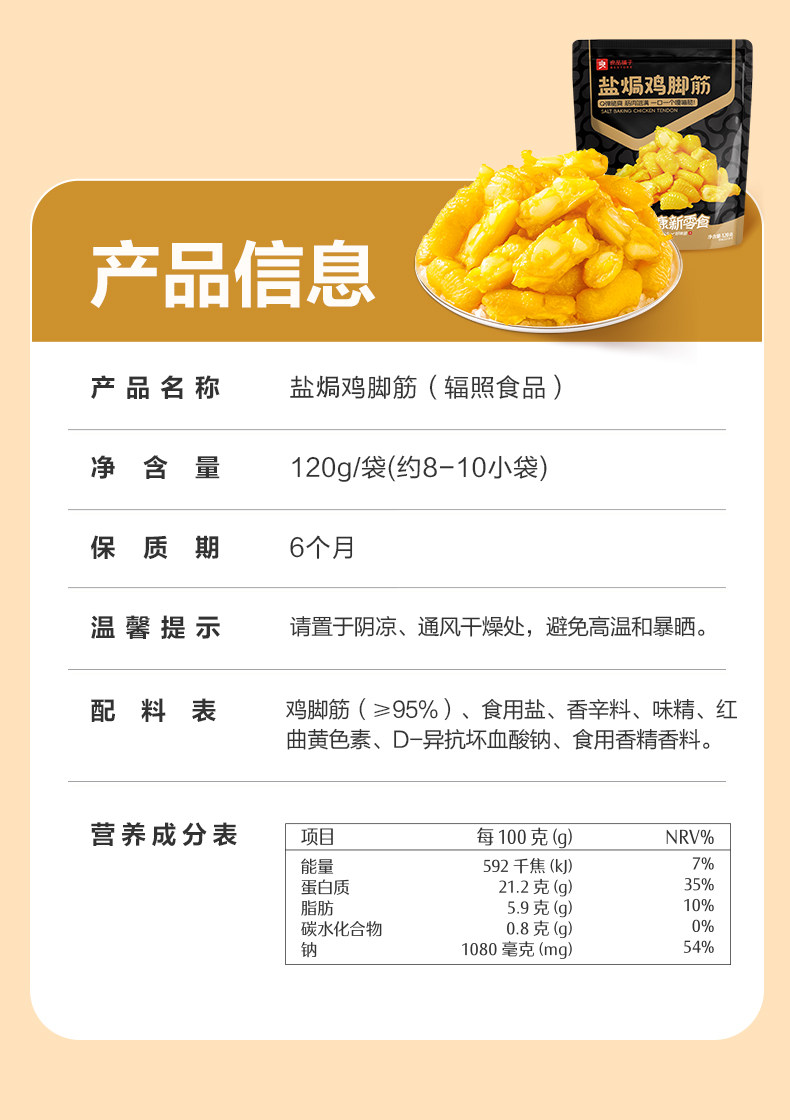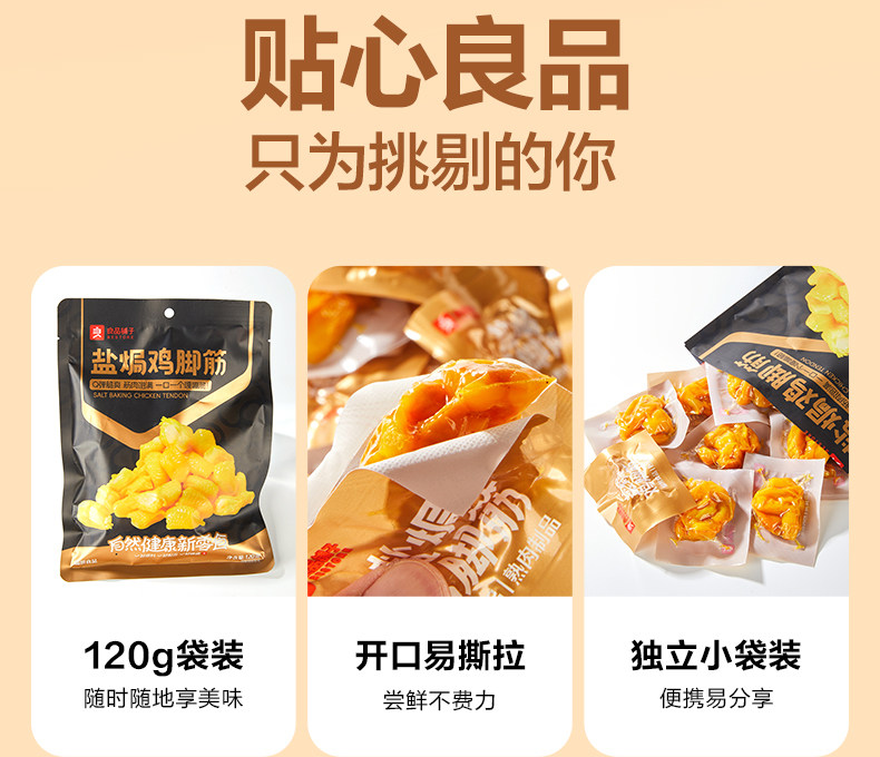 | Taste | Salt-Baked Chicken Feet 120g*12 Bags,Lemon Spicy Chicken Tendon 120g*12 Bags,Salt-Baked Chicken Feet 120g*6 Bags,Lemon Spicy Chicken Tendon 120g*6 Bags,Salt-Baked Chicken Tendons 120g*3 Bags + Lemon Hot and Sour Chicken Tendons 120g*3 Bags,Salt-Baked Chicken Tendons 120g*6 Bags + Lemon Hot and Sour Chicken Tendons 120g*6 Bags,[Mass Sales] Salt-Baked Chicken Feet 500g*1 Bag,[Mass Pack] Lemon Hot and Sour Chicken Tendons 500g*1 Bag,[New Product Launched in Bulk] Sansho Chicken Tendon 500g*1 Bag |