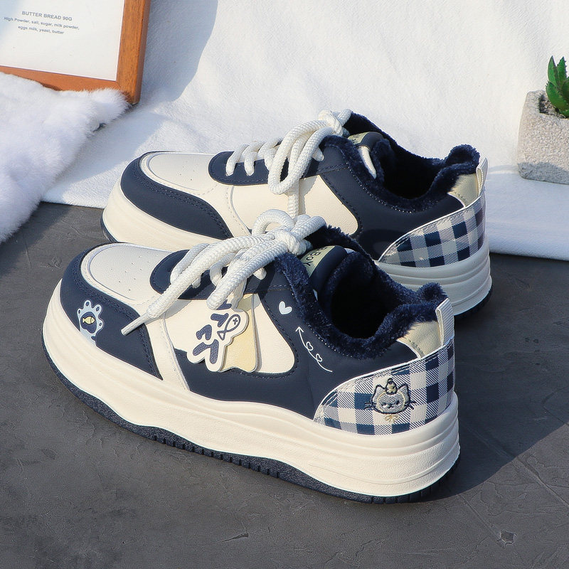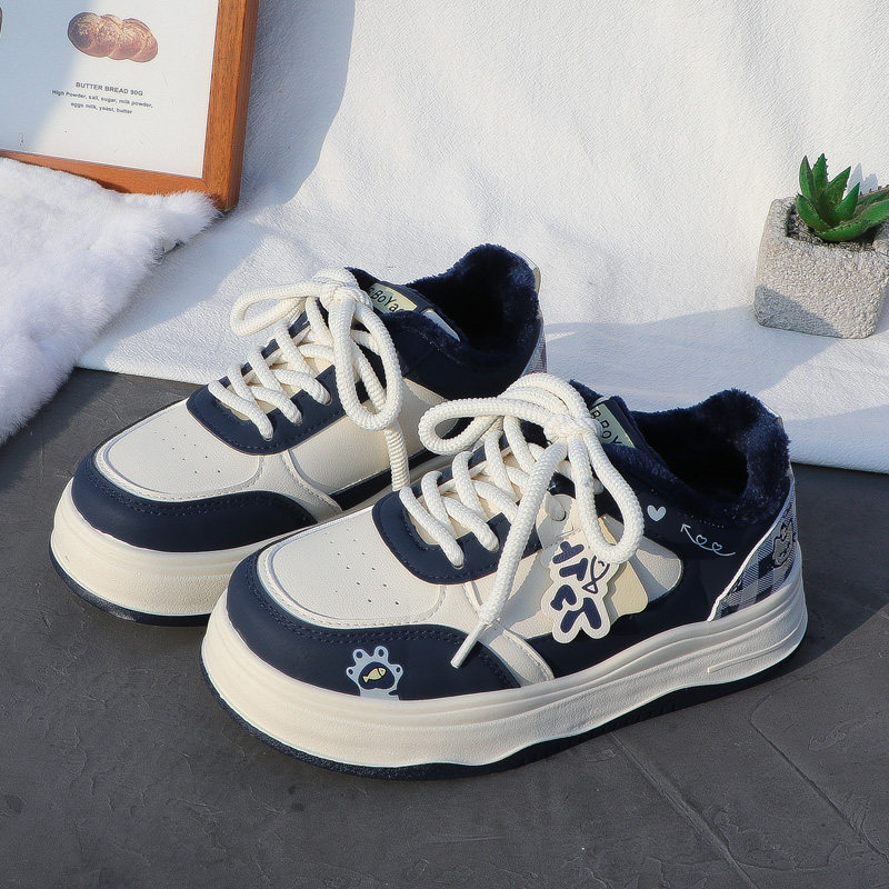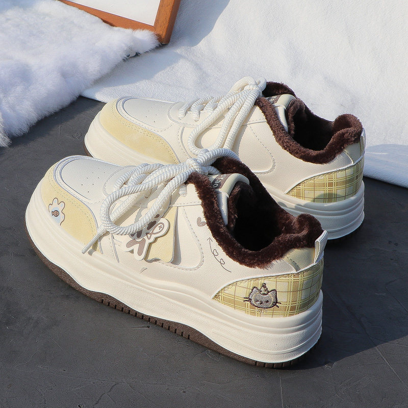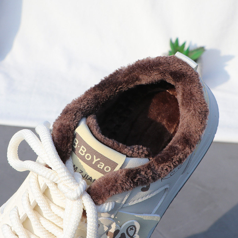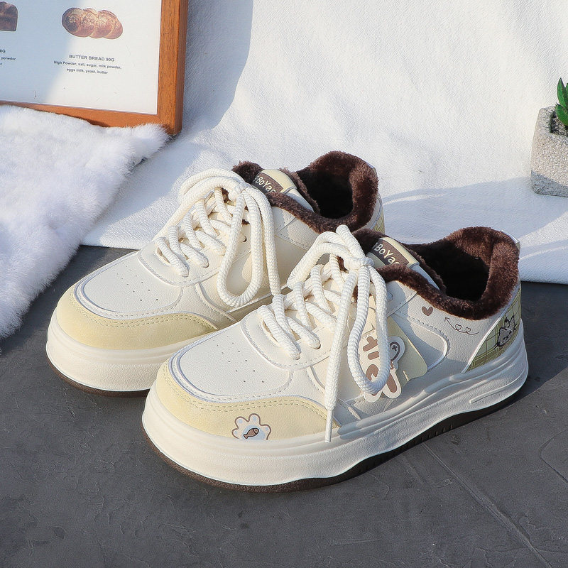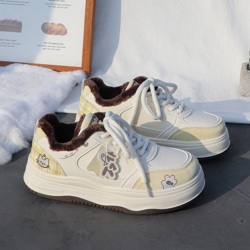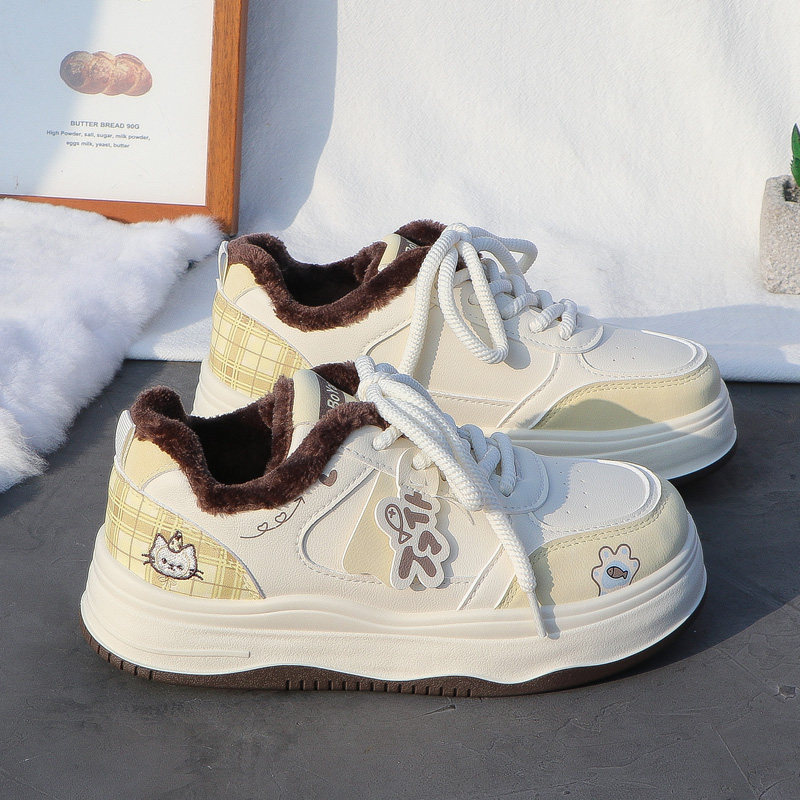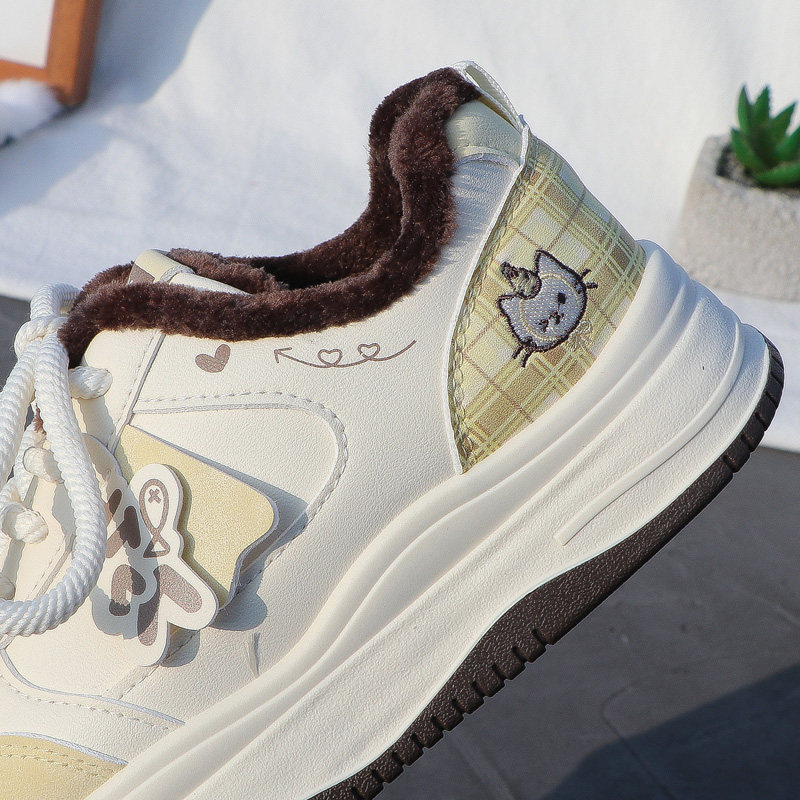 2025 Autumn and Winter Cartoon Print Fleece-Lined Sneakers for Women, Warm and Versatile White Shoes, Student Casual Comfortable Sports Cotton Shoes