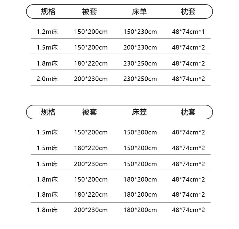 | Applicable Bed Size | 0.9m Three-Piece Set [Quilt Cover 150Cm*200Cm+Sheet 150*230Cm+Pillowcase 48*74cm],1.2m Three-Piece Set [Quilt Cover 150Cm*200Cm+Sheets 150*230Cm+Pillowcase 48*74cm],1.5m Four-Piece Set [Quilt Cover 180Cm*220Cm+Sheets 230*250Cm+Pillowcases 48*74cm Pair],1.8m Four-Piece Set [Quilt Cover 180Cm*220Cm+Sheets 230*250Cm+Pillowcases 48*74cm Pair],1.5m Four-Piece Set [Quilt Cover 200Cm*230Cm+Sheets 230*250Cm+Pillowcases 48*74cm Pair],1.8m Four-Piece Set [Quilt Cover 200Cm*230Cm+Sheets 230*250Cm+Pillowcases 48*74cm Pair],[Fitted Sheet Style] 1.5m Four-Piece Set-Quilt Cover 180Cmx220Cm,[Fitted Sheet Style] 1.8m Four-Piece Set-Quilt Cover 180Cmx220Cm,[Fitted Sheet Style] 1.5m Four-Piece Set-Quilt Cover 200Cmx230Cm,[Fitted Sheet Style] 1.8m Four-Piece Set-Quilt Cover 200Cmx230Cm |
