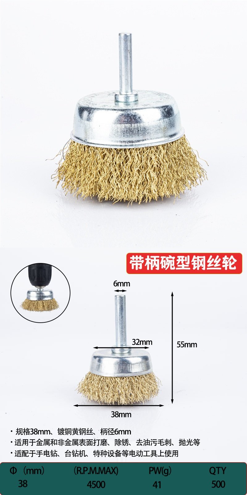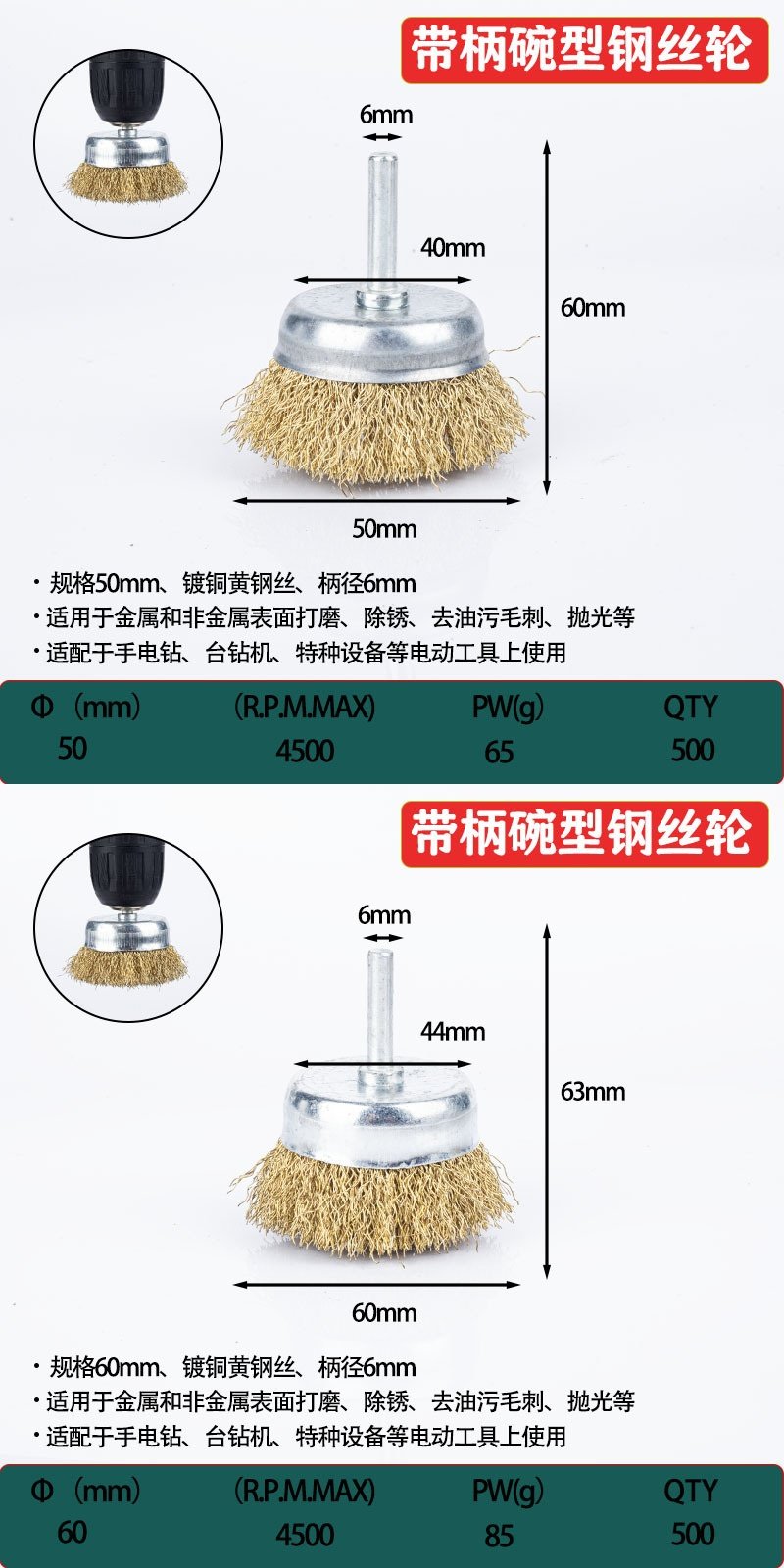 | Color Classification | Bowl-Shaped Wire Wheel with Rod [38mm] (1 Piece),Bowl-Shaped Wire Wheel with Rod [50mm] (1 Piece),Bowl-Shaped Wire Wheel with Rod [65mm] (1 Piece),Bowl-Shaped Wire Wheel with Rod [75mm] (1 Piece),Bowl-Shaped Wire Wheel with Rod [100mm] (1 Piece),Bowl-Shaped Wire Wheel with Rod [38mm] (3 Pieces),Bowl-Shaped Wire Wheel with Rod [38mm] (5 Pieces),Bowl-Shaped Wire Wheel with Rod [38mm] (10 Pieces),Bowl-Shaped Wire Wheel with Rod [50mm] (3 Pieces),Bowl-Shaped Wire Wheel with Rod [50mm] (5 Pieces),Bowl-Shaped Wire Wheel with Rod [50mm] (10 Pieces),Bowl-Shaped Wire Wheel with Rod [65mm] (3 Pieces),Bowl-Shaped Wire Wheel with Rod [65mm] (5 Pieces),Bowl-Shaped Wire Wheel with Rod [65mm] (10 Pieces),Bowl-Shaped Wire Wheel with Rod [75mm] (3 Pieces),Bowl-Shaped Wire Wheel with Rod [75mm] (5 Pieces),Bowl-Shaped Wire Wheel with Rod [75mm] (10 Pieces),Bowl-Shaped Wire Wheel with Rod [100mm] (3 Pieces),Bowl-Shaped Wire Wheel with Rod [100mm] (5 Pieces),Bowl-Shaped Wire Wheel with Rod [100mm] (10 Pieces) |