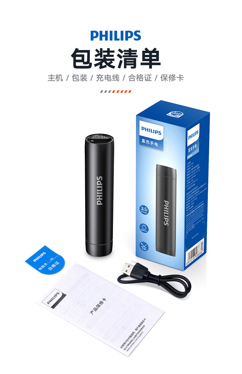 Philips Small Powerful Flashlight, Outdoor Aluminum Alloy, Compact, Convenient, Waterproof, Household Use, Long Battery Life, Rechargeable