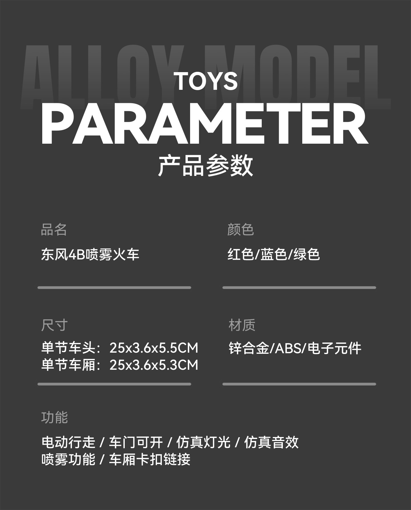 | Color Classification | Dongfeng Series Trains[Red]Three Sections,Dongfeng Series Trains[Blue]Three Sections,Dongfeng Series Trains[Green]Three Sections |