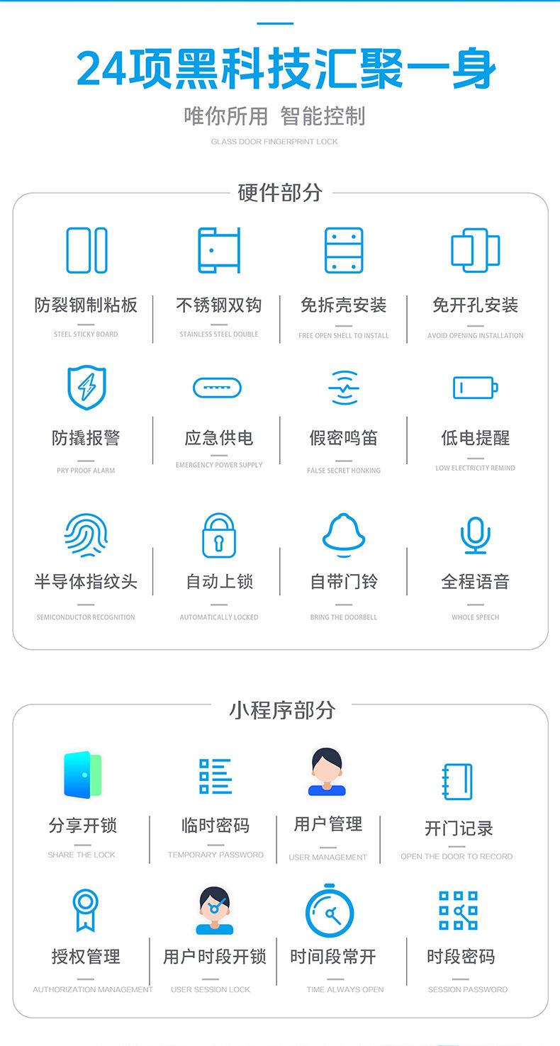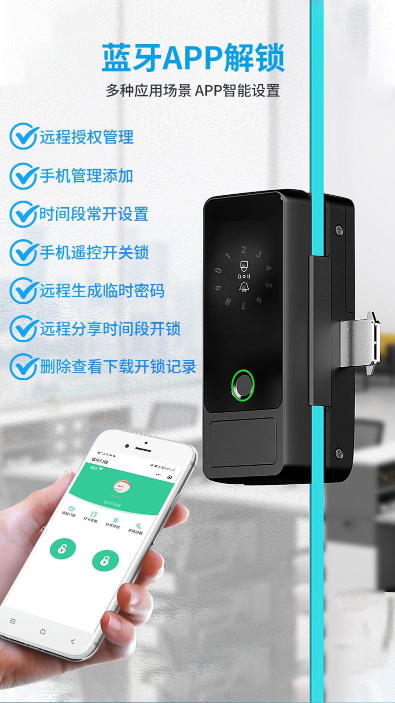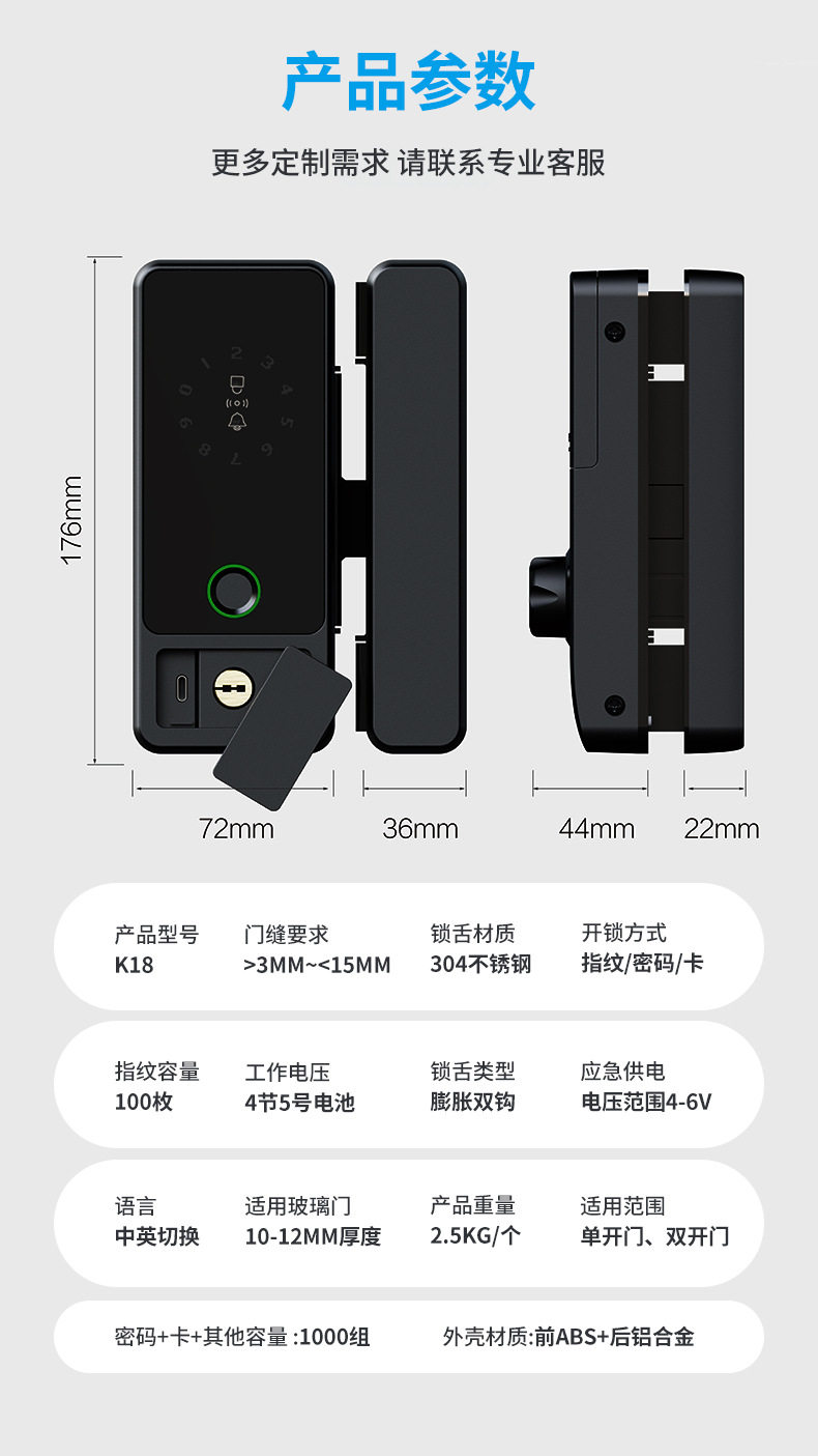 Glass Door Password Lock, Office Fingerprint Lock, Shop Electronic Lock, No Drilling Required, with Frame, Double/Single Door Access Control with Key