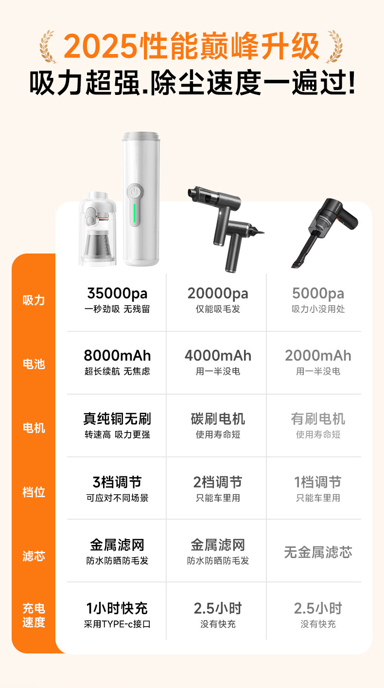 | Color Classification | Flagship Model [2.5kg Suction Power] 25000Pa✅6000Mah Electric Capacity✅Washable Filter Element*1....,Top Model [Suction Power] 35000Pa✅8000Mah Electric Capacity✅Washable Filter Element*3✅Premium Storage Bag*1,[New Upgrade in 2025] so Far, the Functions Are More Comprehensive★Stronger Suction Power,35000Pa Exclusive Patent★Hurricane Pure Copper Brushless Motor★Complete Set of Accessories,【Double 11 Limited-Time Relaunch】All-Time Low Prices! Miss It, and You'Ll Be Waiting a Year!,[Store Subsidy] Enjoy 15% Discount Immediately When You Place an Order ★ Available Nationwide |