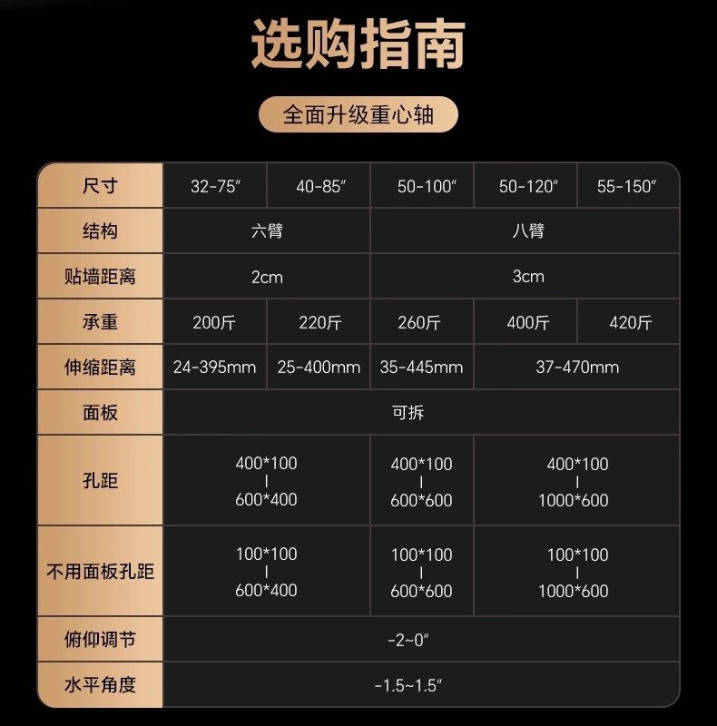 | Color Classification | Solid Shaft - Embedded Without Blocking Socket [32-75inch] about 2cm Wall-Mounted / 100kg Load-Bearing / Multi-Wall Compatible,Solid Shaft - Embedded Without Blocking Socket [40-85inch] about 2cm Wall-Mounted / 110kg Load-Bearing / Multi-Wall Compatible,Solid Shaft - Embedded Without Blocking Socket [50-100inch] about 3cm Wall-Mounted / 130kg Load-Bearing / Multi-Wall Compatible,Solid Shaft - Embedded Without Blocking Socket [50-120inch] about 3cm Wall-Mounted / 200kg Load-Bearing / Multi-Wall Compatible,Solid Shaft - Embedded Without Blocking Socket [55-150inch] about 3cm Wall-Mounted / 220kg Load-Bearing / Multi-Wall Compatible,Delivery to Home |