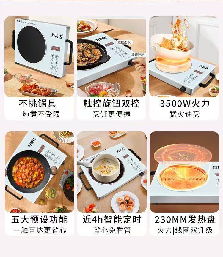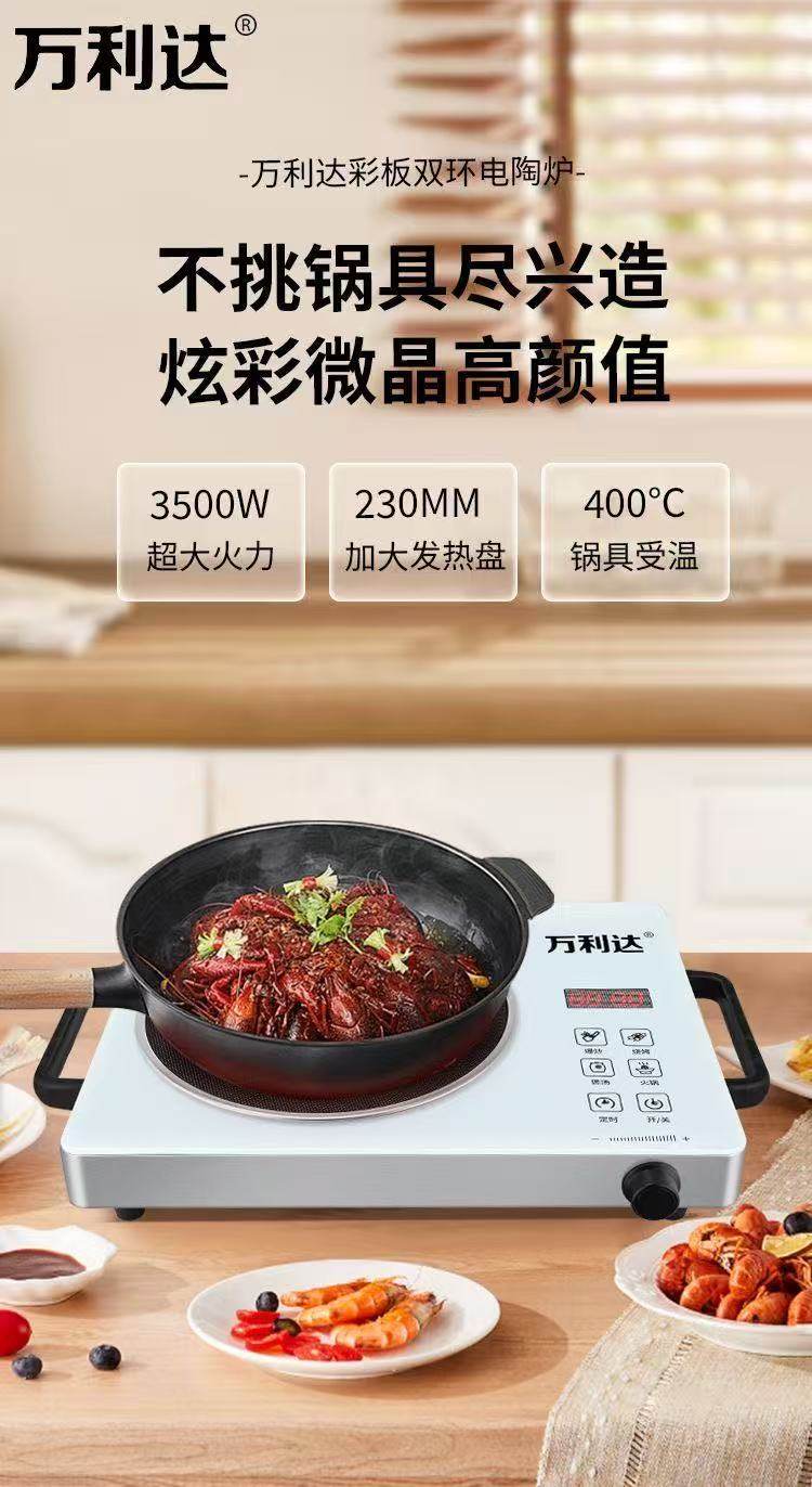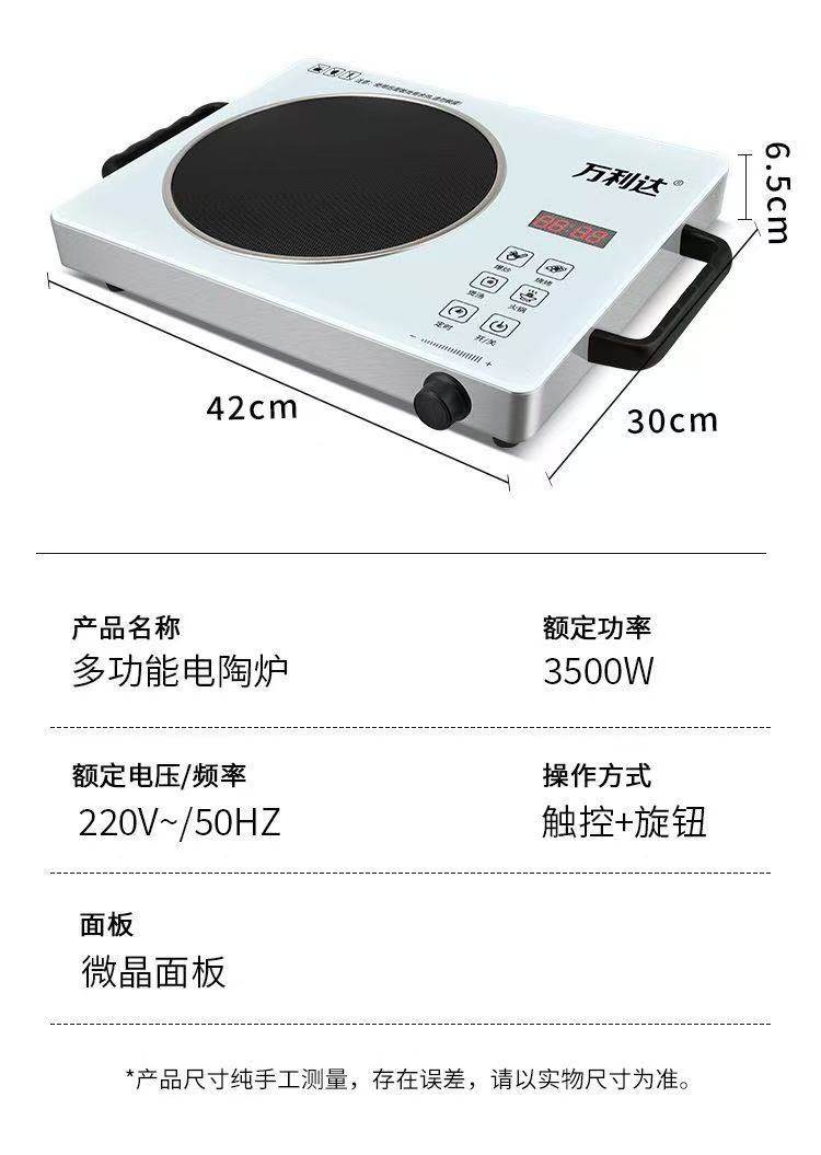 | Color Classification | Wanlida White Ceramic Cooktop - Universal Pot Compatibility - 3500W,Wanlida Black Electric Ceramic Stove [No Pot Required] 3500W,Wanlida Brushed Wood Grain Electric Ceramic Cooktop - Universal Pot Compatibility - 3500W,Wanlida Wood Grain Electric Ceramic Stove [No Pot/Aluminum Handle] 3500W,Wanlida White Electric Ceramic Cooktop Set [Wok + Spatula + Soup Pot] 3500W,Wanlida Black Electric Ceramic Stove Set [Iron Pot + Spatula + Soup Pot] 3500W,Wanlida White Electric Ceramic Cooktop - Universal Pot Compatibility - 2200W |
