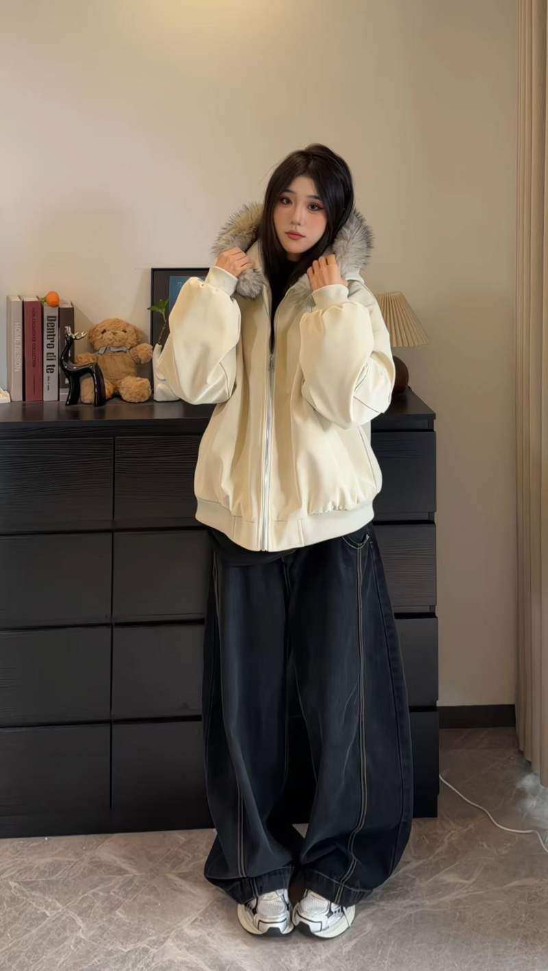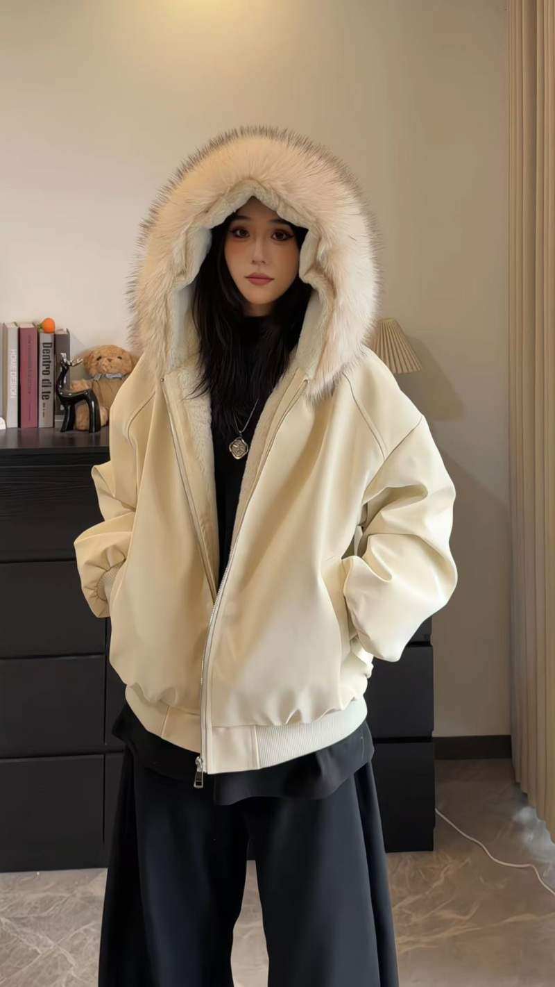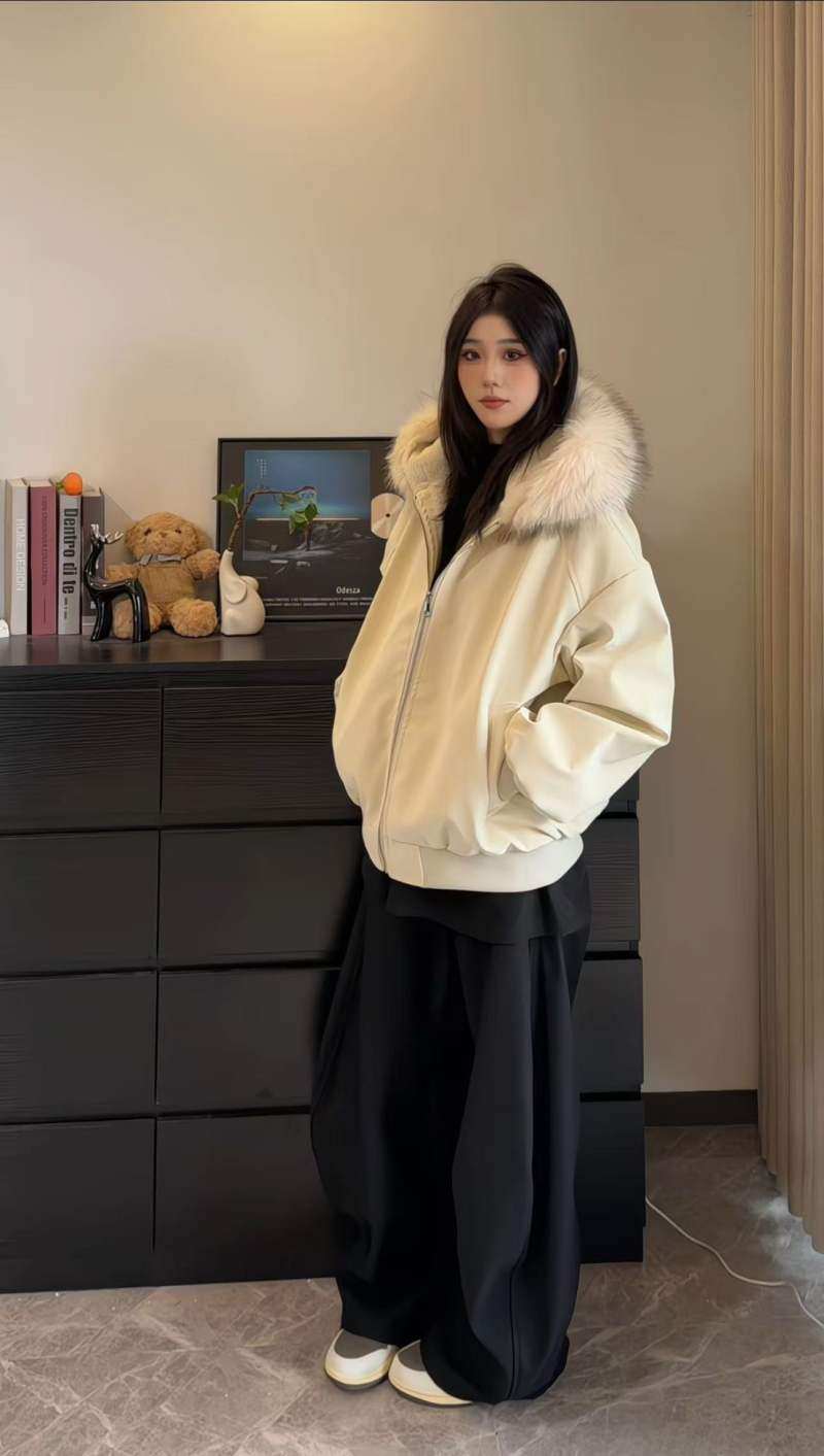 Lychee Pattern Detachable Fur Collar Pu Leather Cotton Jacket for Men and Women, Couple's Thickened Warm Coat, Winter down Cotton Clothing