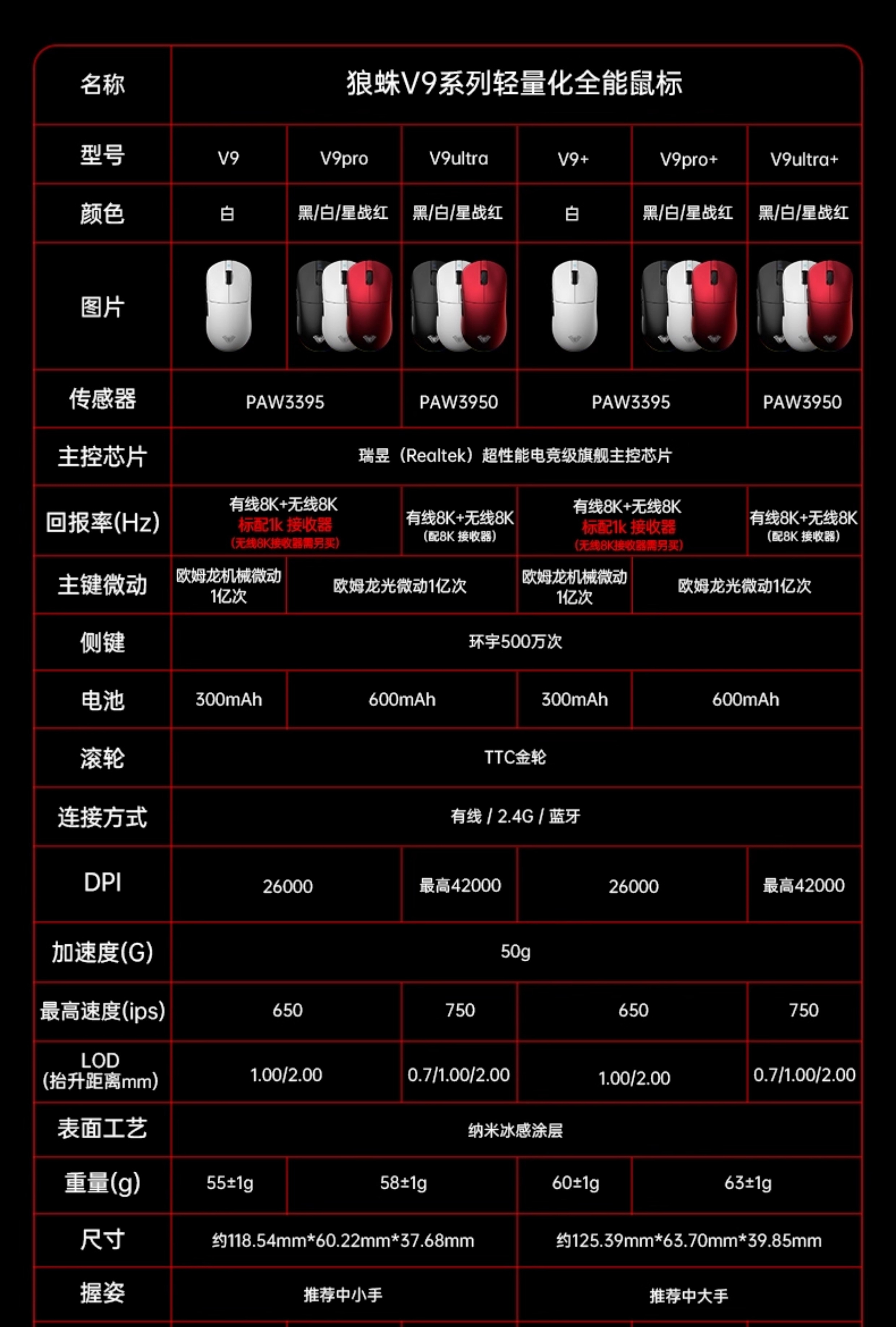 | Color Classification | 【V9】Elegant White - Pwa3395 Supports 8K Refresh Rate (Ideal for Small Hands),【V9+】Elegant White - Pwa3395 Supports 8K Refresh Rate (Ideal for Larger Hands),【V9Pro】Elegant White - Pwa3395 Supports 8K Refresh Rate (Ideal for Small Hands),【V9Pro+】Elegant White - Pwa3395 Supports 8K Refresh Rate (Ideal for Larger Hands),【V9Pro】Knight Black - Pwa3395 Supports 8K Refresh Rate (Ideal for Small Hands),【V9Pro+】Knight Black - Pwa3395 Supports 8K Refresh Rate (Ideal for Larger Hands),【V9Pro】Star Wars Red-Pwa3395 Supports 8K Refresh Rate (Suitable for Small Hands),【V9Pro+】Star Wars Red-Pwa3395 Supports 8K Report Rate (Suitable for Big Hands),【V9Max】Gradient Pink - Pwa3395 Dual 8K Refresh Rate (Ideal for Small Hands),【V9Max+】Gradient Pink - Pwa3395 Dual 8K Refresh Rate (Ideal for Larger Hands),【V9Max】Gradient Red - Pwa3395 Dual 8K Refresh Rate (Ideal for Smaller Hands),【V9Max+】Gradient Red - Pwa3395 Dual 8K Refresh Rate (Ideal for Larger Hands),【V9Ultra】Elegant White - Pwa3950 Dual 8K Refresh Rate (Ideal for Small Hands),【V9Ultra+】Elegant White - Pwa3950 Dual 8K Refresh Rate (Ideal for Larger Hands),【V9Ultra】Knight Black - Pwa3950 Dual 8K Refresh Rate (Ideal for Small Hands),【V9Ultra+】Knight Black - Pwa3950 Dual 8K Refresh Rate (Ideal for Larger Hands),【V9Ultra】Star Wars Red-Pwa3950 Dual 8K Return Rate (Suitable for Small Hands),【V9Ultra+】Star Wars Red - Pwa3950 Dual 8K Refresh Rate (Ideal for Larger Hands) |