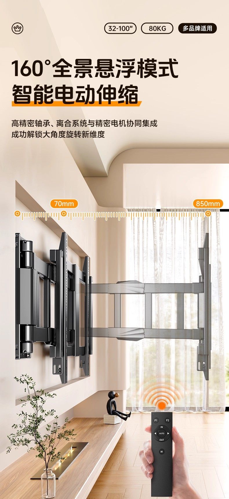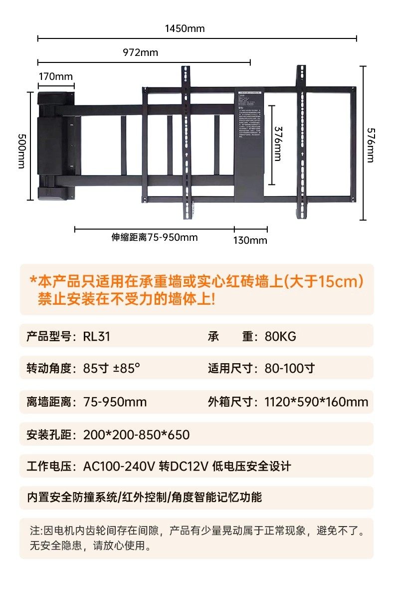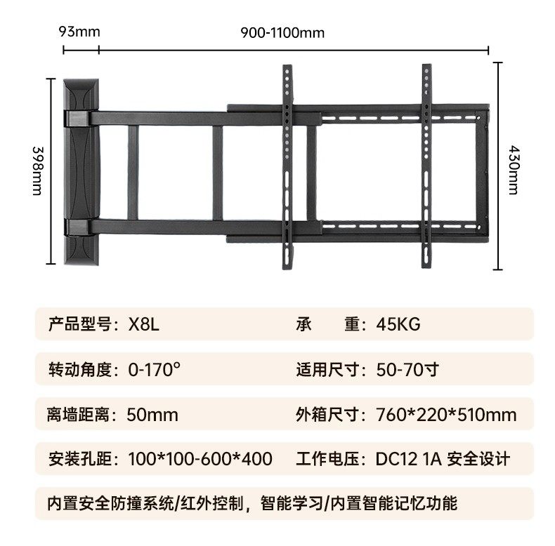| Color Classification | X8 [Universal] Remote Control Electric One-Way Rotation/Load Capacity 35kg,X8L [Universal 50-65inch] Remote Control Electric One-Way Rotation/Load Capacity 45kg,X9 [Universal] Remote Control Electric One-Way Rotation/Load Capacity 65kg,Rl20 [Universal] Remote Control Electric Telescopic Left and Right Turn/Load Capacity 35Kg/Arm Length 500mm,Rl21 [Universal] Remote Control Electric Telescopic Left and Right Turn/Load Capacity 45Kg/Arm Length 600mm,Rl22 [Universal] Remote Control Electric Telescopic Left and Right Turn/Load Capacity 50Kg/Arm Length 700mm,Rl23 [Universal] Remote Control Electric Telescopic Left and Right Turn/Load Capacity 50Kg/Arm Length 800mm,Rl23L [Universal 75-86inch] Remote Control Electric Telescopic Left and Right Turn/Load Capacity 55Kg/Arm Length 775mm,Rl31 [Universal] Remote Control Electric Telescopic Left and Right Turn/Load Capacity 80Kg/Arm Length 875mm |