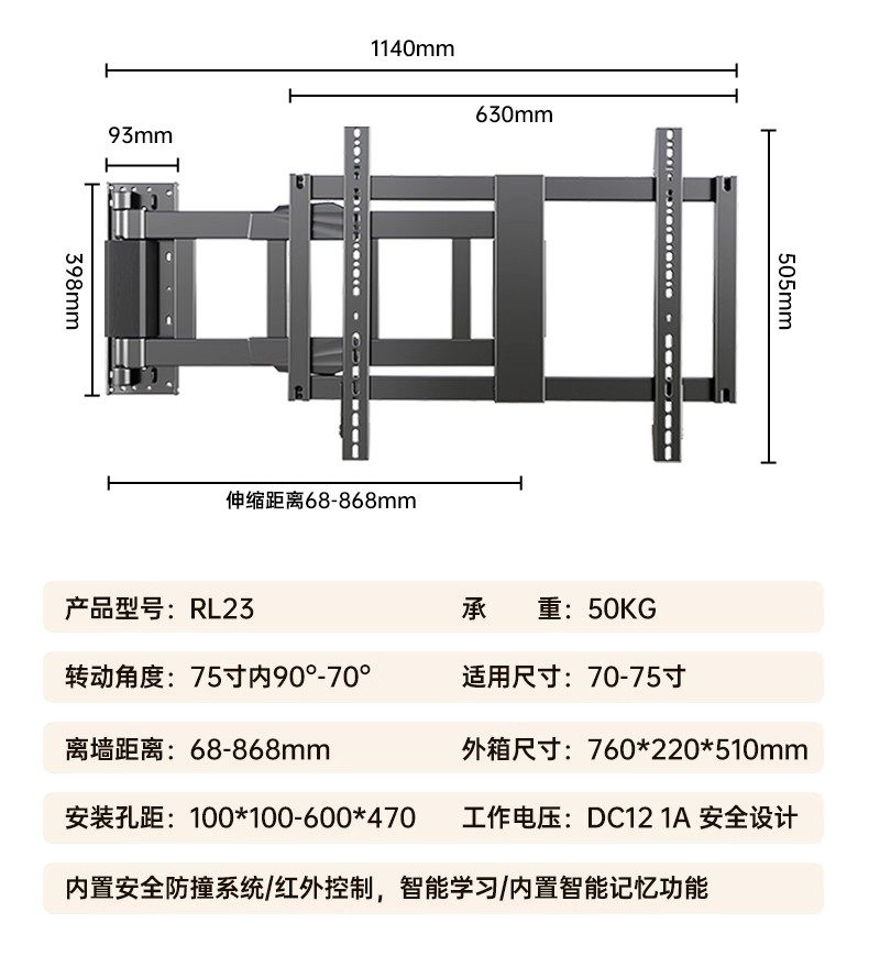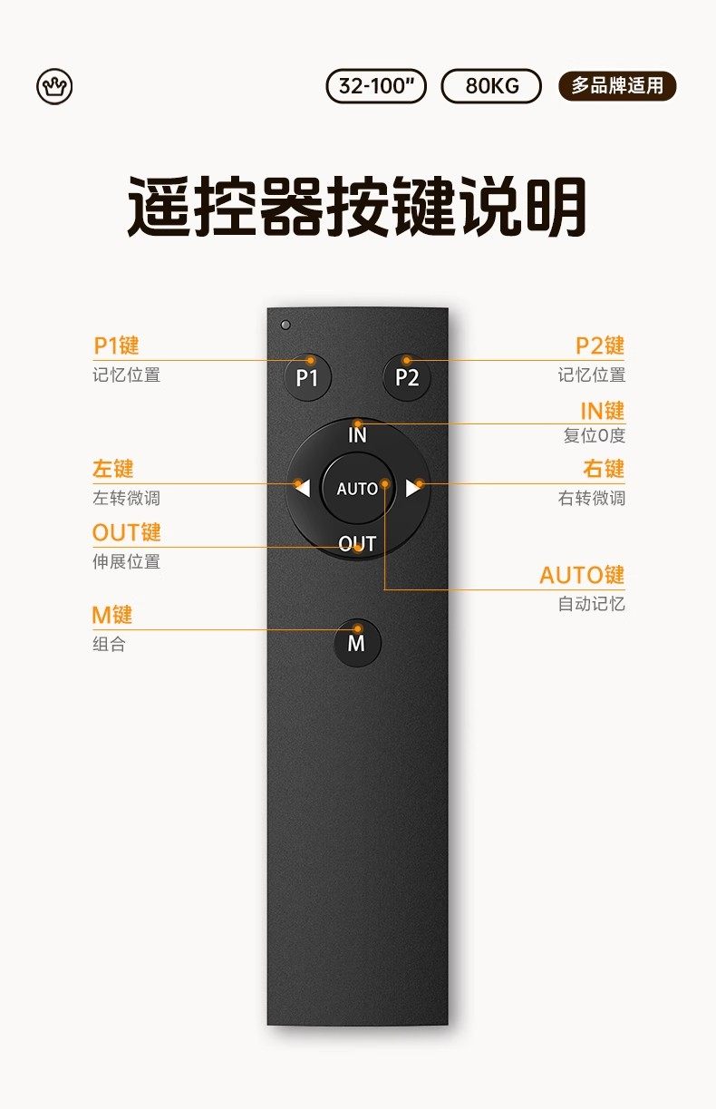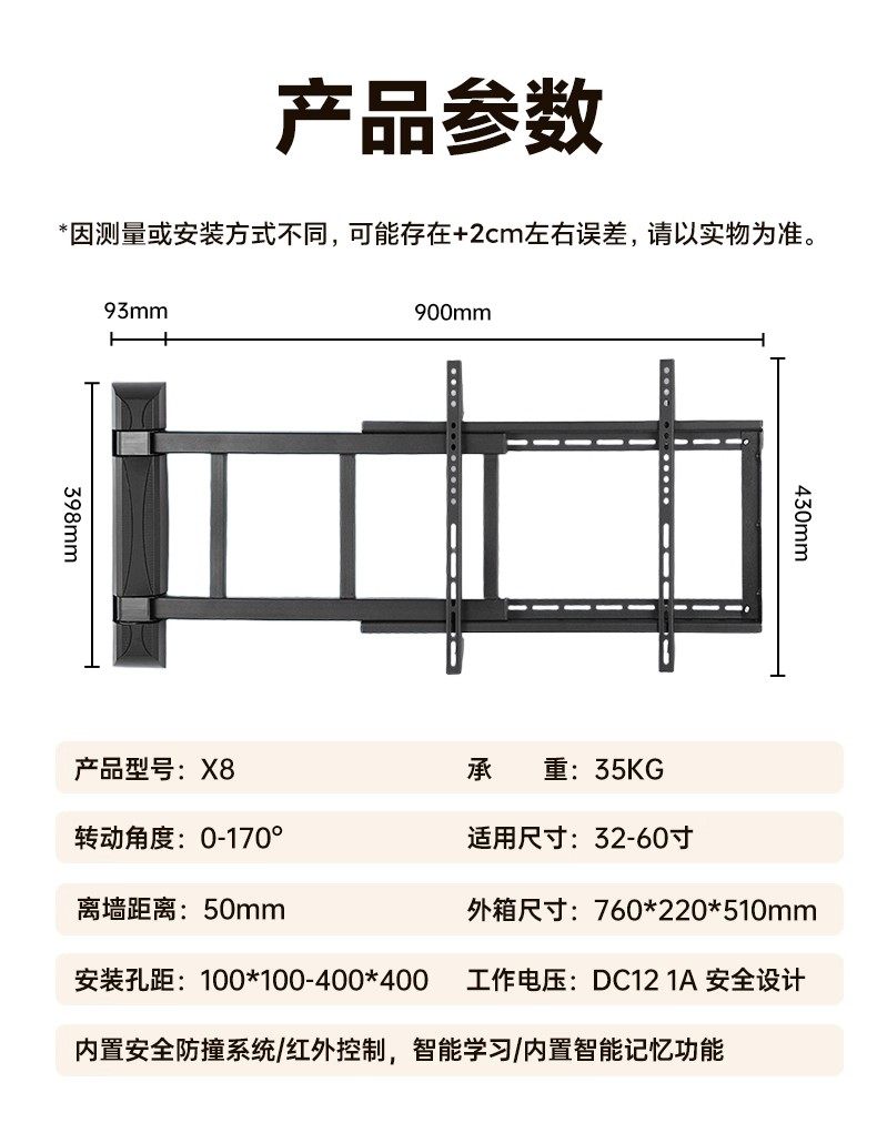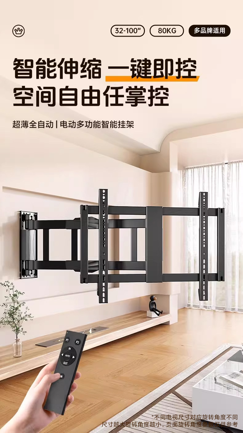 | Color Classification | X8 [Universal] Remote Control Electric One-Way Rotation/Load Capacity 35kg,X8L [Universal 50-65inch] Remote Control Electric One-Way Rotation/Load Capacity 45kg,X9 [Universal] Remote Control Electric One-Way Rotation/Load Capacity 65kg,Rl20 [Universal] Remote Control Electric Telescopic Left and Right Turn/Load Capacity 35Kg/Arm Length 500mm,Rl21 [Universal] Remote Control Electric Telescopic Left and Right Turn/Load Capacity 45Kg/Arm Length 600mm,Rl22 [Universal] Remote Control Electric Telescopic Left and Right Turn/Load Capacity 50Kg/Arm Length 700mm,Rl23 [Universal] Remote Control Electric Telescopic Left and Right Turn/Load Capacity 50Kg/Arm Length 800mm,Rl23L [Universal 75-86inch] Remote Control Electric Telescopic Left and Right Turn/Load Capacity 55Kg/Arm Length 775mm,Rl31 [Universal] Remote Control Electric Telescopic Left and Right Turn/Load Capacity 80Kg/Arm Length 875mm |