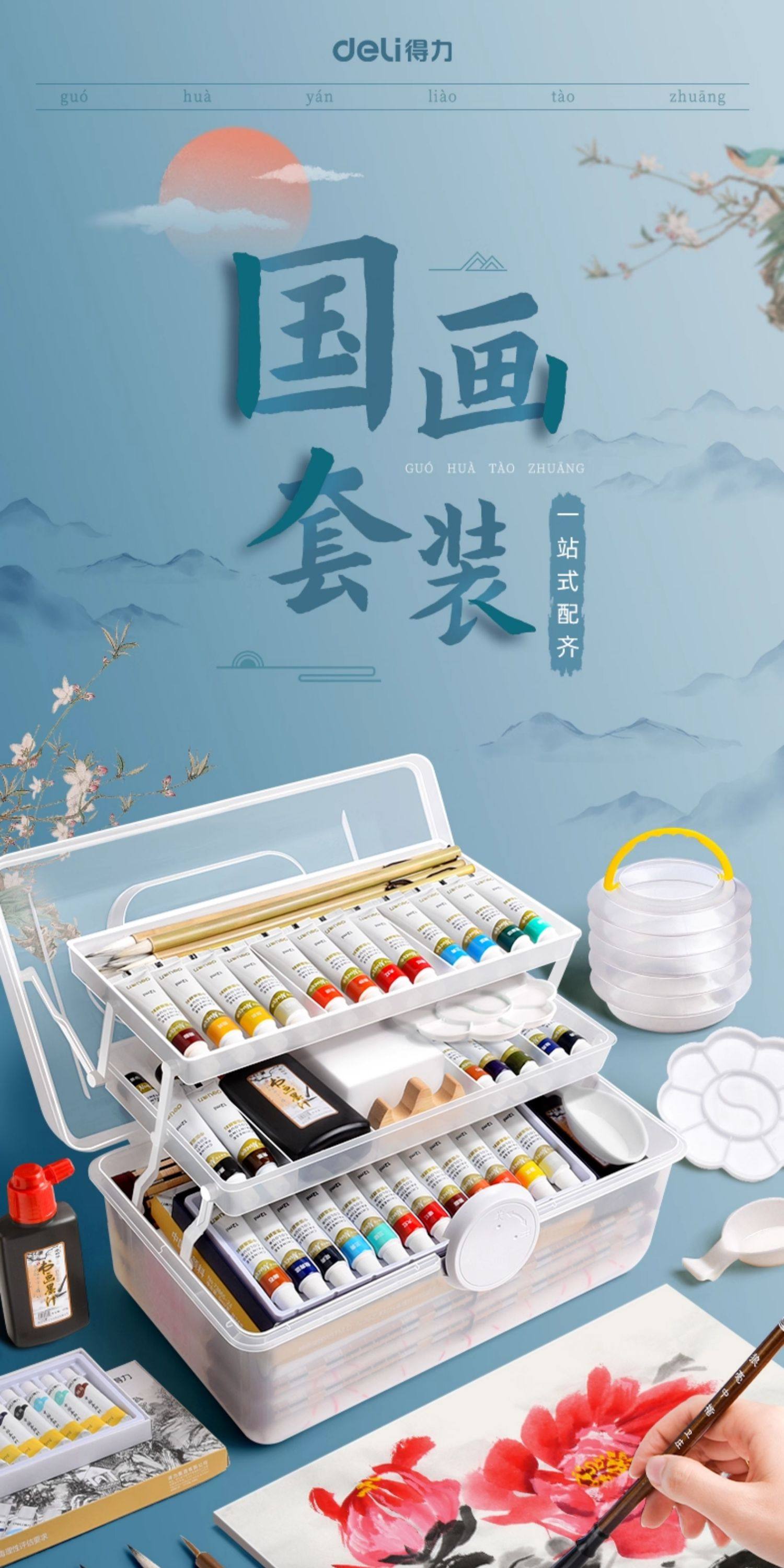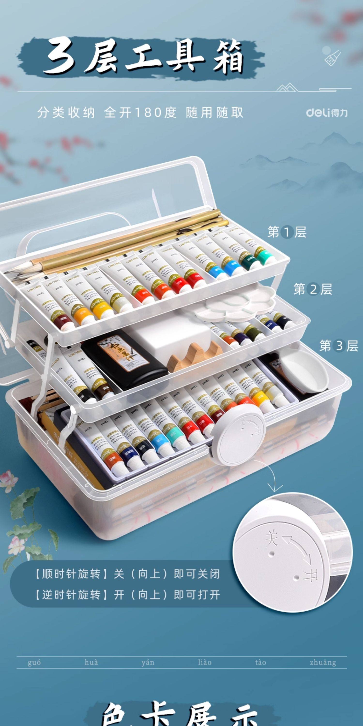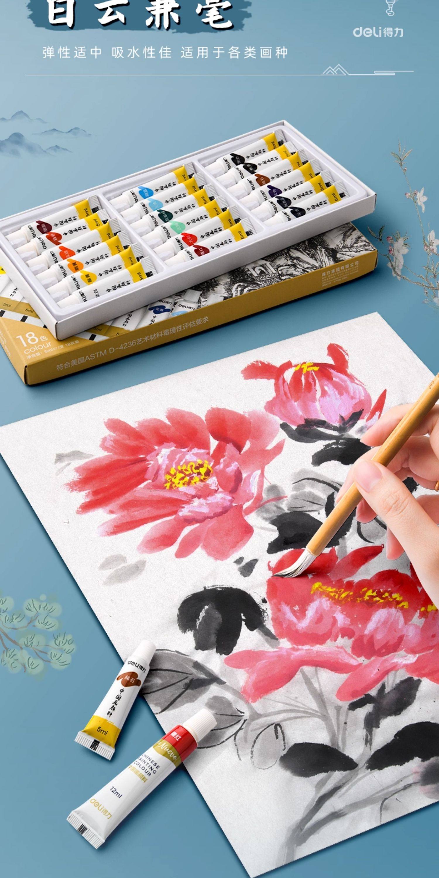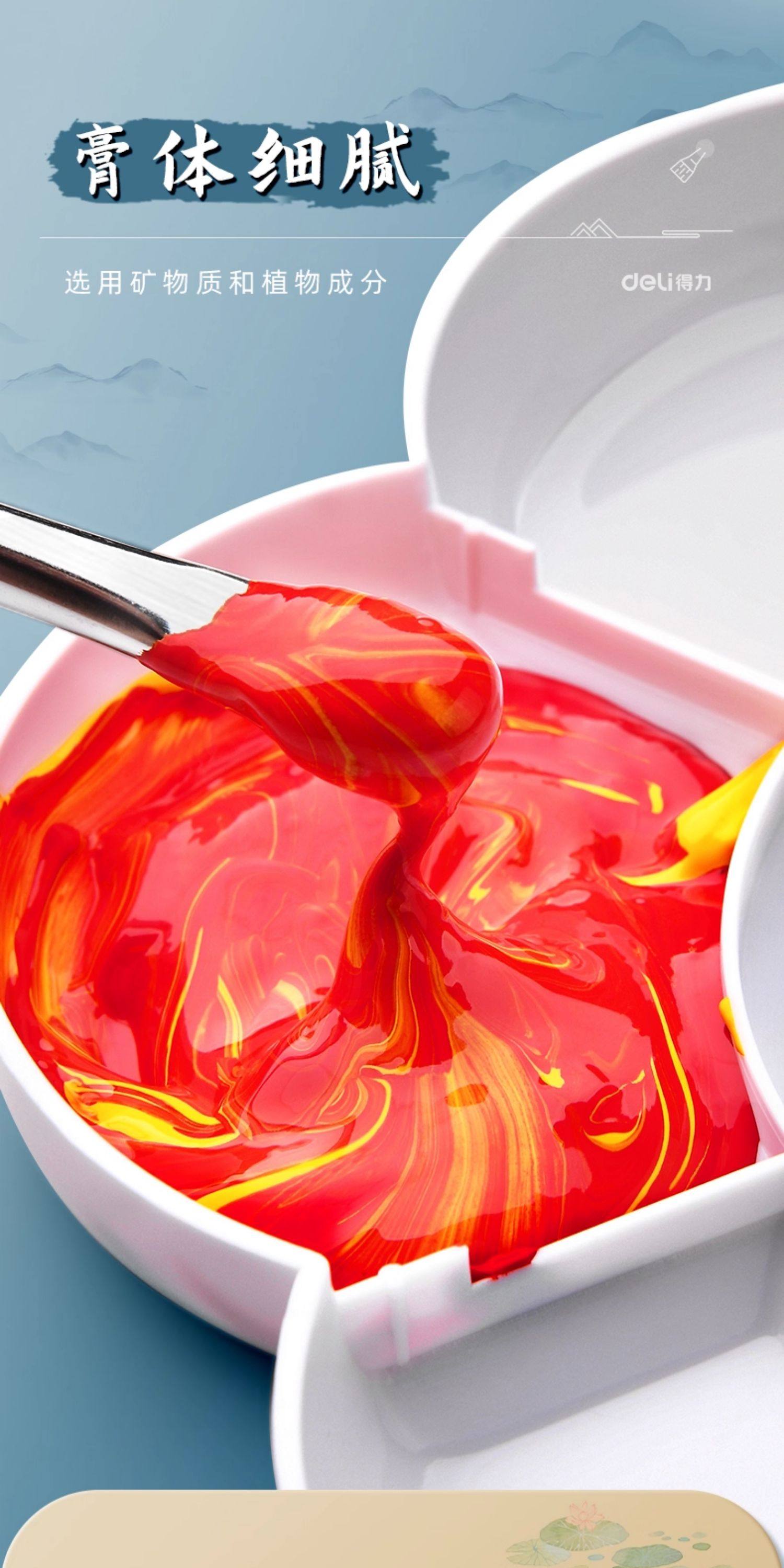Deli Chinese Painting Pigment Beginner Set, Chinese Painting Supplies, Ink Painting Tool Set, Complete Set of 12 Colors, Suitable for Elementary School Third Grade and Middle School Students, Art Drawing Materials, Brush, 24 Colors