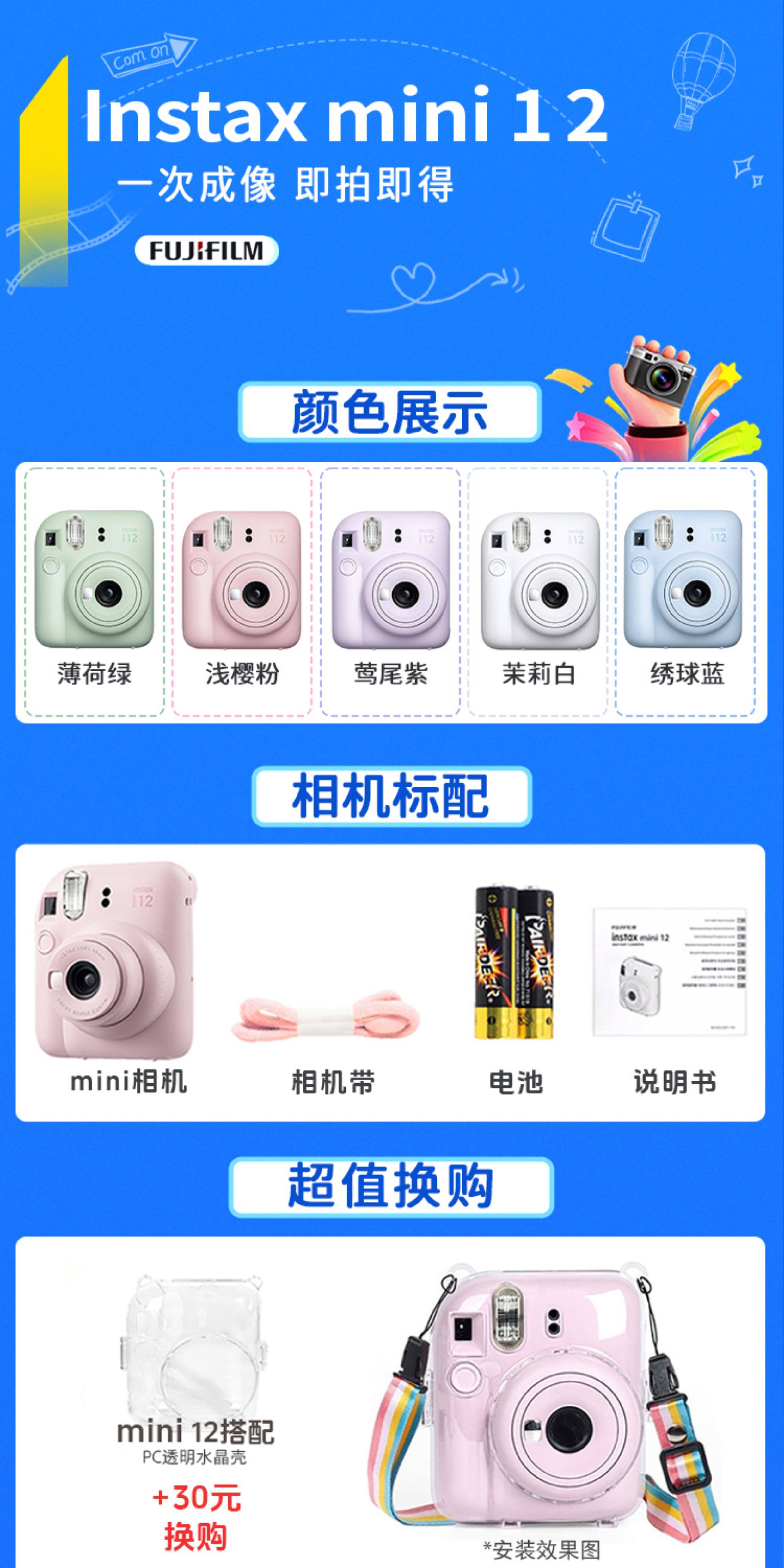 | Color Classification | Brand New Mini12 Blue,Brand New Blue Mini12+ [Crystal Case],Brand New Mini12 Purple,Brand New Purple Mini12+ [Crystal Case],Brand New Mini12 Green,Brand New Mini12 Green + [Crystal Case],Brand New Mini12 White,Brand New White Mini12+ [Crystal Case],Brand New Pink Mini12,New Mini12 Powder + [Crystal Shell],Mini12 Blue + [Blue Camera Bag + Photo Album],Mini12 Purple + [Purple Camera Bag + Photo Album],Mini12 Green + [Green Camera Bag + Photo Album],Mini12 White + [White Camera Bag + Photo Album],Mini12 Powder + [Pink Camera Bag + Photo Album] |