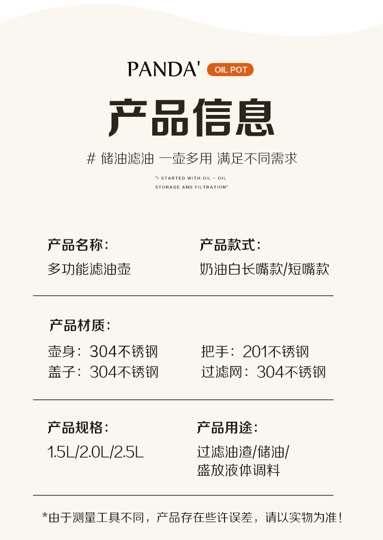 | Color Classification | Cream Panda [304 Stainless Steel] Extra Thick 1.5L Oil Dispenser (Includes Filter Mesh) - Holds Approximately 1.5kg Oil,Cream Panda [304 Stainless Steel] Extra Thick 2.0L Oil Dispenser (Includes Filter Mesh) - Holds Approximately 2kg Oil,Cream Panda [304 Stainless Steel] Extra-Thick 2.5L Oil Dispenser (Includes Filter Mesh) - Holds Approximately 2.5kg Oil,Cream Panda❤Extra Thick 1.5L Oil Pot + 304 Filter Basket (Comes with Filter Mesh) for Multi-Functional Use,Cream Panda❤Extra Thick 2.0L Oil Pot + 304 Filter Basket (Comes with Filter Mesh) for Multi-Functional Use,Cream Panda❤Extra Thick 2.5L Oil Pot + 304 Filter Basket (Comes with Filter Mesh) for Multi-Functional Use,Cream Panda [304 Stainless Steel Material] Extra Thick 1.5L❤Upgraded Long Mouth Model (Comes with Filter Mesh),Cream Panda [304 Stainless Steel Material] Extra Thick 2.0L❤Upgraded Long Mouth Model (Comes with Filter Mesh),Cream Panda [304 Stainless Steel Material] Extra Thick 2.5L❤Upgraded Long Mouth Model (Comes with Filter Mesh) |