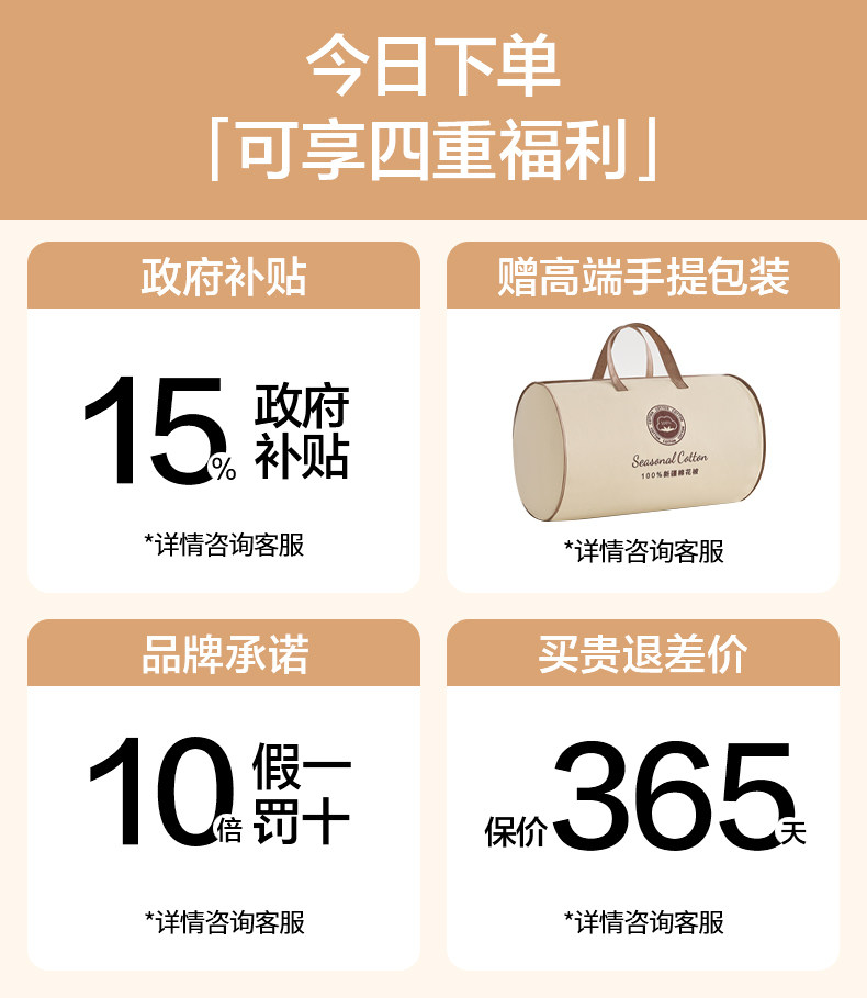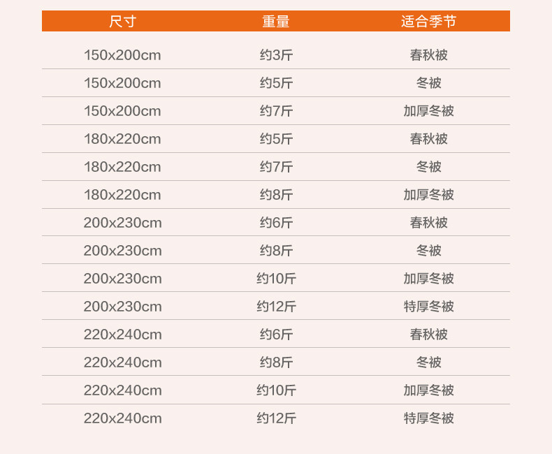 Size 【150X200Cm】Spring and Autumn Quilt 1.5kg (Suitable for Room Temperature 20℃(and Above) [Supports Quality Inspection, 10X Compensation for Fakes],[150X200Cm] Winter Quilt 2.5kg (Suitable for Room Temperature 8-20℃) [Support Quality Inspection, if You Get a Fake One, You Will Be Compensated 10%],[150X200Cm] Thickened Winter Quilt 3.5kg (Suitable for Room Temperature 0-8℃) [Support Quality Inspection, if You Get a Fake One, You Will Be Compensated 10%],【180X220Cm】Spring and Autumn Quilt 2.5kg (Suitable for Room Temperature 18℃(and Above) [Supports Quality Inspection, 10X Compensation for Fakes],【180X220Cm】Winter Quilt 3.5kg (Suitable for Room Temperature 8-18℃) [Support Quality Inspection, if You Get a Fake One, You Will Be Compensated 10%],[180X220Cm] Thickened Winter Quilt 4kg (Suitable for Room Temperature 0-8℃) [Support Quality Inspection, if You Get a Fake One, You Will Be Compensated 10%],【200X230Cm】Spring and Autumn Quilt 3kg (Suitable for Room Temperature 18℃(and Above) [Supports Quality Inspection, 10X Compensation for Fakes],[200X230Cm] Winter Quilt 4kg (Suitable for Room Temperature 8-18℃) [Support Quality Inspection, if You Get a Fake One, You Will Be Compensated 10%],[200X230Cm] Thickened Winter Quilt 5kg (Suitable for Room Temperature 0-8℃) [Support Quality Inspection, if You Get a Fake One, You Will Be Compensated 10%],【200X230Cm】Extra Thick Winter Quilt 6kg (Suitable for Room Temperature -10-0℃) [Support Quality Inspection, if You Get a Fake One, You Will Be Compensated 10%],【220X240Cm】Spring and Autumn Quilt 3kg (Suitable for Room Temperature 18℃(and Above) [Supports Quality Inspection, 10X Compensation for Fakes],【220X240Cm】Winter Quilt 4kg (Suitable for Room Temperature 8-18℃) [Support Quality Inspection, if You Get a Fake One, You Will Be Compensated 10%],[220X240Cm] Thickened Winter Quilt 5kg (Suitable for Room Temperature 0-8℃) [Support Quality Inspection, if You Get a Fake One, You Will Be Compensated 10%],【220X240Cm】Extra Thick Winter Quilt 6kg (Suitable for Room Temperature -10-0℃) [Support Quality Inspection, if You Get a Fake One, You Will Be Compensated 10%]