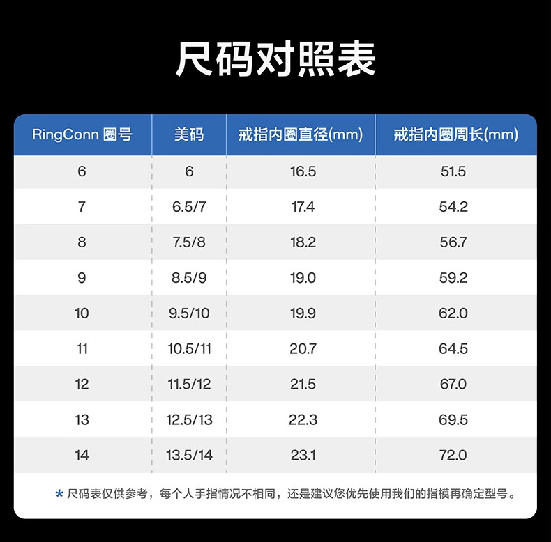 | Ring Size | If You Are Not Sure about the Size, Please Scroll down to the Details Page to Purchase a Fingerprint First,No. 6 (16.50mm),No. 7 (17.4mm),No. 8 (18.20mm),No. 9 (19.00mm),No. 10 (19.90mm),No. 11 (20.70mm),No. 12 (21.50mm),No. 13 (22.30mm),No. 14 (23.10mm) |