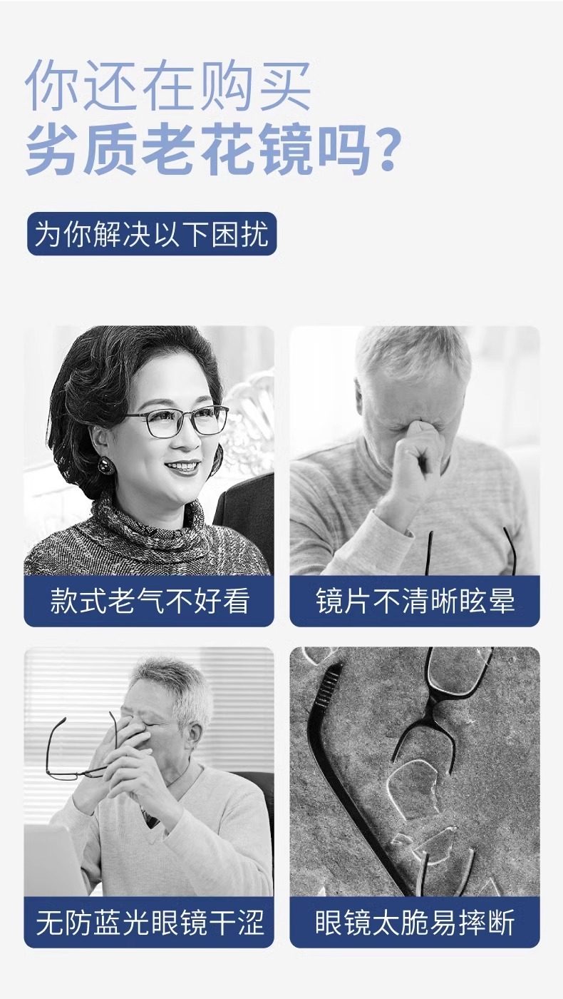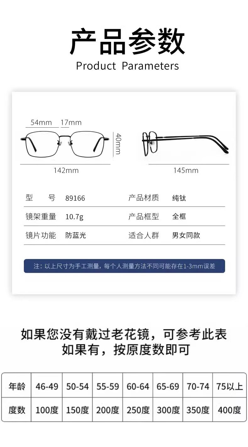 | Lens Refractive Index | [Anti-Blue Light Presbyopia +100 Degrees] Recommended for Those under 50 Years Old,[Anti-Blue Light Presbyopia +150 Degrees] Recommended for 51-55 Years Old,[Anti-Blue Light Presbyopia +200 Degrees] Recommended for 56-60 Years Old,[Anti-Blue Light Presbyopia +250 Degrees] Recommended for 61-65 Years Old,[Anti-Blue Light Presbyopia +300 Degrees] Recommended for 66-70 Years Old,[Anti-Blue Light Presbyopia +350 Degrees] Recommended for 71-75 Years Old,[Anti-Blue Light Presbyopia +400 Degrees] Recommended for Those over 75 Years Old |