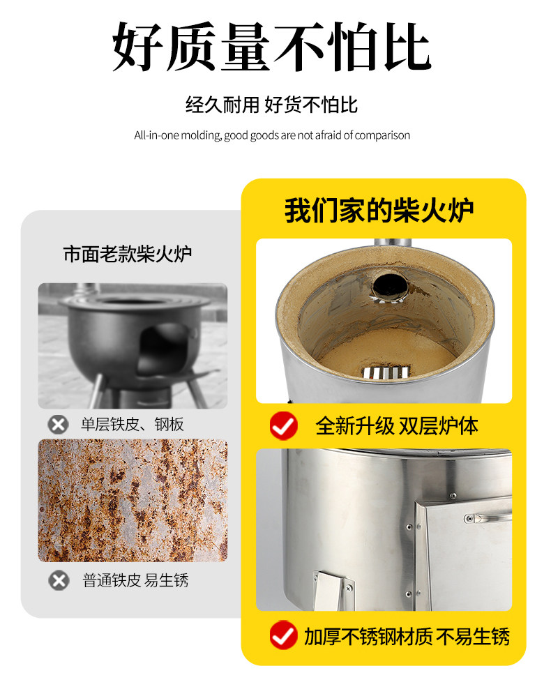 | Color Classification | Stainless Steel Wood Stove [Single Layer Standard - Pot Not Included],Stainless Steel Wood Stove [Single Layer Standard + Pot Ring - Pot Not Included],Stainless Steel Wood Stove [Single Layer Standard + Pot Ring + Stainless Steel Grill - Pot Not Included],Stainless Steel Wood Stove [Single Layer Standard Includes 45cm Iron Pot],Stainless Steel Wood Stove [Single Layer Standard Includes 45cm Iron Pot + Pot Ring],Stainless Steel Wood Stove [Single Layer Standard Includes 45cm Iron Pot + Pot Ring + Stainless Steel Grill],Stainless Steel Wood Stove [Single Layer Standard Includes 50cm Iron Pot],Stainless Steel Wood Stove [Single Layer Standard Includes 50cm Iron Pot + Pot Ring],Stainless Steel Wood Stove [Single Layer Standard Includes 50cm Iron Pot + Pot Ring + Grill],Stainless Steel Wood Stove [Double-Layer Insulation - Pot Not Included],Stainless Steel Wood Stove [Double-Layer Insulation + Pot Ring - Pot Not Included],Stainless Steel Wood Stove [Double-Layer Insulation + Pot Ring + Stainless Steel Grill - Pot Not Included],Stainless Steel Wood Stove [Double-Layer Insulation Including 50cm Pot],Stainless Steel Wood Stove [Double-Layer Insulation Including 50cm Pot + Pot Ring],Stainless Steel Wood Stove [Double-Layer Insulation Including 50cm Pot + Pot Ring + Lid],Stainless Steel Wood Stove [Double-Layer Insulation Including 55cm Pot],Stainless Steel Wood Stove [Double-Layer Insulation Including 55cm Pot + Pot Ring],Stainless Steel Wood Stove [Double-Layer Insulation Including 55cm Pot + Pot Ring + Lid],Stainless Steel Wood Stove [Double-Layer Insulation Including 60cm Pot],Stainless Steel Wood Stove [Double-Layer Insulation Including 60cm Pot + Pot Ring],Stainless Steel Wood Stove [Double-Layer Insulation Including 60cm Pot + Pot Ring + Lid],Due to the Varying Shipping Costs for Bulky Items, Free Shipping Is Not Offered on This Product. Please Contact Customer Service before Placing Your Order. Orders Placed Without Prior Consultation Will Not Be Shipped |