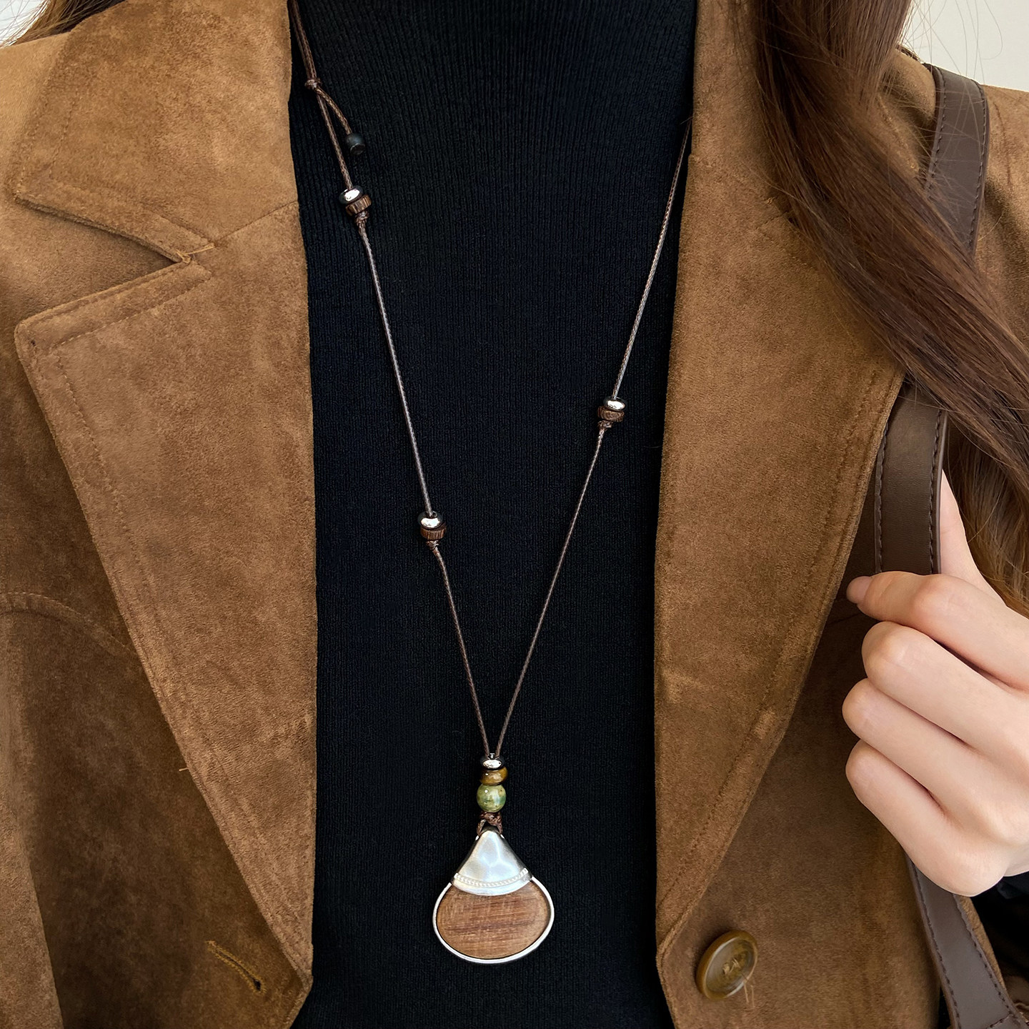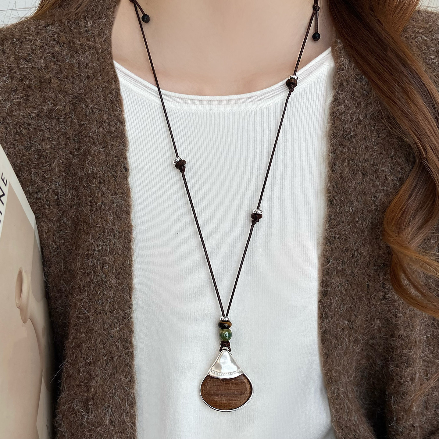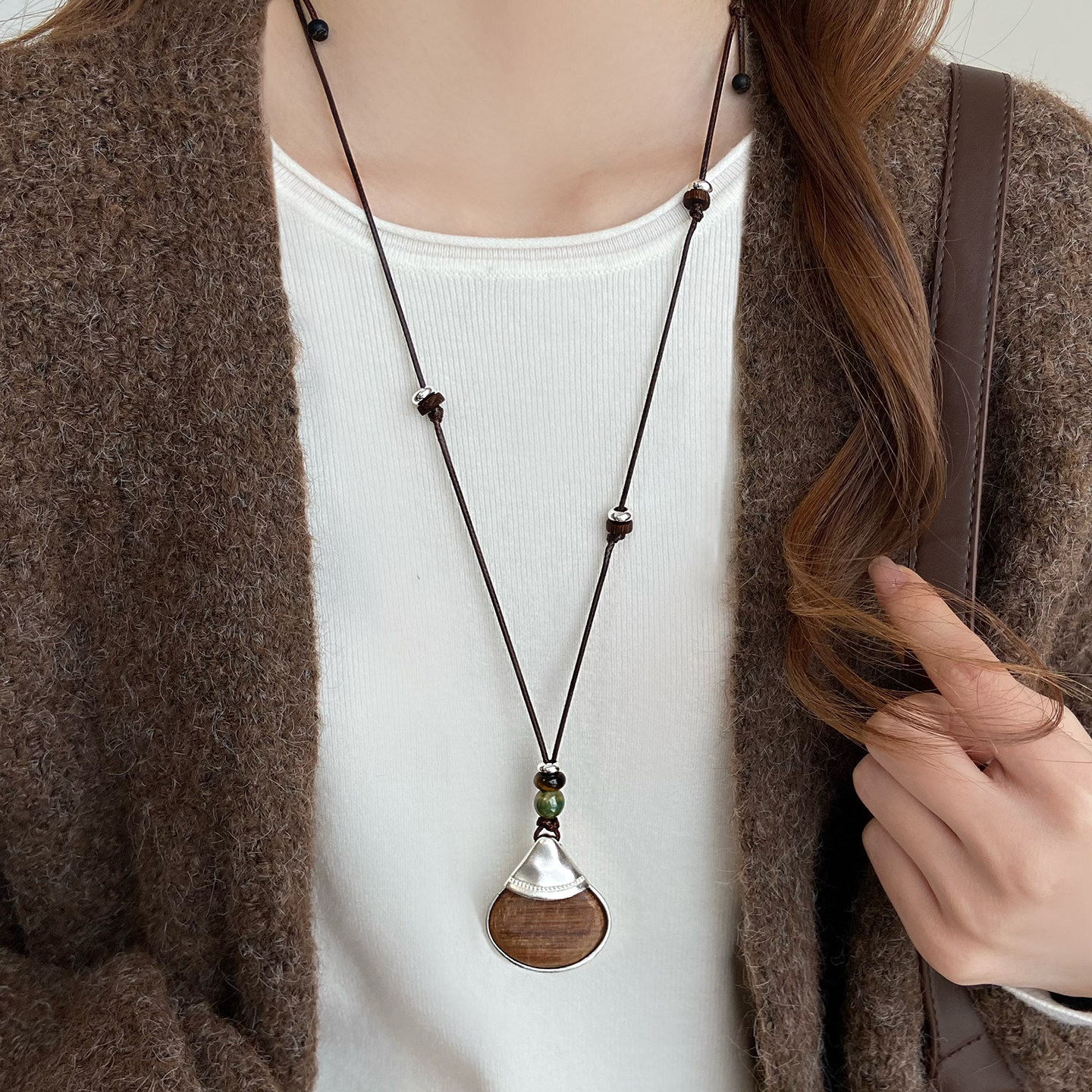 Brown Long Leather Cord Sweater Necklace Sweater Chain Autumn and Winter Versatile Elegant High-End Light Luxury Niche Accessory for Women