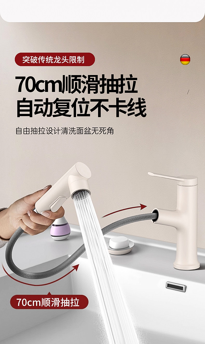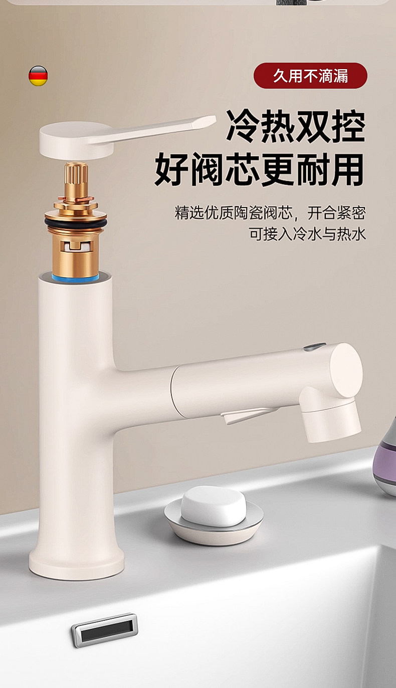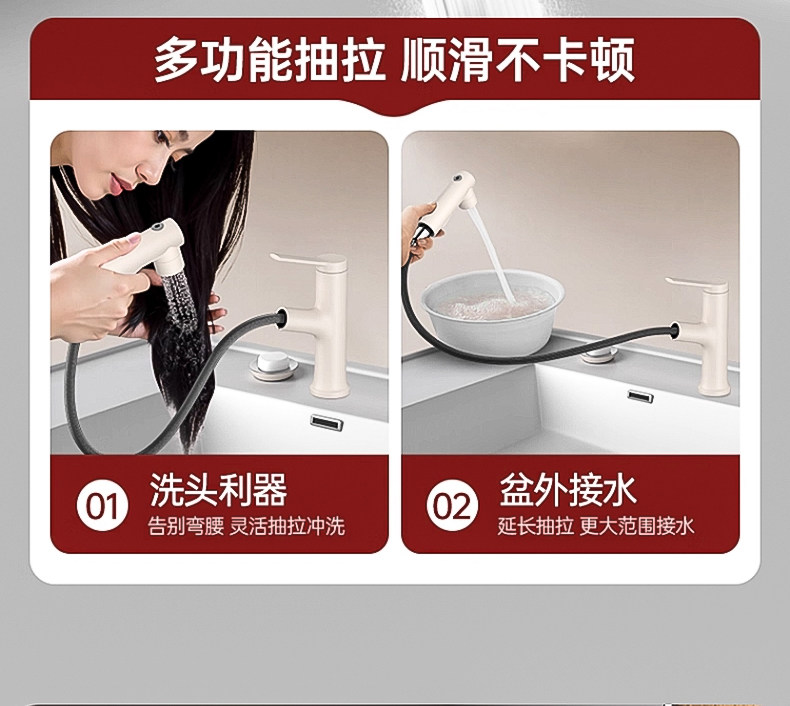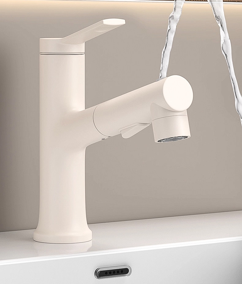 Copper Washbasin Faucet with Pull-Out Spout, Dual-Use for Hot and Cold Water, Suitable for Bathroom Vanity Countertop, Household Use