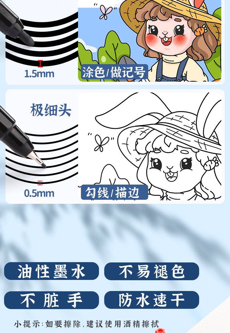 Morning Light Outlining Pen, Art-Specific Marker Pen for Children and Elementary Students, Oil-Based Black, Waterproof, Oil-Resistant, Non-Fading, Dual-Tip, Thick and Thin Ends, Water-Based, Kindergarten Drawing and Outlining Pen, Quick-Drying Marker Pen
