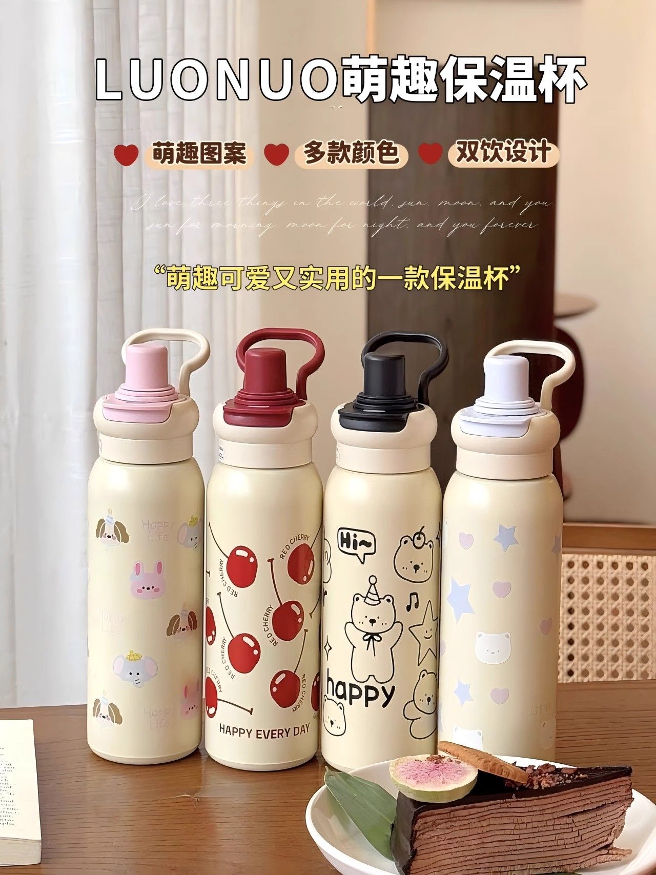 Luonuo Double-Drink Insulated Cup for Women, Straw Cup, Portable Travel Sports Water Bottle, Official Genuine Product