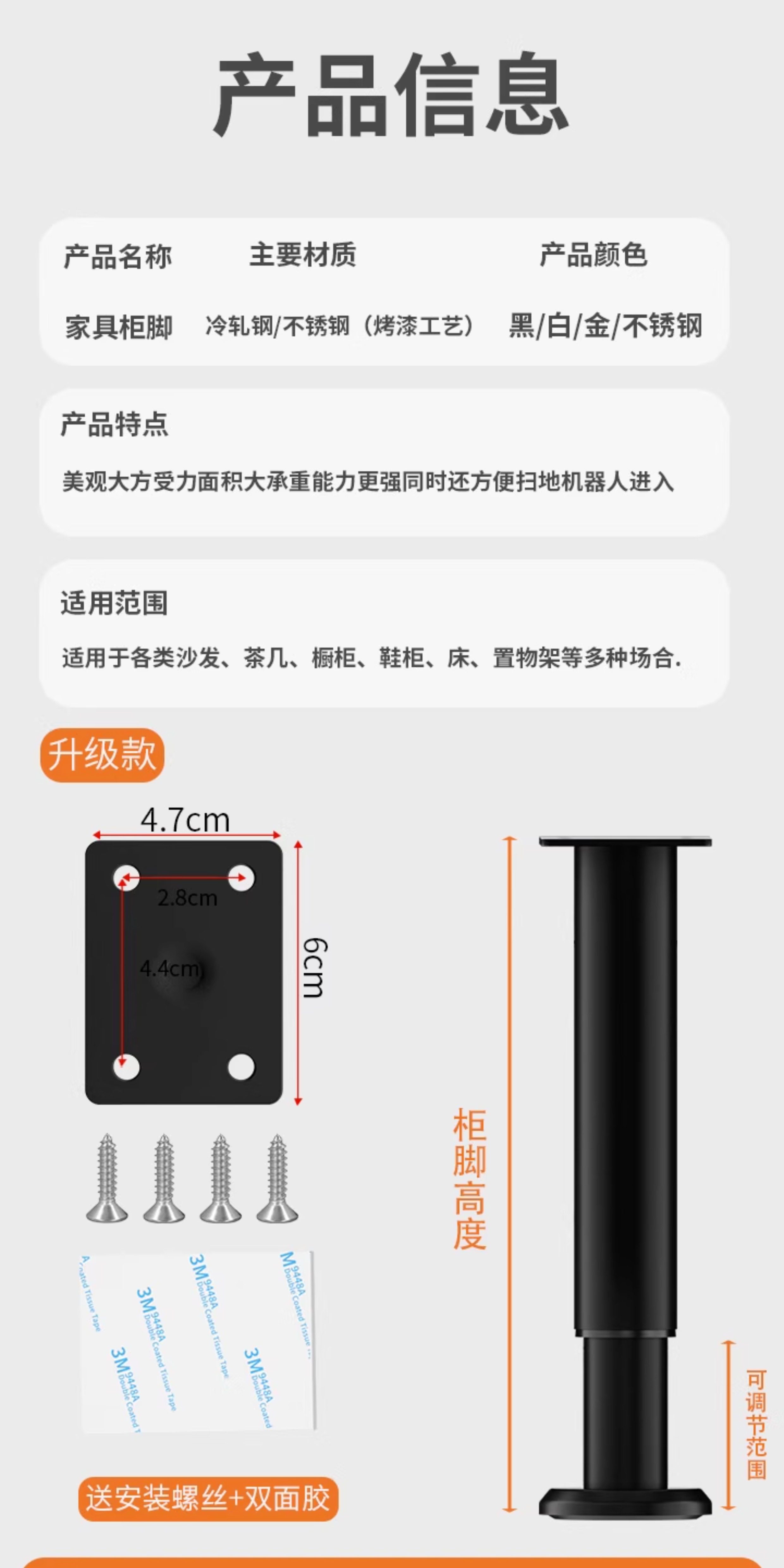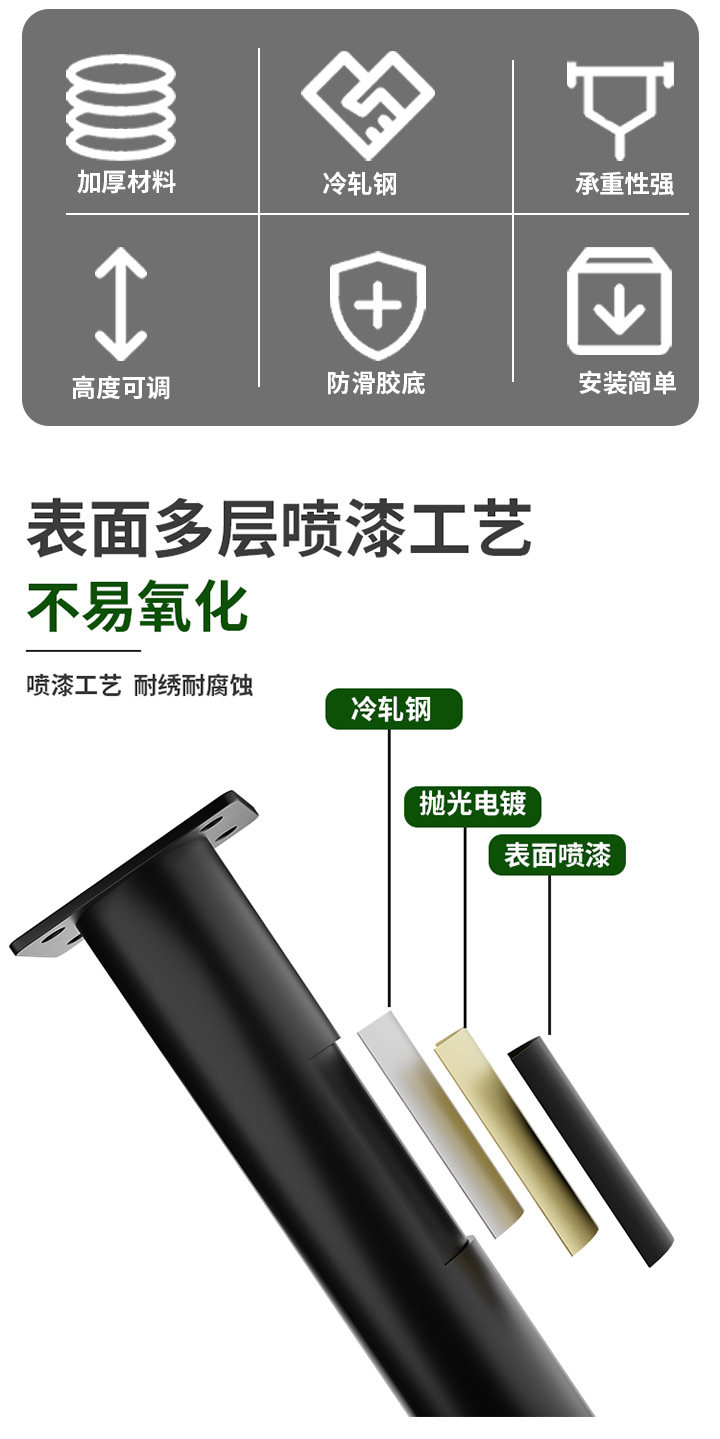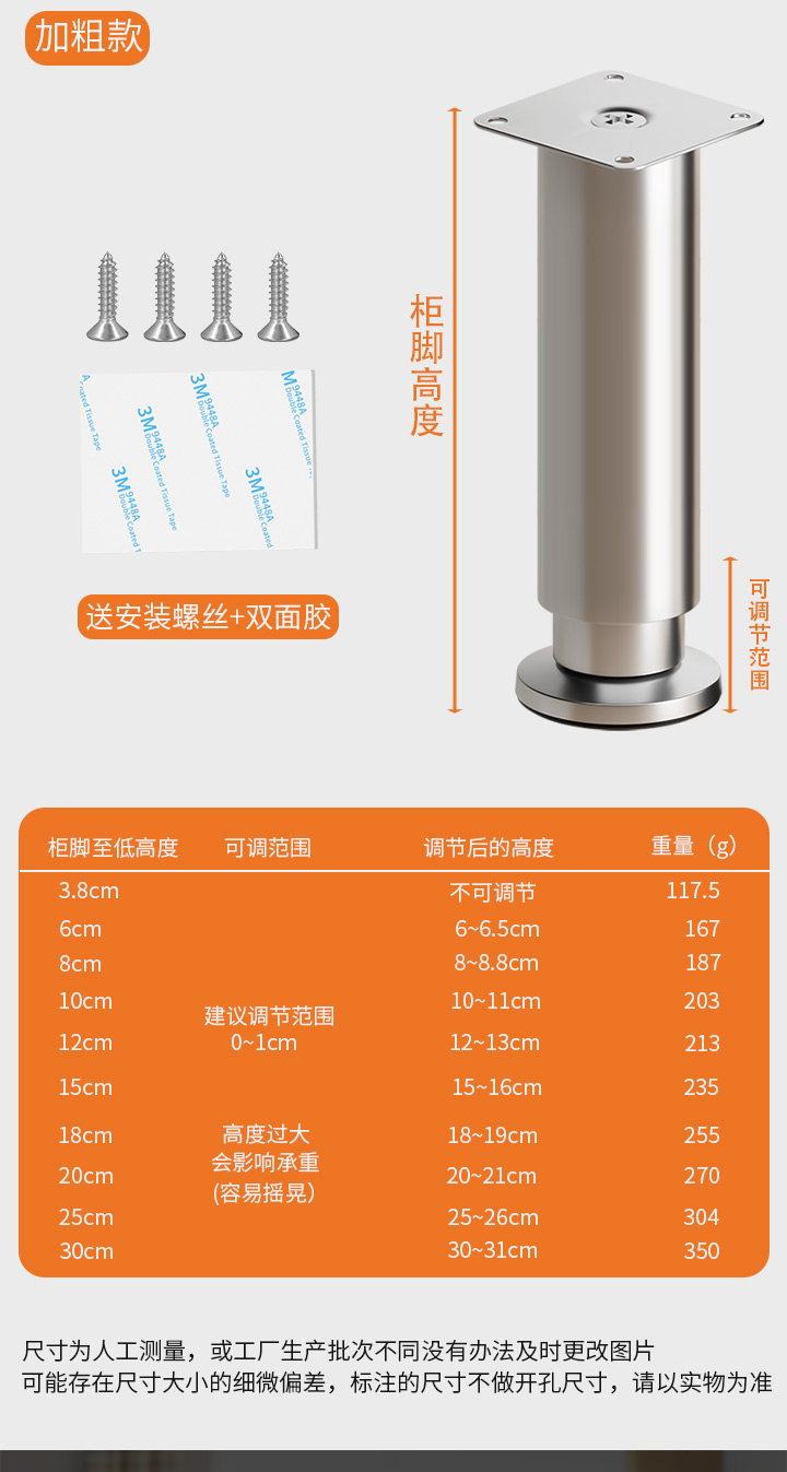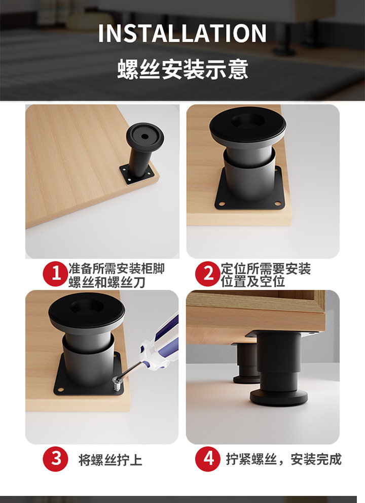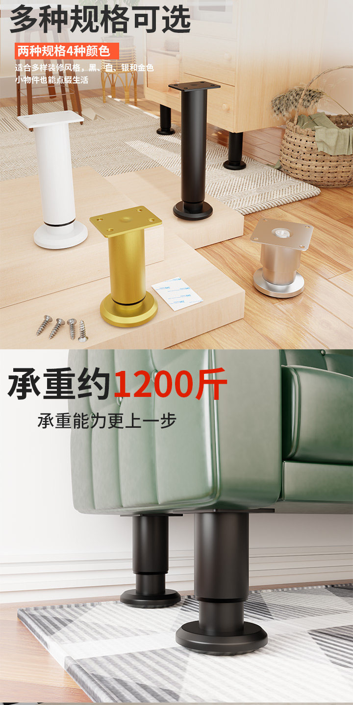 | Color Classification | Free Gift: Each Furniture Leg Comes with 4 Standard Screws + Adhesive Backing,Free Gift: Buy 4 Furniture Legs and Get a Free Solid Screwdriver (One Per Customer Id),[Pack of 4] Black/Stainless Steel [Height 3.8cm] Load-Bearing 600kg,[Pack of 4] Black/Stainless Steel [Height 6-6.5cm] Load-Bearing 600kg,[Pack of 4] Black/Cold-Rolled Steel [Height 5-6.5cm] Can Bear 500kg,[Pack of 4] Black/Cold-Rolled Steel [Height 6-8.5cm] Can Bear 500kg,[Pack of 4] Black/Cold-Rolled Steel [Height 8-12cm] Can Bear 500kg,[Pack of 4] Black/Cold-Rolled Steel [Height 10-15cm] Can Bear 500kg,[Pack of 4] Black/Cold-Rolled Steel [Height 12-18cm] Can Bear 500kg,[Pack of 4] Black/Cold-Rolled Steel [Height 15-25cm] Can Bear 500kg,[Pack of 4] Black/Cold-Rolled Steel [Height 18-30cm] Can Bear 500kg,[Pack of 4] Black/Cold-Rolled Steel [Height 25-42cm] Can Bear 500kg,[Pack of 4] Black/Cold-Rolled Steel [Height 38-70cm] Can Bear 500kg,[Pack of 4] Black/Cold-Rolled Steel [Height 42-72cm] Can Bear 500kg,[Pack of 4] Black/Cold-Rolled Steel [Height 55-100cm] Can Bear 500kg,[Pack of 4] Black/Cold-Rolled Steel [Height 72-110cm] Can Bear 500kg,[Pack of 4] White/Cold-Rolled Steel [Height 6-8.5cm] Can Bear 500kg,[Pack of 4] White/Cold-Rolled Steel [Height 8-12cm] Can Bear 500kg,[Pack of 4] White/Cold-Rolled Steel [Height 10-15cm] Can Bear 500kg,[Pack of 4] White/Cold-Rolled Steel [Height 12-18cm] Can Bear 500kg,[Pack of 4] White/Cold-Rolled Steel [Height 15-25cm] Can Bear 500kg,[Pack of 4] White/Cold-Rolled Steel [Height 18-30cm] Can Bear 500kg,[Pack of 4] White/Cold-Rolled Steel [Height 25-42cm] Can Bear 500kg,[Pack of 4] White/Cold-Rolled Steel [Height 38-70cm] Can Bear 500kg,[Pack of 4] White/Cold-Rolled Steel [Height 42-72cm] Can Bear 500kg,[Pack of 4] White/Cold-Rolled Steel [Height 55-100cm] Can Bear 500kg,[Pack of 4] White/Cold-Rolled Steel [Height 72-110cm] Can Bear 500kg,[Pack of 4] Steel Color/Stainless Steel [Height 6-8.5cm] Can Bear 600kg,[Pack of 4] Steel Color/Stainless Steel [Height 8-12cm] Can Bear 600kg,[Pack of 4] Steel Color/Stainless Steel [Height 10-15cm] Can Bear 600kg,[Pack of 4] Steel Color/Stainless Steel [Height 12-18cm] Can Bear 600kg,[Pack of 4] Steel Color/Stainless Steel [Height 15-25cm] Can Bear 600kg,[Pack of 4] Steel Color/Stainless Steel [Height 18-30cm] Can Bear 600kg,[Pack of 4] Steel Color/Stainless Steel [Height 25-42cm] Can Bear 600kg,[Pack of 4] Steel Color/Stainless Steel [Height 38-70cm] Can Bear 600kg,[Pack of 4] Steel Color/Stainless Steel [Height 42-72cm] Can Bear 600kg,[Pack of 4] Steel Color/Stainless Steel [Height 55-100cm] Can Bear 600kg,[Pack of 4] Steel Color/Stainless Steel [Height 72-110cm] Can Bear 600kg,[Pack of 4] Black/Stainless Steel [Height 8-8.8cm] Load-Bearing 600kg,[Pack of 4] Black/Stainless Steel [Height 10-11cm] Load-Bearing 600kg,[Pack of 4] Black/Stainless Steel [Height 12-13cm] Load-Bearing 600kg,[Pack of 4] Black/Stainless Steel [Height 15-16cm] Load-Bearing 600kg,[Pack of 4] Black/Stainless Steel [Height 18-19cm] Load-Bearing 600kg,[Pack of 4] Black/Stainless Steel [Height 20-21cm] Load-Bearing 600kg,[Pack of 4] Black/Stainless Steel [Height 25-26cm] Load-Bearing 600kg,[Pack of 4] Black/Stainless Steel [Height 30-31cm] Loadable 600kg,[Pack of 4] Silver/Stainless Steel [Height 3.8cm] Load-Bearing 600kg,[Pack of 4] Silver/Stainless Steel [Height 6-6.5cm] Load-Bearing 600kg,[Pack of 4] Silver/Stainless Steel [Height 8-8.8cm] Load-Bearing 600kg,[Pack of 4] Silver/Stainless Steel [Height 10-11cm] Load-Bearing 600kg,[Pack of 4] Silver/Stainless Steel [Height 12-13cm] Load-Bearing 600kg,[Pack of 4] Silver/Stainless Steel [Height 15-16cm] Load-Bearing 600kg,[Pack of 4] Silver/Stainless Steel [Height 18-19cm] Load-Bearing 600kg,[Pack of 4] Silver/Stainless Steel [Height 20-21cm] Load-Bearing 600kg,[Pack of 4] Silver/Stainless Steel [Height 25-26cm] Load-Bearing 600kg,[Pack of 4] Silver/Stainless Steel [Height 30-31cm] Loadable 600kg,[Pack of 4] Gray/Cold-Rolled Steel [Height 6-8.5cm] Can Bear 500kg,[Pack of 4] Gray/Cold-Rolled Steel [Height 8-12cm] Can Bear 500kg,[Pack of 4] Gray/Cold-Rolled Steel [Height 12-18cm] Can Bear 500kg,[Pack of 4] Gray/Cold-Rolled Steel [Height 18-30cm] Can Bear 500kg,[Pack of 4] Gray/Cold-Rolled Steel [Height 25-42cm] Can Bear 500kg,[Pack of 4] Gold/Cold Rolled Steel [Height 6-8.5cm] Load-Bearing 500kg,[Pack of 4] Gold/Cold Rolled Steel [Height 8-12cm] Load-Bearing 500kg,[Pack of 4] Gold/Cold Rolled Steel [Height 12-18cm] Load-Bearing 500kg,[Pack of 4] Gold/Cold Rolled Steel [Height 18-30cm] Load-Bearing 500kg,[Pack of 4] Gold/Cold Rolled Steel [Height 25-42cm] Load-Bearing 500kg,[Pack of 4] Gold/Cold Rolled Steel [Height 42-72cm] Can Bear 500kg,[Pack of 4] Gold/Cold Rolled Steel [Height 72-110cm] Load-Bearing 500kg |