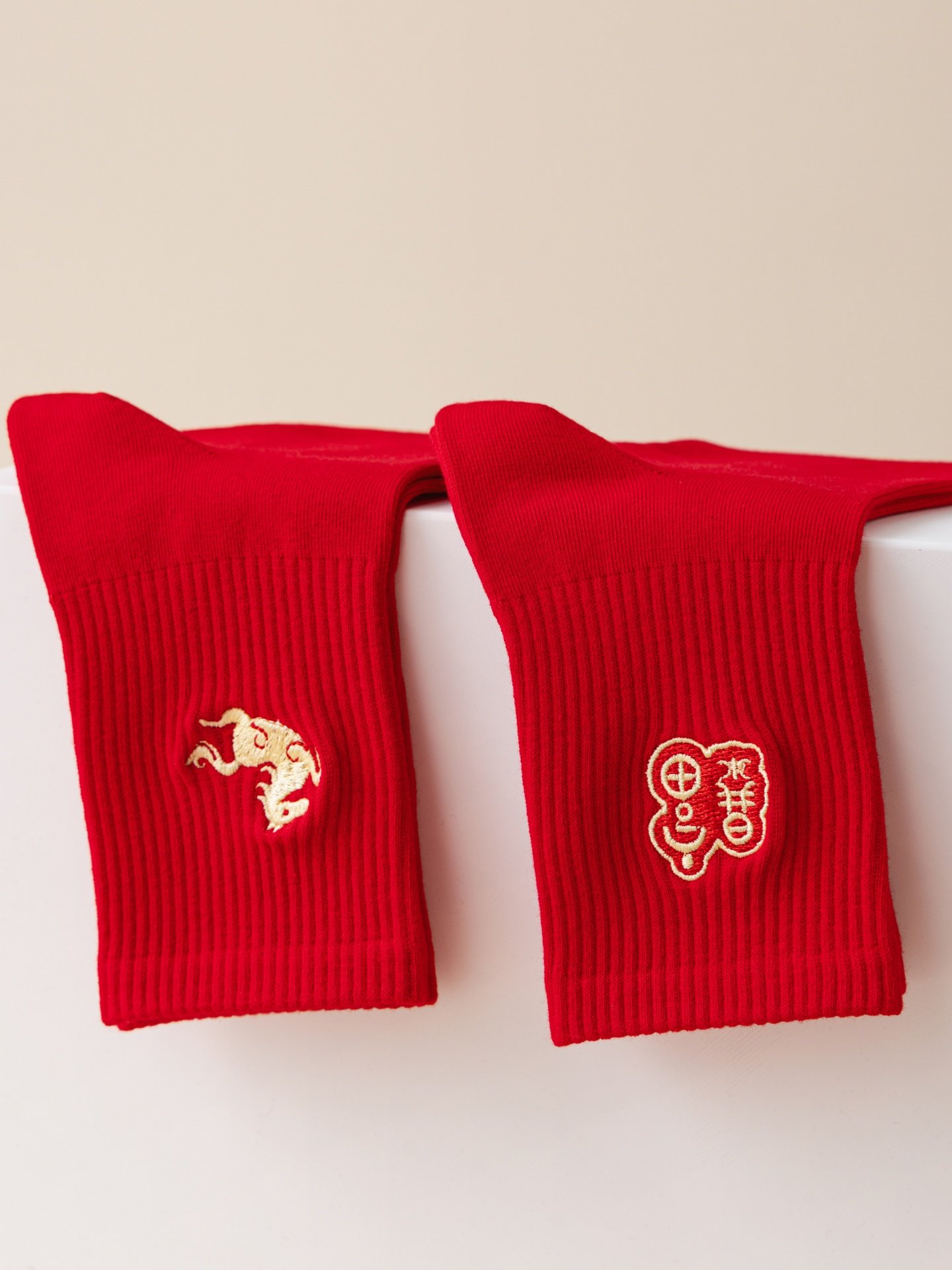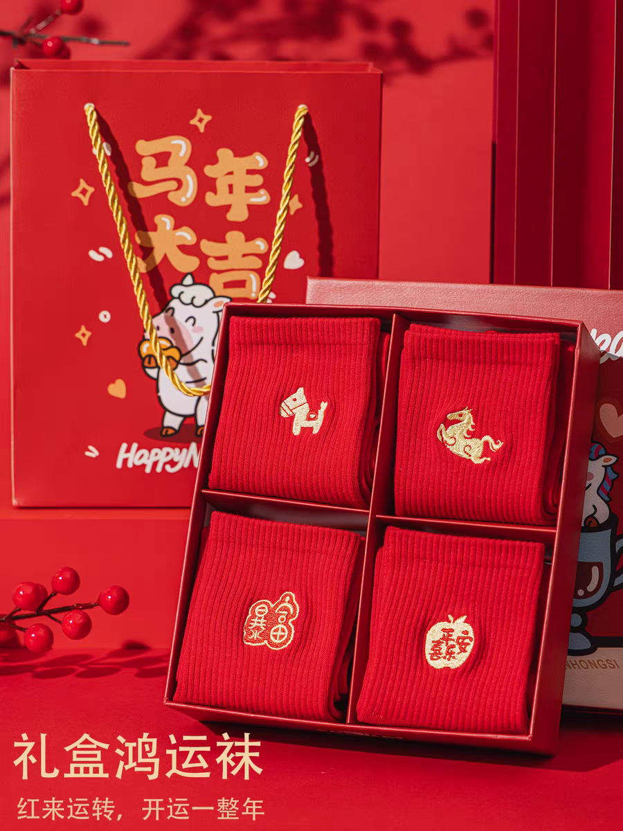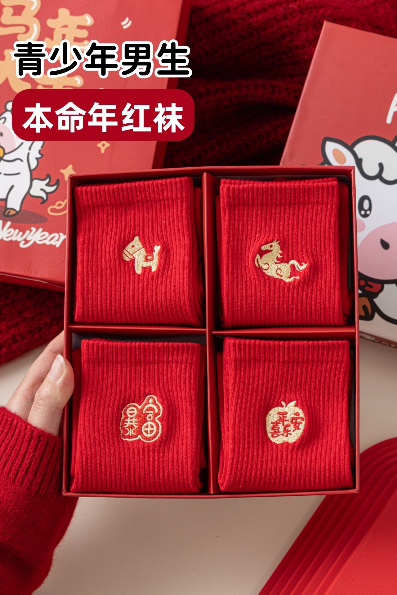 Red Socks for Men, Zodiac Year, Pure Cotton, 2026 Year of the Horse, Mid-Calf, New Year, Embroidered Red Socks for Men Born in the Year of the Horse, Gift Box Set