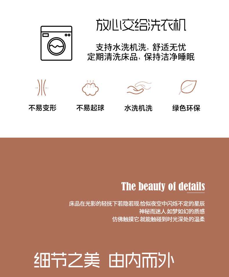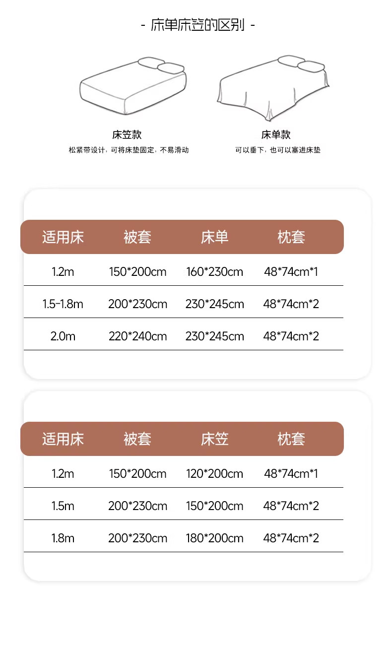 | Applicable Bed Size | 0.9m Bed Sheet Three-Piece Set [Suitable for Student Dormitory Beds 90X200Cm],1.2m Three-Piece Set [Quilt Cover 150X200Cm Sheets 160X230Cm Pillowcase 48*74cm*1],1.5m Four-Piece Set [Quilt Cover 200X230Cm Sheets 230X250Cm Pillowcase 48X74Cm*2],1.8m Four-Piece Set [Quilt Cover 200X230Cm, Bed Sheet 230X250Cm, Pillowcase 48X74Cm*2],2.0m Four-Piece Set [Quilt Cover 220X240Cm Sheets 270X250Cm Pillowcase 48*74cm*2],1.5m Fitted Sheet Set of Four [Quilt Cover 200*230cm Fitted Sheet 150*200cm Pillowcase 48*74cm*2],1.8m Fitted Sheet Set of Four [Quilt Cover 200*230cm Fitted Sheet 180*200cm Pillowcase 48*74cm*2] |