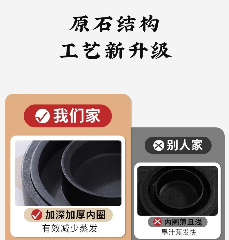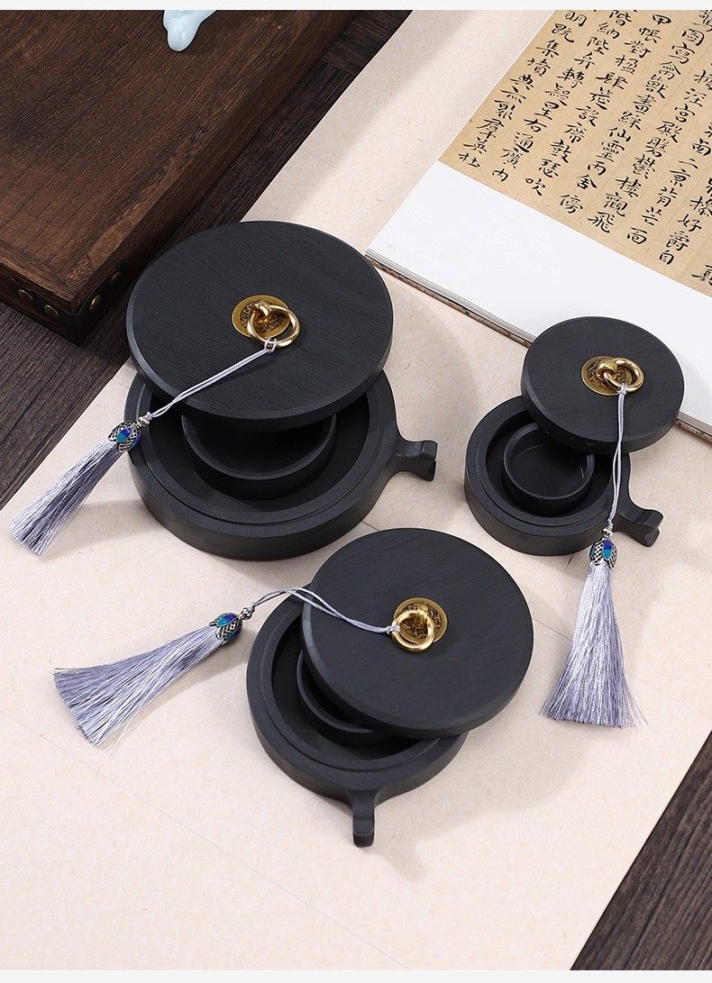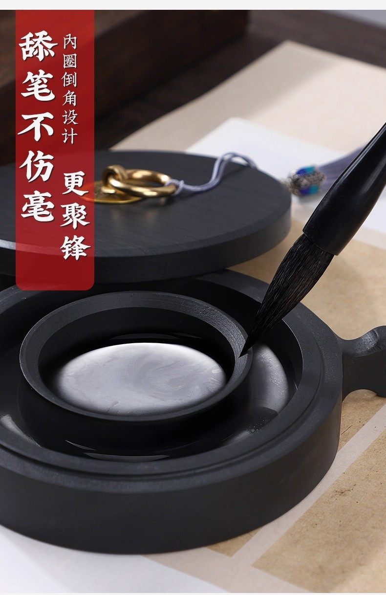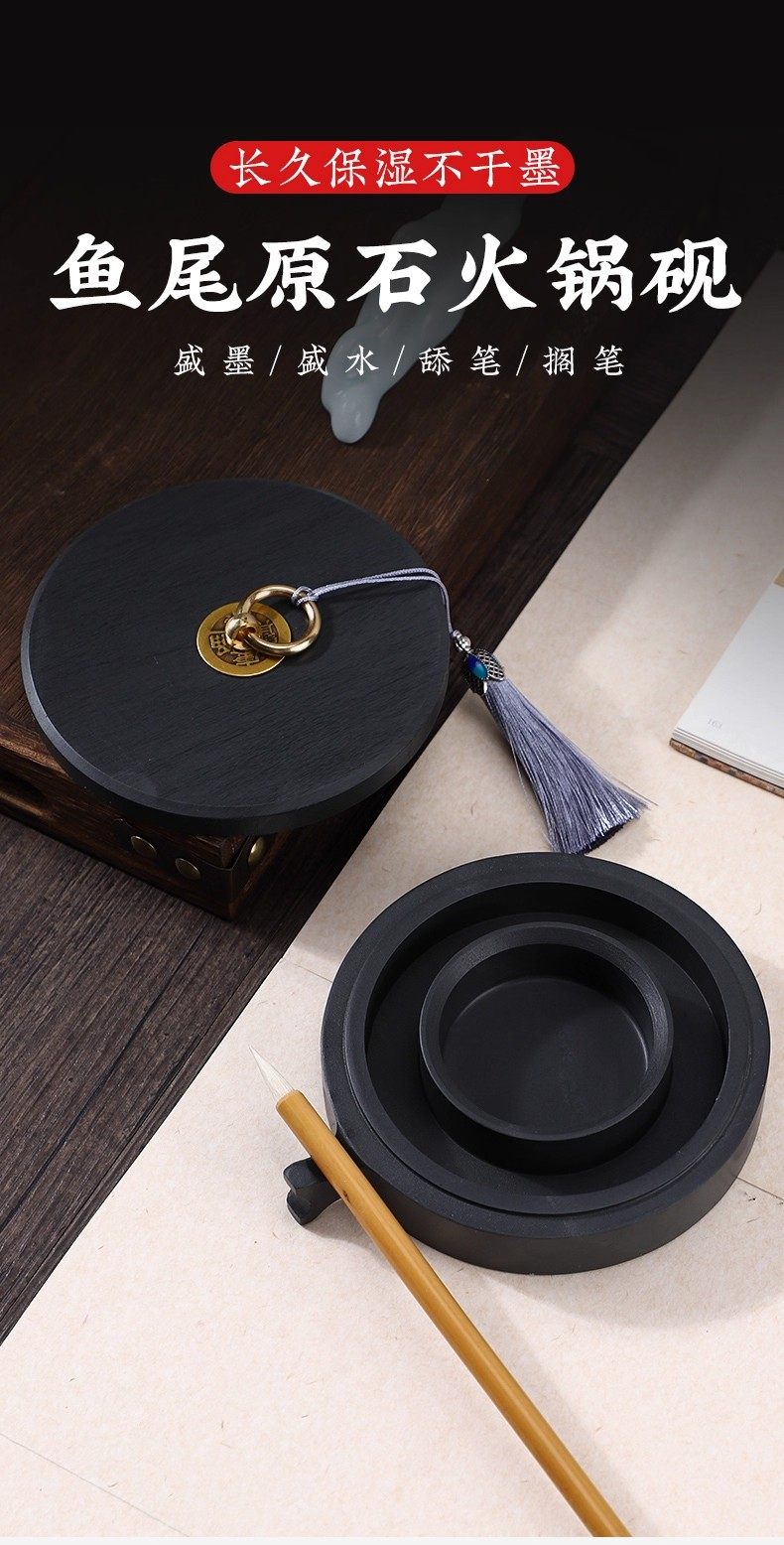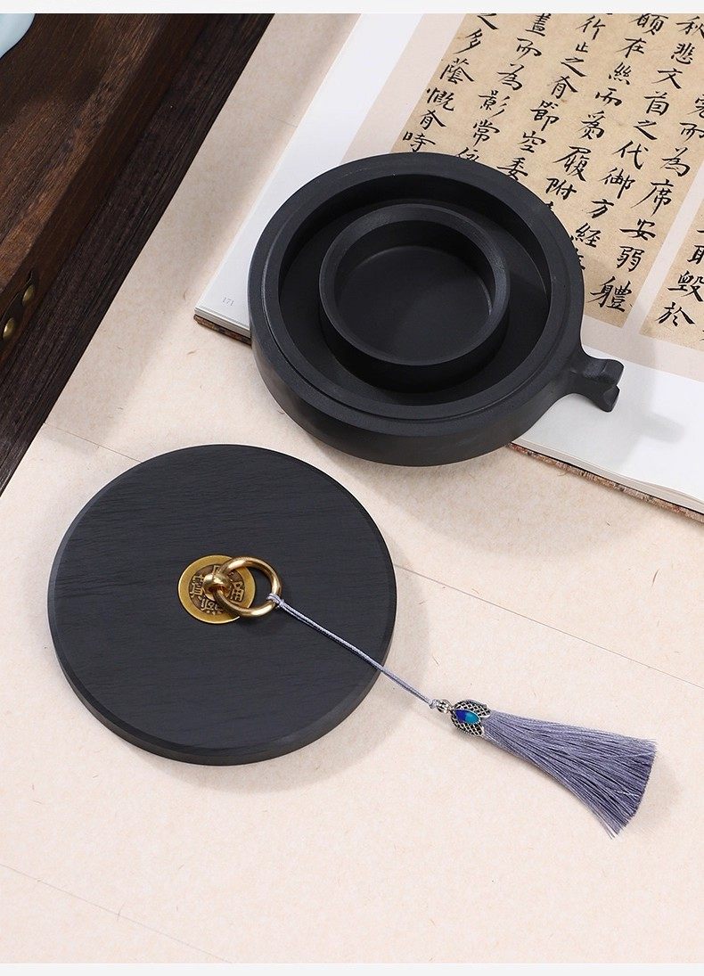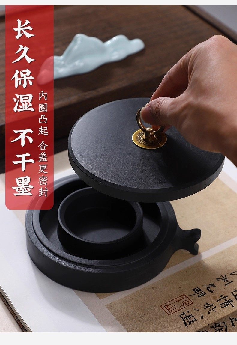 Hotpot Inkstone with Double Circles for Moisturizing and Preventing Ink from Drying Out, Inkstone for Calligraphy with a Lid, Inkwell with a Patterned Surface