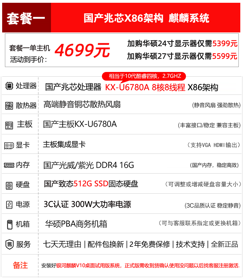 | Package Type | Domestic Information Technology Single-Host Computer,Host + Moore Threads S50 8g Dedicated Graphics, Kirin System,Host + Moore Threads X300 16Gb Dedicated Graphics, Harmonyos |