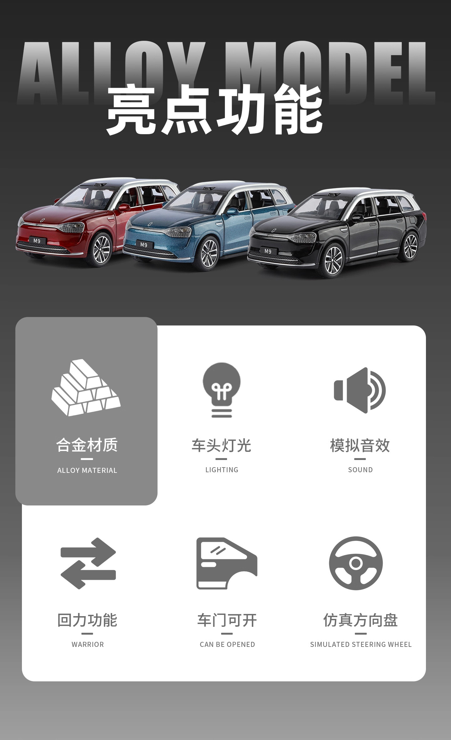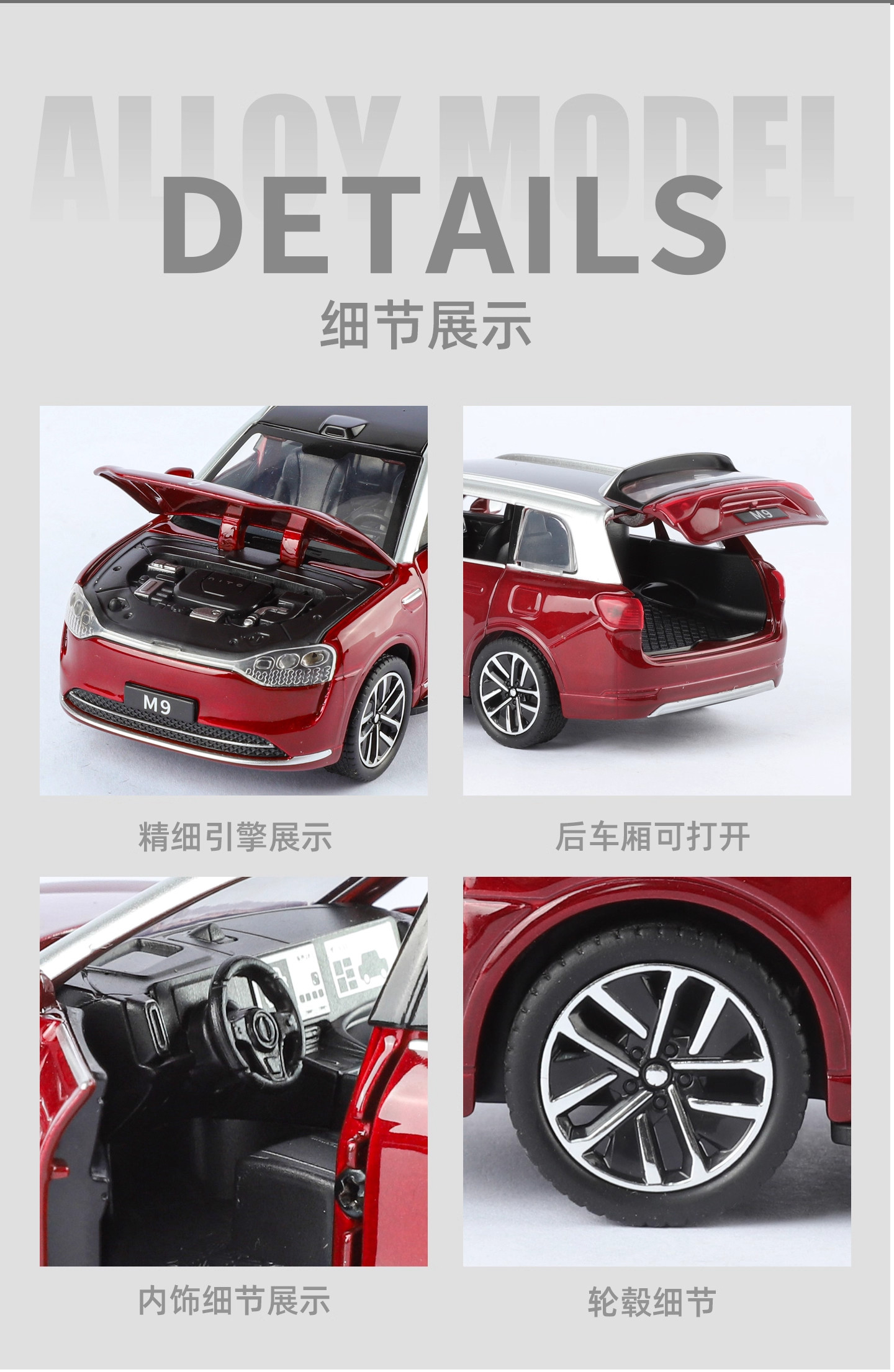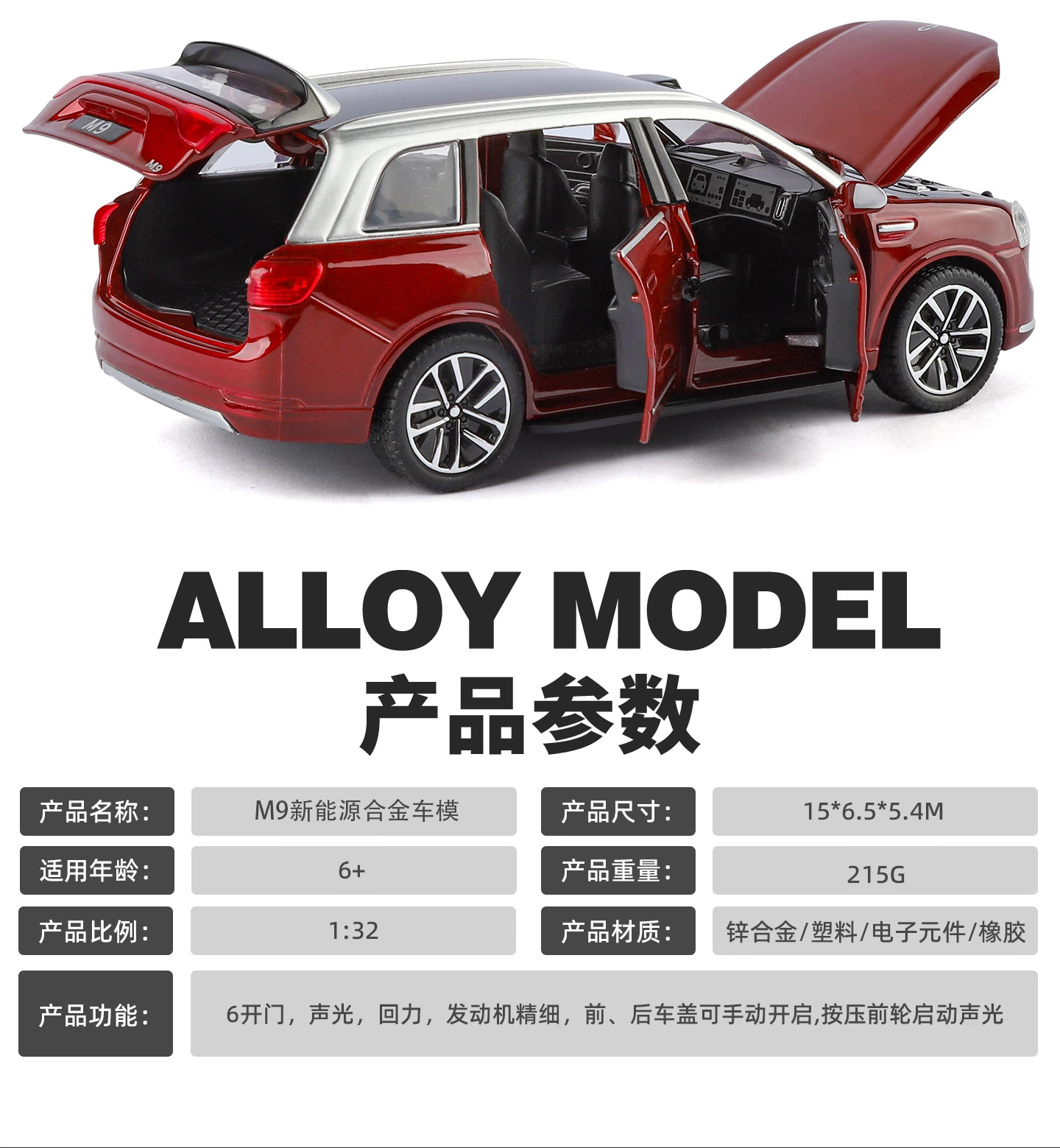 | Color Classification | 1:32 Wenjie M9 Black [Free Base],1:32 Wenjie M9 Blue [Free Base],1:32 Wenjie M9 Red [Free Base],1:32 Ideal L9 Black [Free Base],1:32 Ideal L9 Gray [Free Base],1:32 Ideal L9 Green [Free Base],1:32 Looking up at U8 [Cyan] Comes with a Base,1:32 Looking up at U8 [Black] Comes with a Base,1:32 Looking up at U8 [White] Comes with a Base |