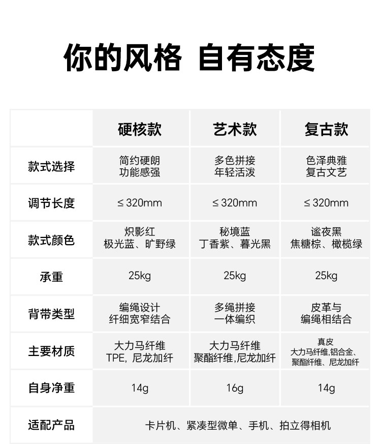 | Color Classification | Camera Wrist Strap Slim (Retro Style-Caramel Brown),Camera Wrist Strap Slim (Retro Style-Olive Green),Camera Wrist Strap Slim (Retro Style - Midnight Black),Camera Wrist Strap Slim (Art Style-Secret Blue),Camera Wrist Strap Slim (Art Style-Lilac Purple),Camera Wrist Strap Slim (Art Style-Twilight Black),Camera Wrist Strap Slim (Hardcore Edition - Aurora Blue),Camera Wrist Strap Slim (Hardcore Edition - Wilderness Green),Camera Wrist Strap Slim (Hardcore Edition - Fiery Red) |