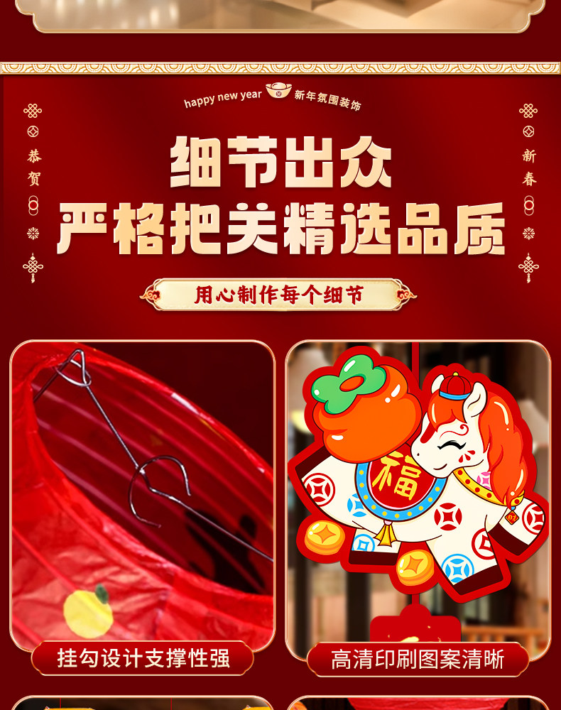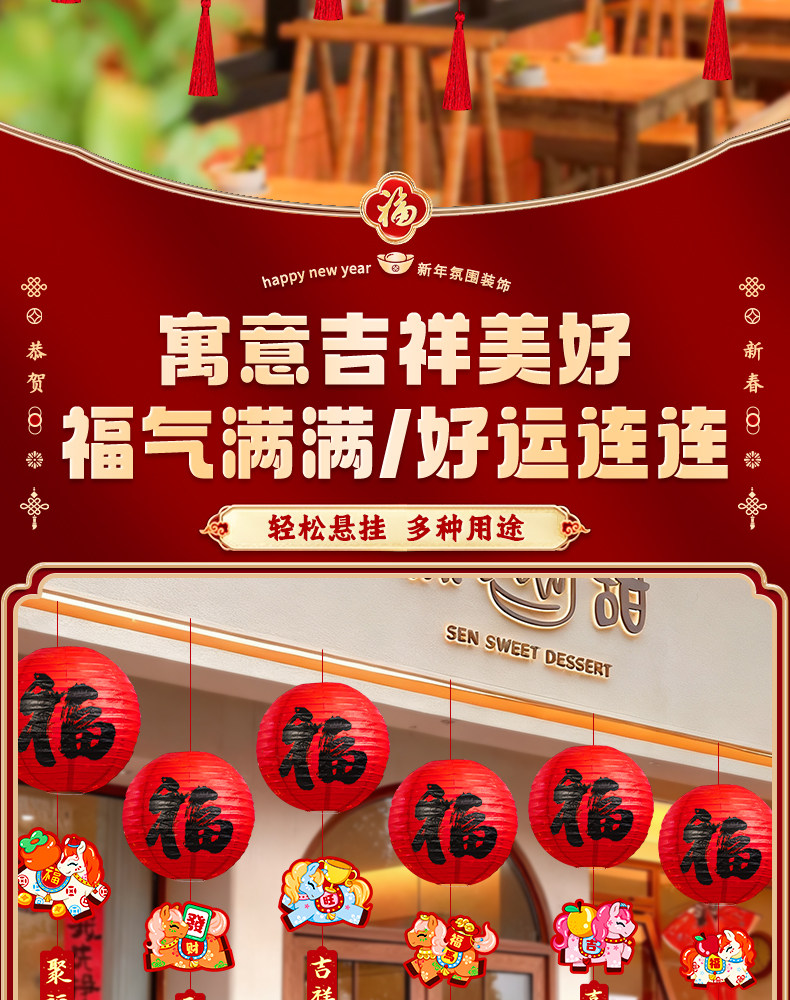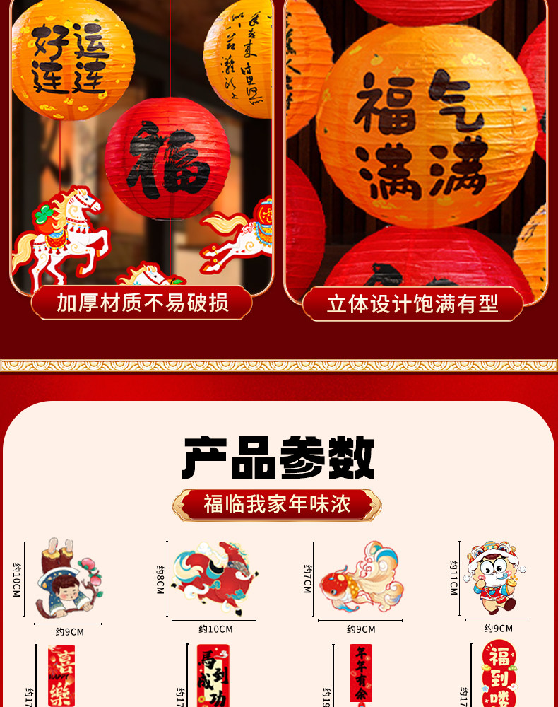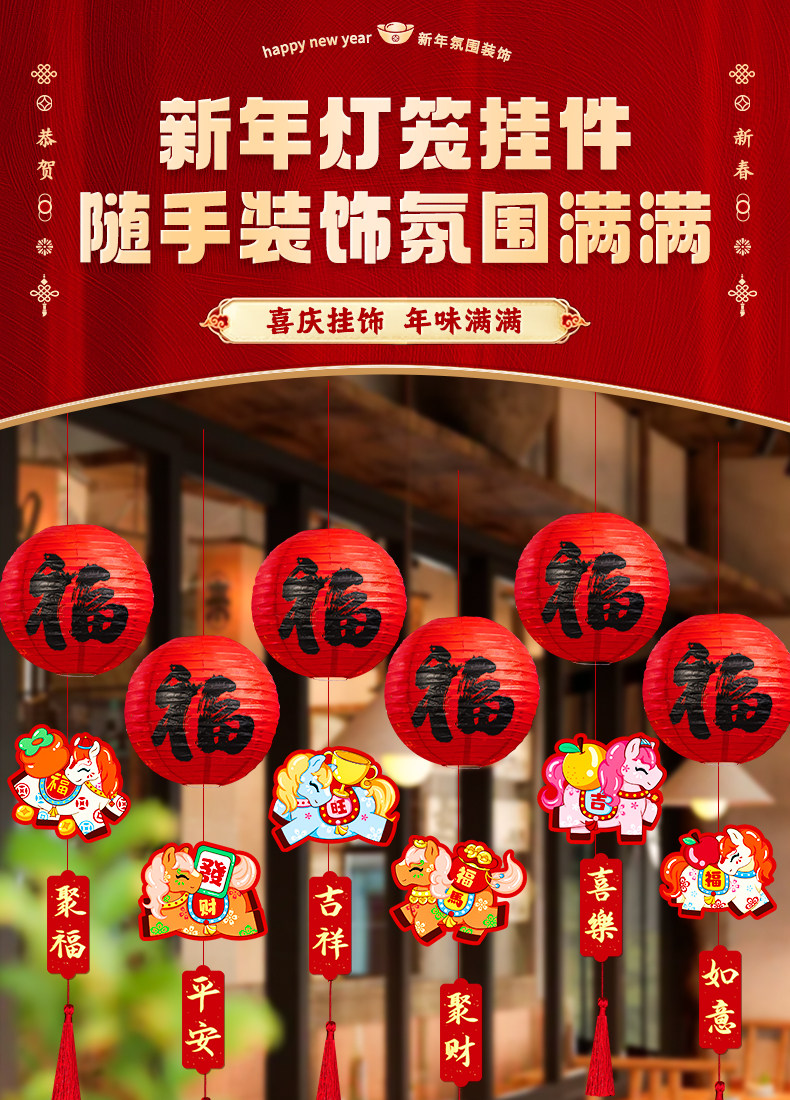 | Color Classification | 6 "Fu" Character Lanterns + 6 "Gathering Fortune & Wealth" Ornaments,6 "Fu" Character Lanterns + 6 Golden Horse New Year Ornaments,6 "Fu" Character Lanterns + 6 Auspicious & Prosperous Ornaments,6 "Fu" Character Lanterns + 6 "Happy New Year" Decorations,6 "Fu" Character Lanterns + 6 "Good Fortune & Wealth Arrival" Hanging Ornaments,6 "Fu" Character Lanterns + 6 "Fortune Horse" Spring Festival Ornaments,6 "Fu" Character Lanterns + 6 New Year's Decorations,6 "Fu" Character Lanterns + 6 "Abundance Year after Year" Ornaments,6 "Fu" Character Lanterns + 6 Auspicious New Year Ornaments,Mixed Lanterns (6 Pieces) + Fortune & Wealth Ornaments (6 Pieces),Mixed Lanterns (6 Pieces) + Golden Horse New Year Ornament (6 Pieces),Mixed Lanterns (6 Pieces) + Auspicious & Prosperous Ornaments (6 Pieces),6 Mixed Lanterns + 6 Happy New Year Pendants,Mixed Lanterns (6 Pieces) + "Good Fortune & Prosperity" Hanging Ornaments (6 Pieces),Mixed Lanterns (6 Pieces) + Fortune Horse Spring Festival Ornament (6 Pieces),6 Mixed Lanterns + 6 New Year Pendants,6 Mixed Lanterns + 6 More Than Every Year Pendants,6 Mixed Lanterns + 6 New Year’S Pendants |