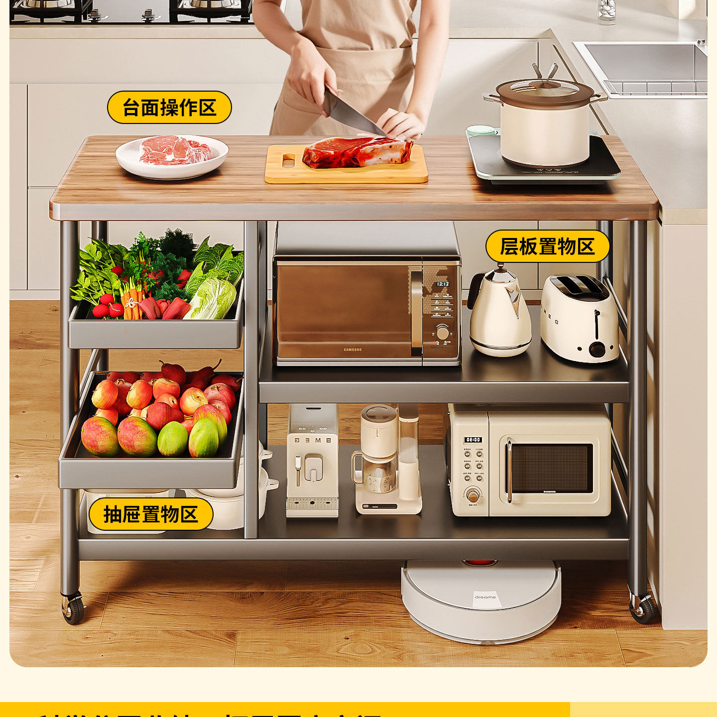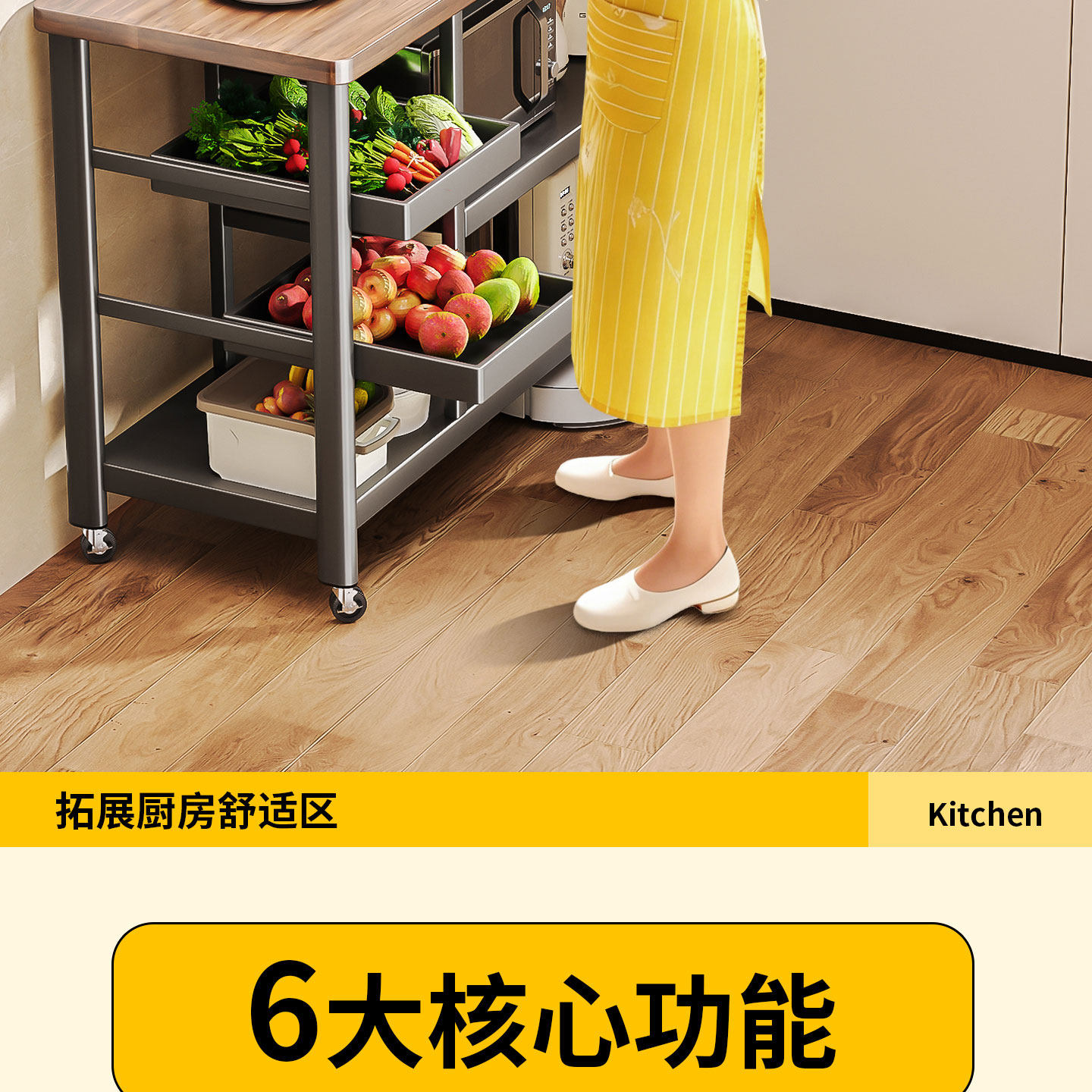 Kitchen Storage Rack, Floor-Standing, Household, Pull-Out, Multi-Functional, Microwave Oven, Fruit and Vegetable, Seasoning, Multi-Layer Sideboard Storage Rack