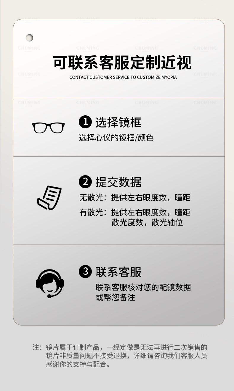 | Lens Refractive Index | Frame + 0 Degree Anti-Blue Light Lenses,Frame + Super Tough and Hardened 1.61 Anti-Blue Light Lenses [Myopia + Astigmatism ≤ 400 Degrees],Frame + Super Tough and Hardened 1.67 Anti-Blue Light Lenses [Myopia + Astigmatism ≤ 600 Degrees],Frame + Super Tough and Hardened 1.74 Anti-Blue Light Lenses [Myopia + Astigmatism ≤ 800 Degrees],Frame + Super Tough and Hardened 1.61 Radiation-Proof Lenses [Myopia + Astigmatism ≤ 400 Degrees],Frame + Super Tough and Hardened 1.67 Anti-Radiation Lenses [Myopia + Astigmatism ≤ 600 Degrees],Frame + Super Tough and Hardened 1.74 Radiation-Proof Lenses [Myopia + Astigmatism ≤ 800 Degrees],↓[Photochromic Lenses]↓Sun Protection and Uv Protection↓,With [Grey/Tea] 1.61 Anti-Blue Light and Ultraviolet Rays [Myopia + Astigmatism ≤ 400 Degrees],With [Grey/Tea] 1.67 Anti-Blue Light and Ultraviolet Rays [Myopia + Astigmatism ≤ 600 Degrees],↓[German Zeiss Series]↓Protect Your Vision, Lens Packaging Will Be Sent with You↓,Equipped with [Zeiss Special] 1.60 Aspherical [Myopia + Astigmatism ≤ 400 Degrees],Equipped with [Zeiss Special] 1.67 Aspheric [Myopia + Astigmatism ≤ 600 Degrees],Equipped with [Zeiss Special] 1.60 Anti-Blue Light [Myopia + Astigmatism ≤ 400 Degrees],Equipped with [Zeiss Special] 1.67 Anti-Blue Light [Myopia + Astigmatism ≤ 600 Degrees] |