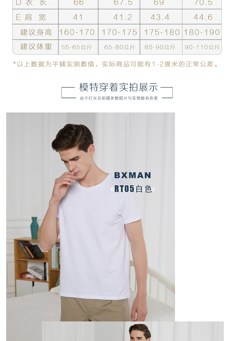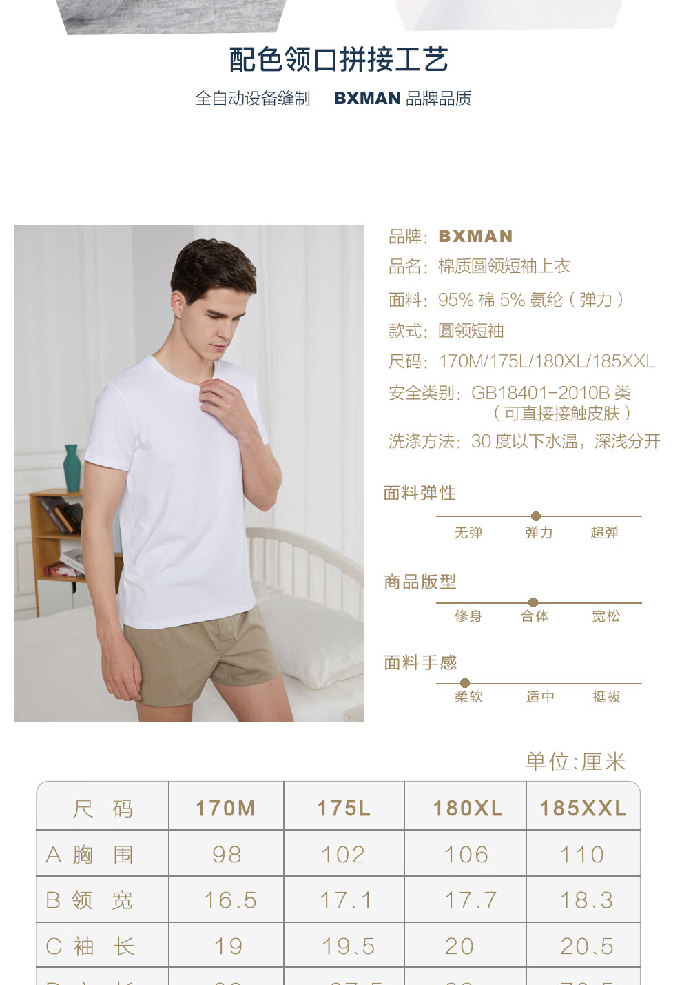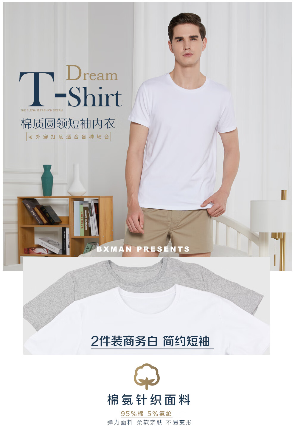 BXMAN autumn and winter short-sleeved men's underwear cotton base shirt spandex stretch crew neck shirt comfortable 2-piece white 175L