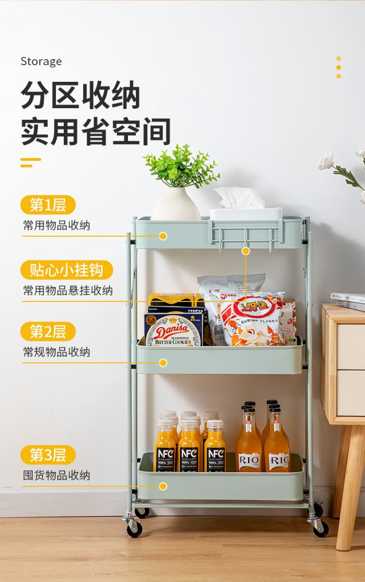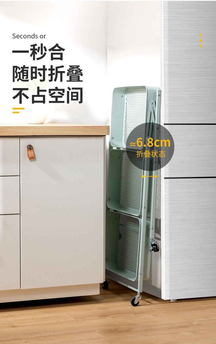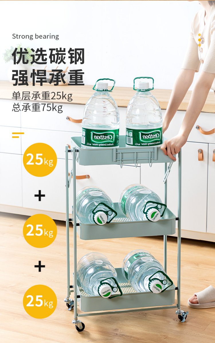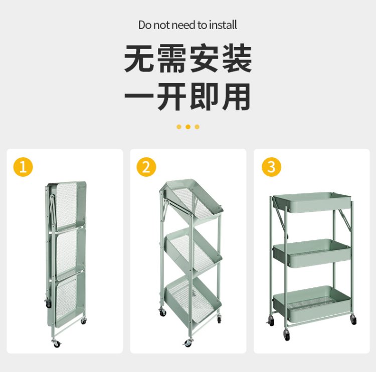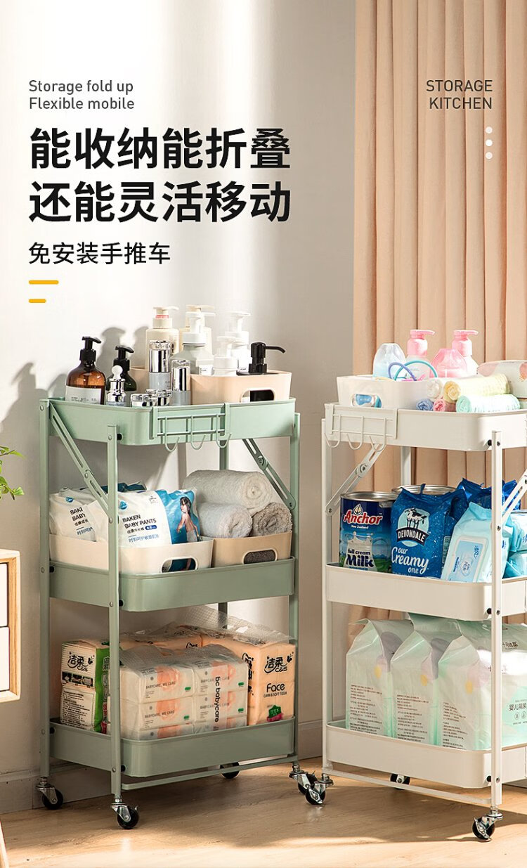 Chuidahuang three-layer storage rack, installation-free folding storage cart, multi-functional shelf storage rack, floor-standing rack, light green
