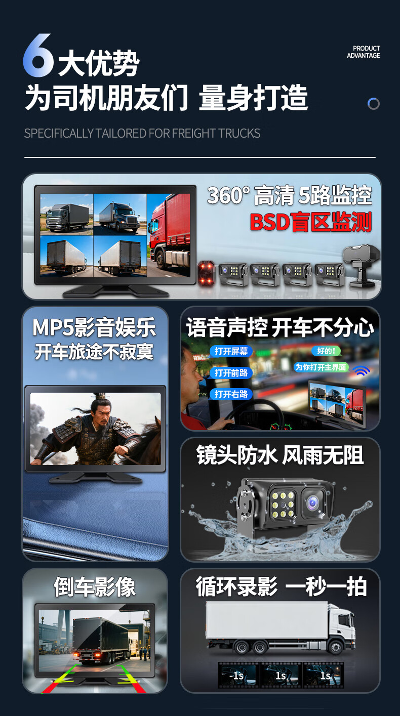 Yuba truck special reversing image 24v high-definition night vision five-way driving recorder sound and light alarm reversing radar
