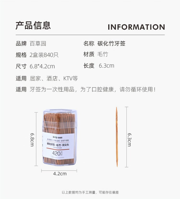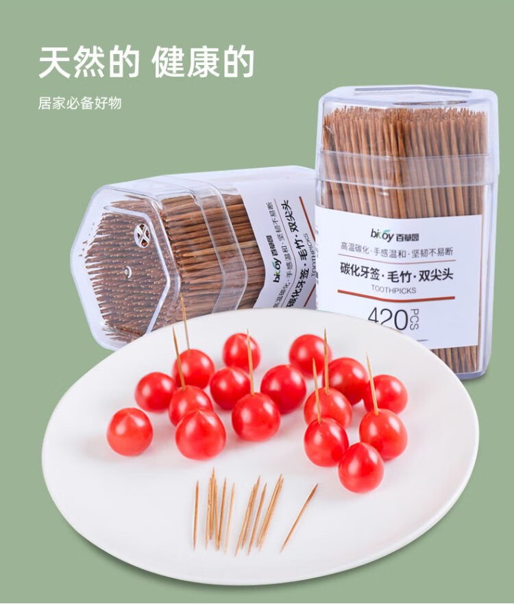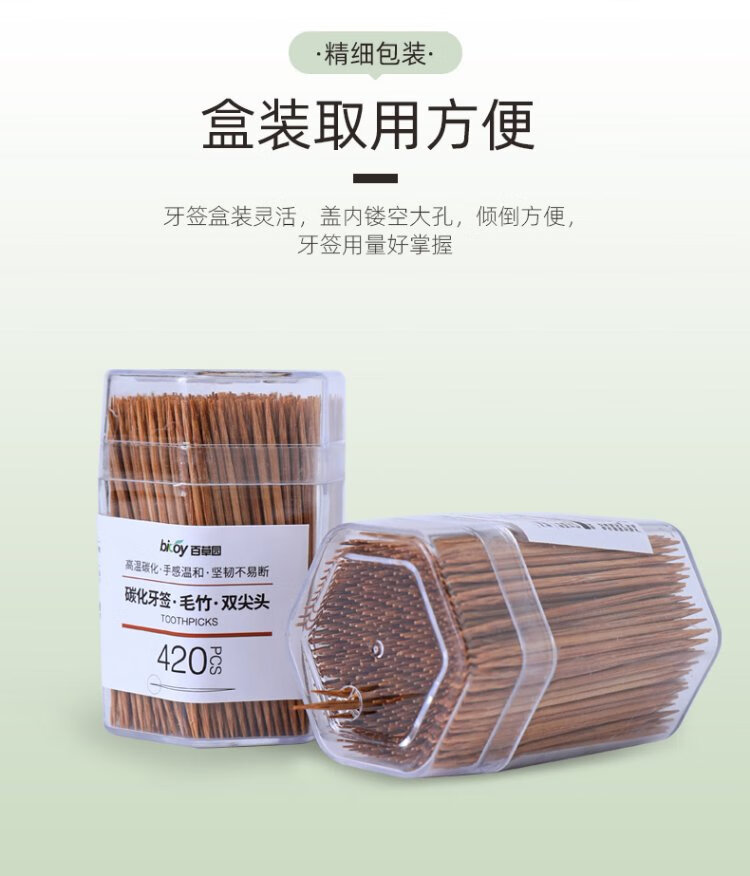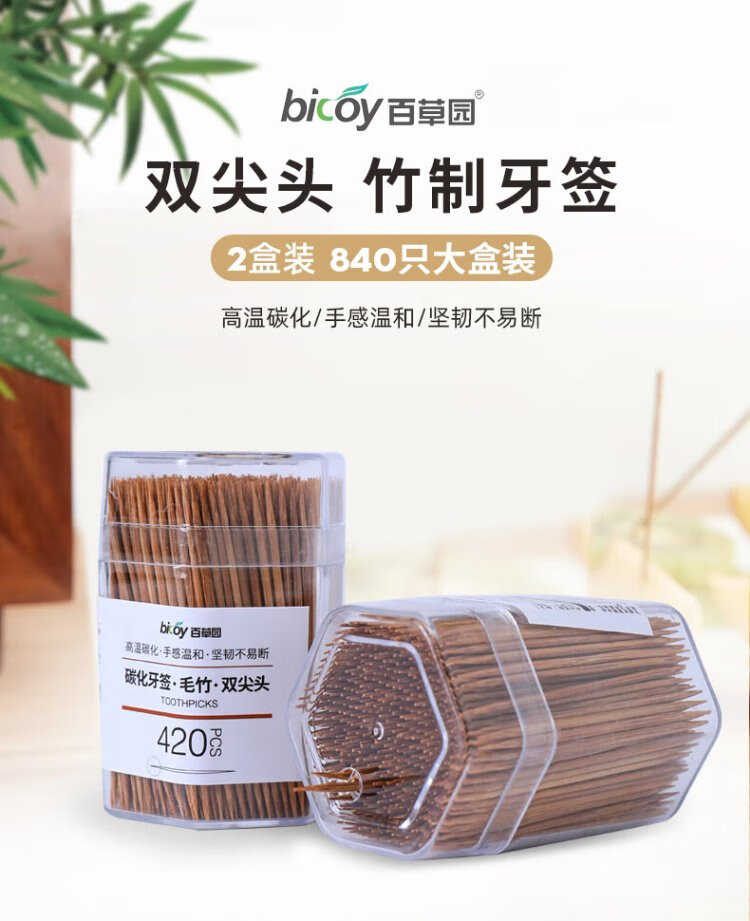 Baicaoyuan disposable carbonized bamboo toothpicks 2 tubes 840 pieces household boxed environmentally friendly and hygienic independent canned hotel toothpicks