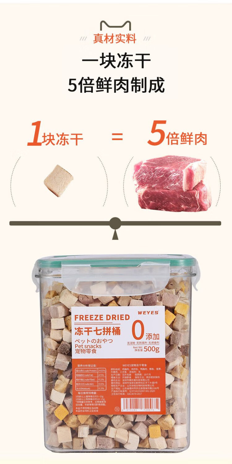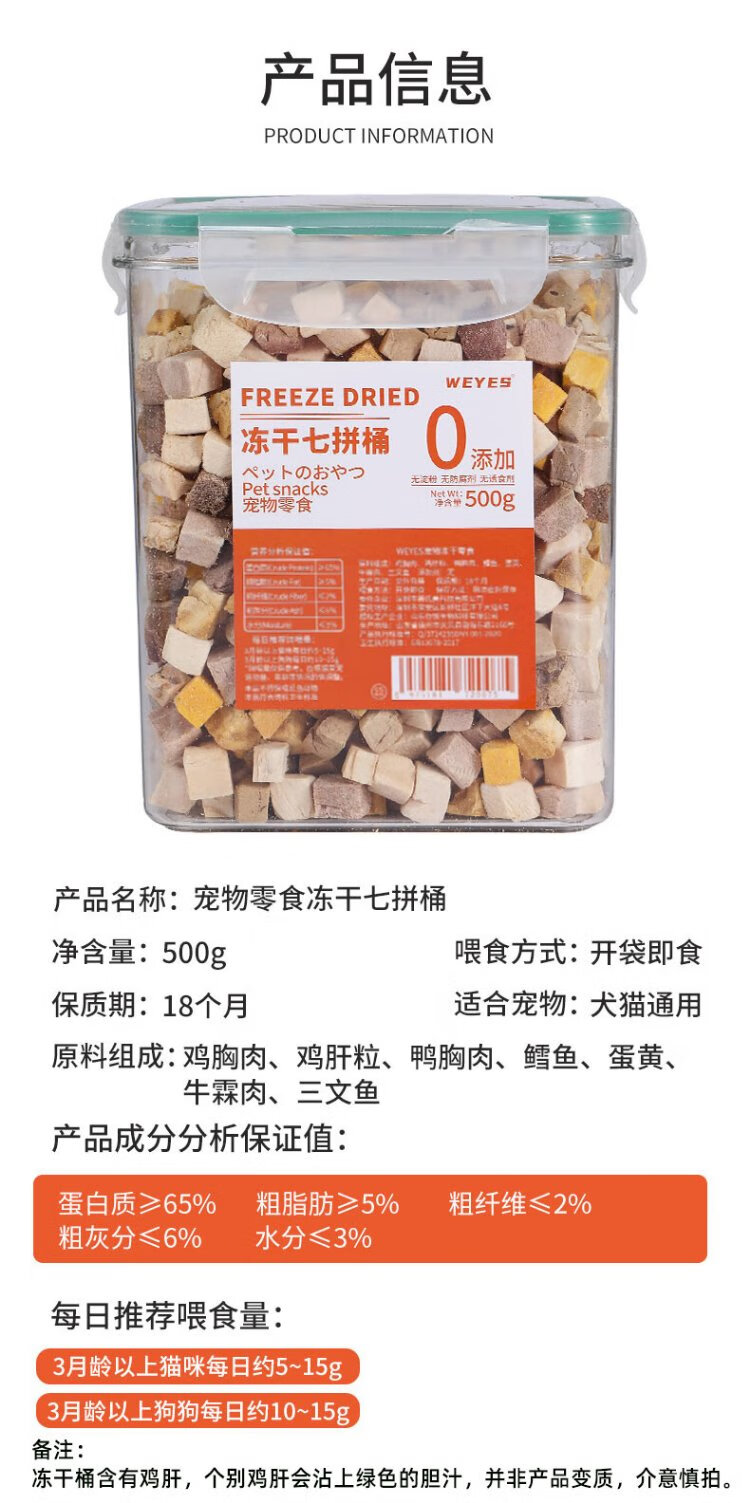 WEYES freeze-dried 7-pack mixing barrel 500g pet cat and dog snacks freeze-dried chicken breast duck meat grains nutritional hair gills