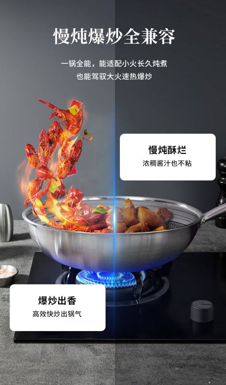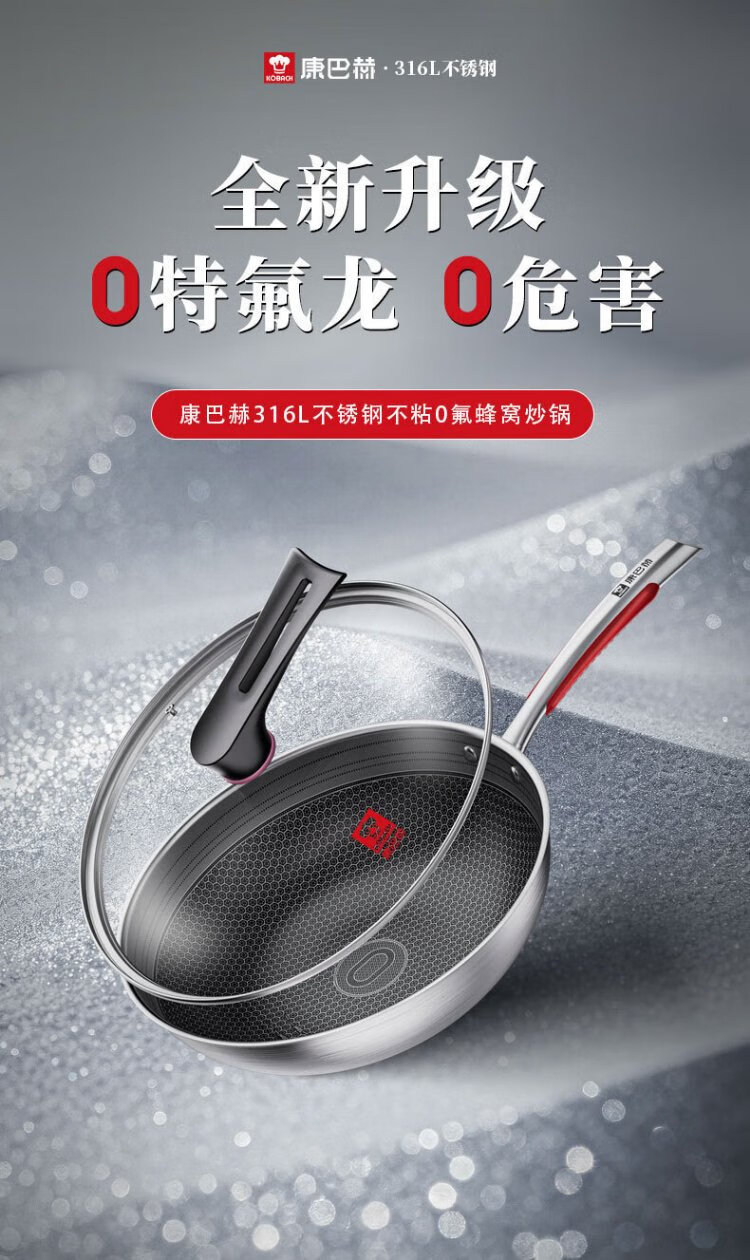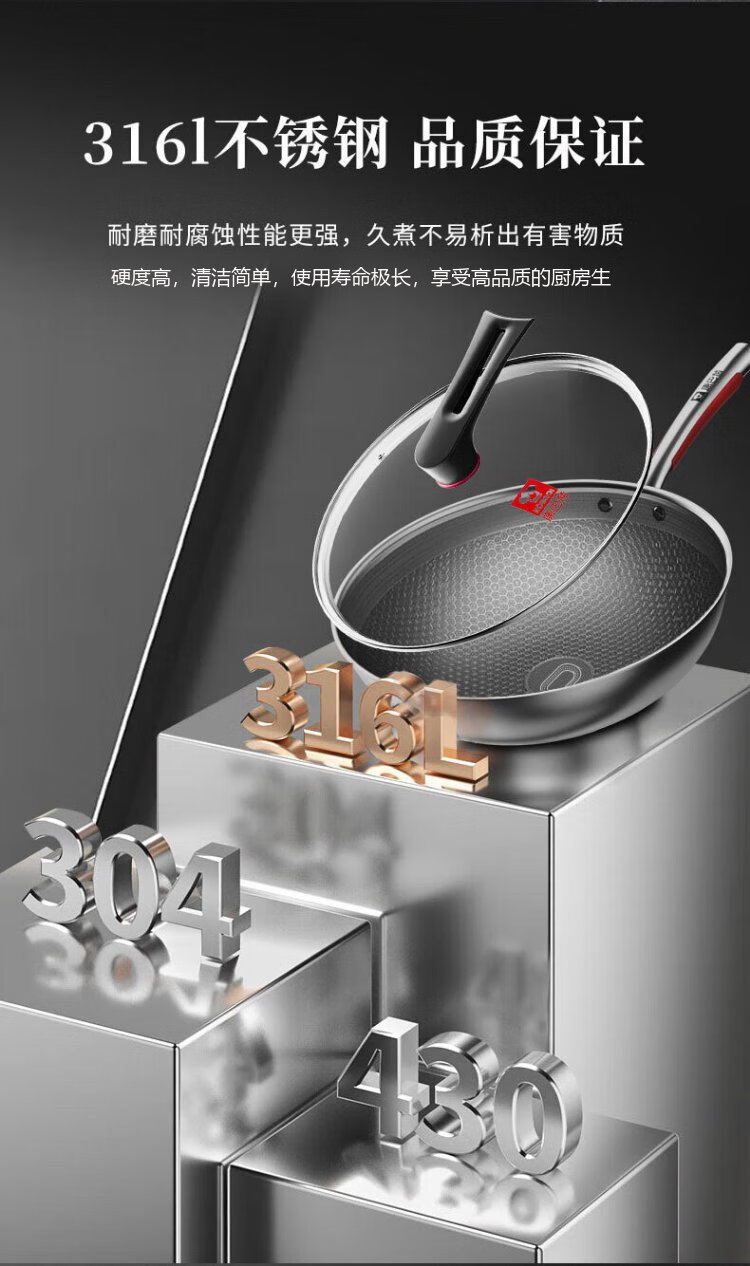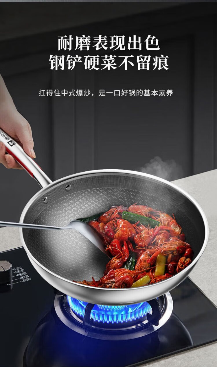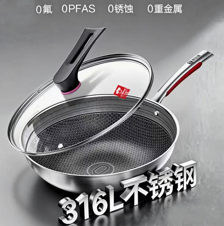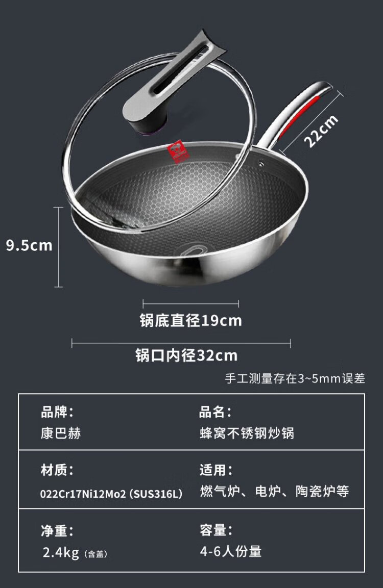 Kangbach wok non-stick pan 316L stainless steel wok 32cm honeycomb flat-bottomed frying pan induction cooker gas stove universal