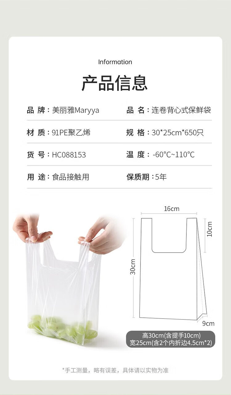 Meiya disposable rolled vest-style fresh-keeping bags 30*25 cm, 650 pieces, food-grade thickened and durable packaging bags